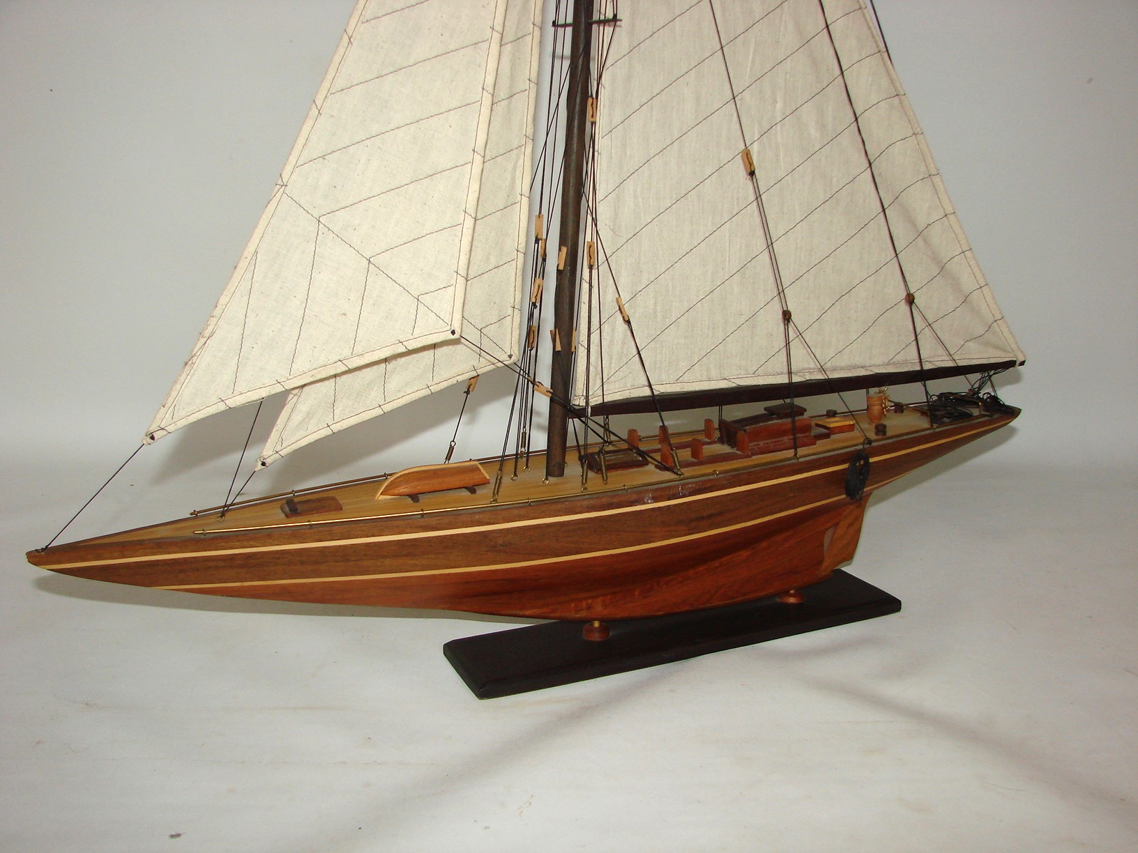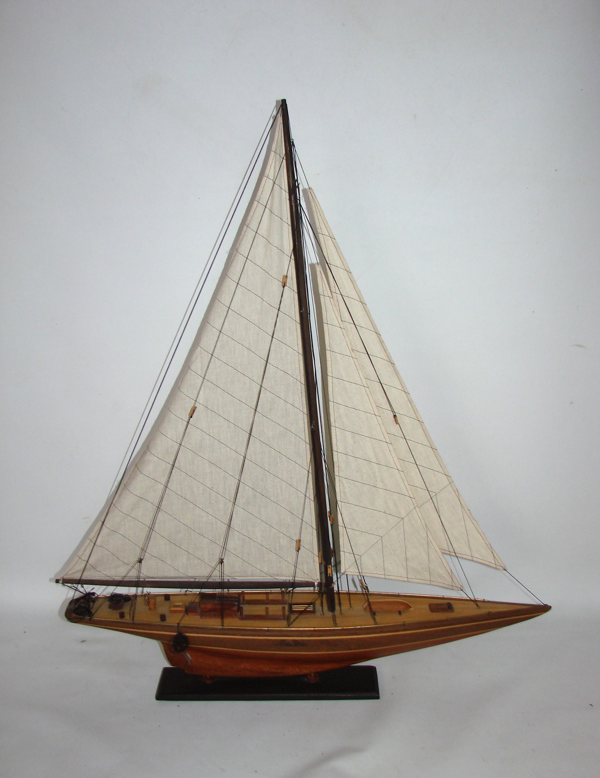 Drewniany model jachtu. Ten model jachtu j-class został wykonany z wysokiej jakości materiałów, z wykorzystaniem drewna, co nadaje mu solidności i trwałości. Każdy detal jest precyzyjnie wykonany, aby zapewnić realistyczny wygląd.