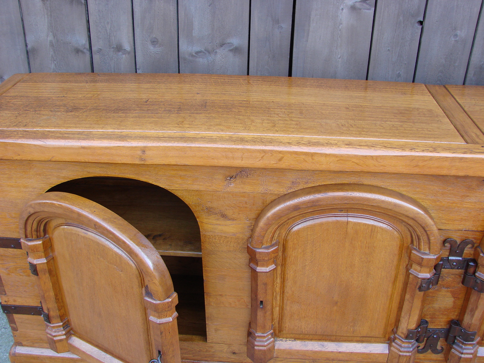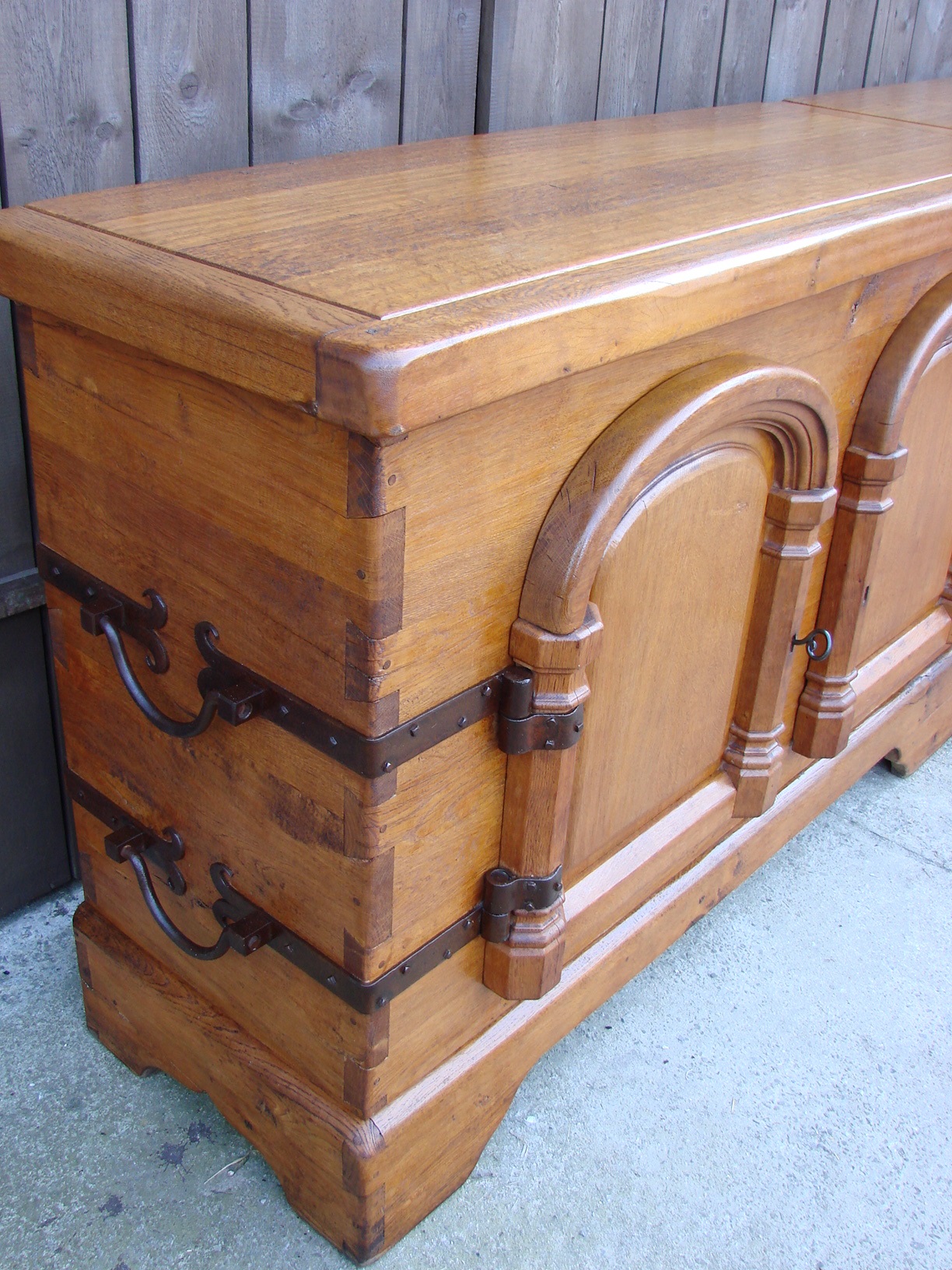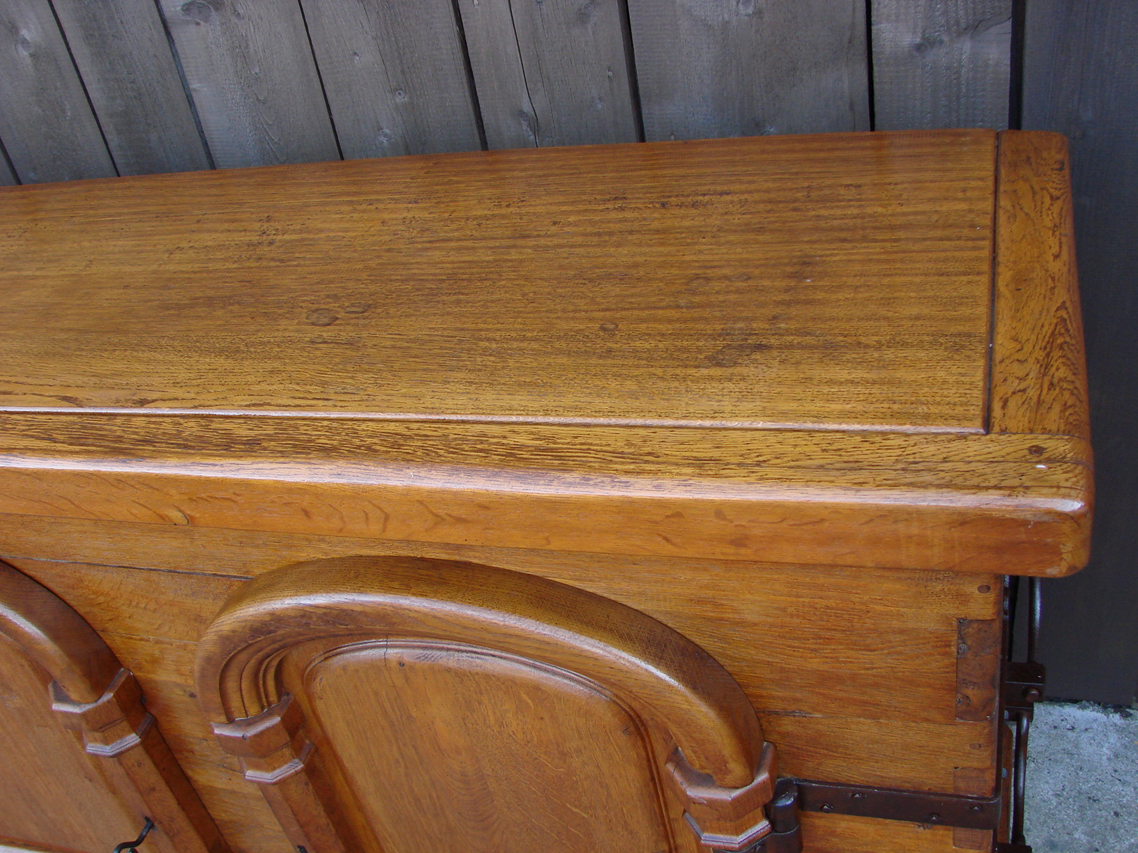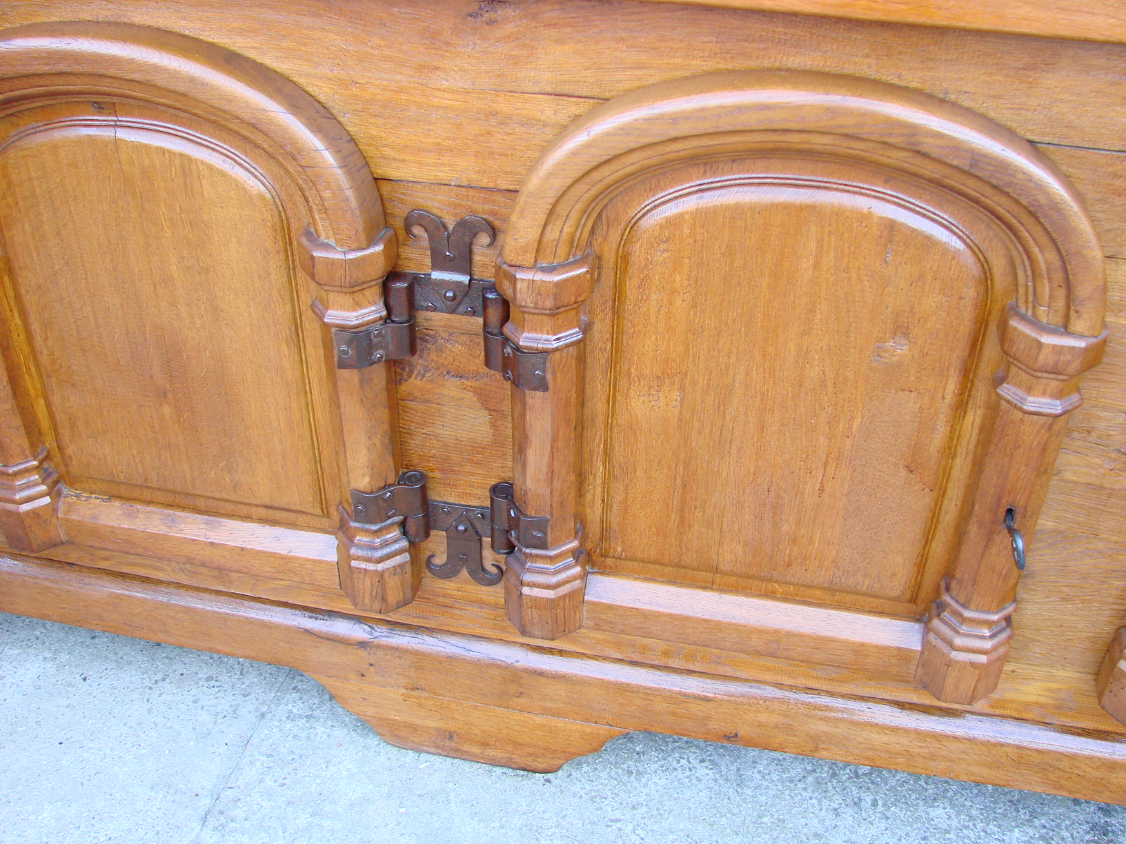 Imponująca komoda z lat 50. XX wieku, wykonana w całości z litego drewna dębowego. Mebel wykończony ręcznie kutymi zawiasami i okuciami, z tradycyjnymi łączeniami na drewniane kołki, co świadczy o wysokiej jakości rzemiosła.