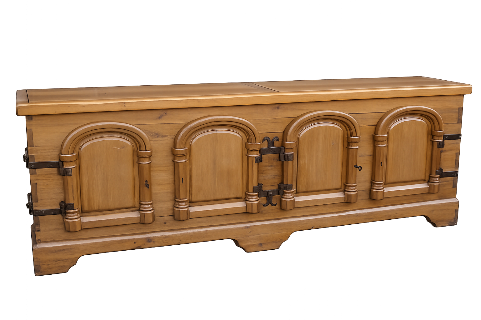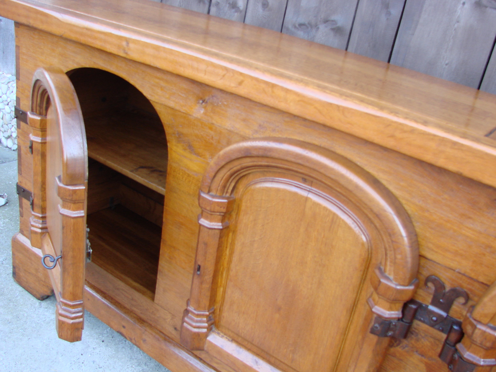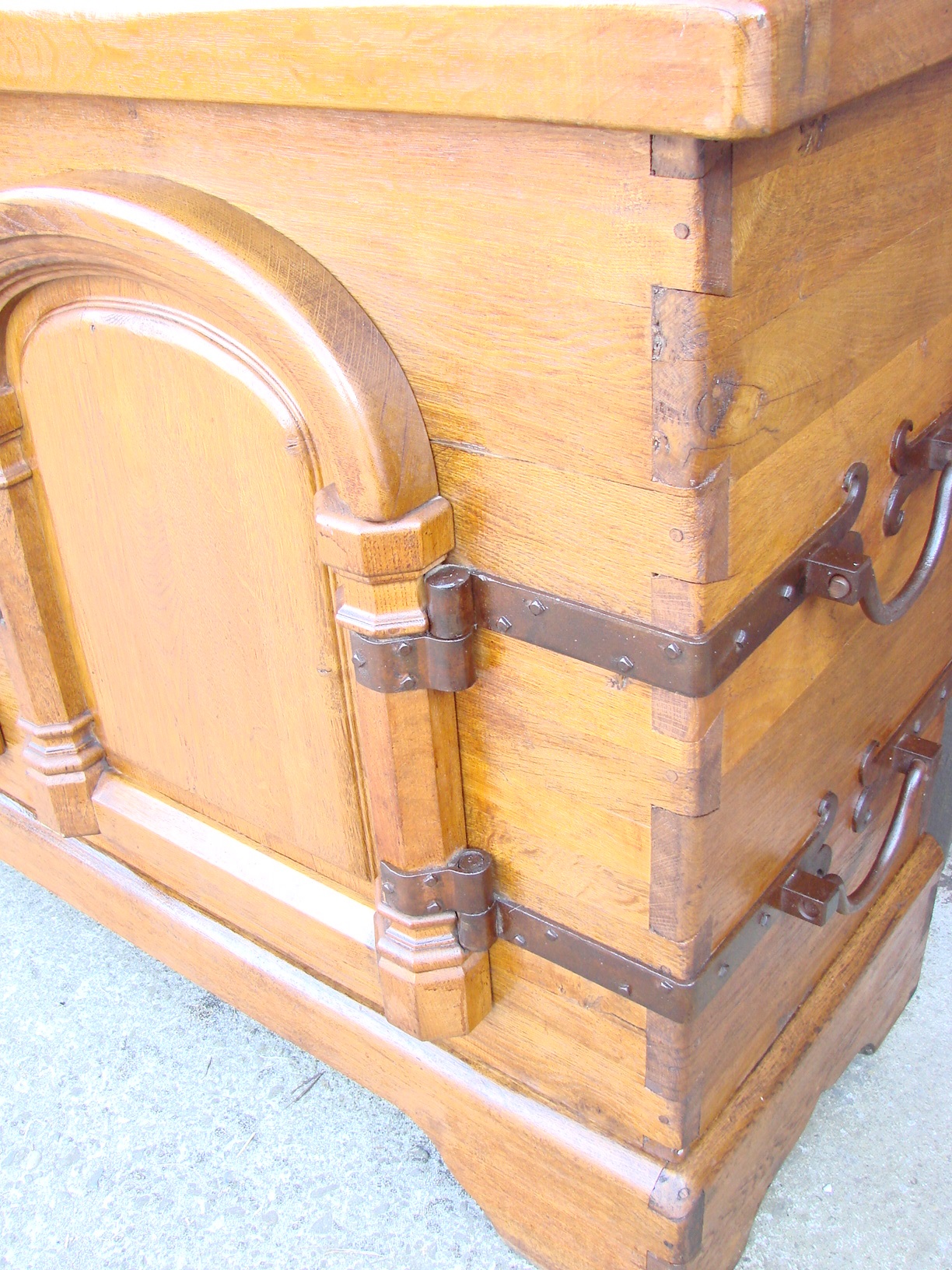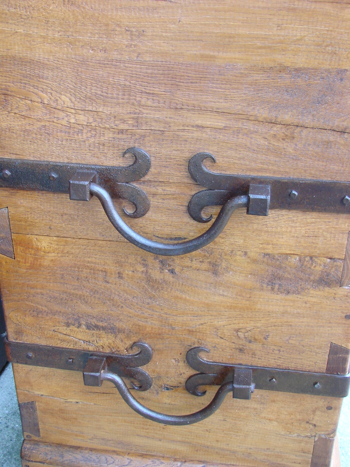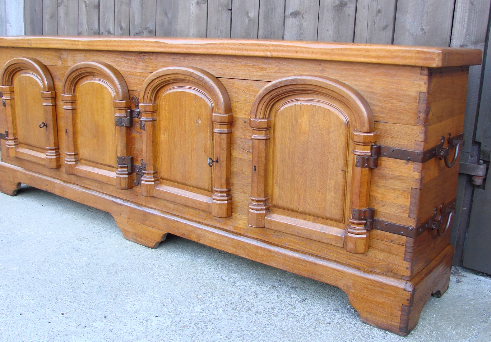 Imponująca komoda z lat 50. XX wieku, wykonana w całości z litego drewna dębowego. Mebel wykończony ręcznie kutymi zawiasami i okuciami, z tradycyjnymi łączeniami na drewniane kołki, co świadczy o wysokiej jakości rzemiosła.