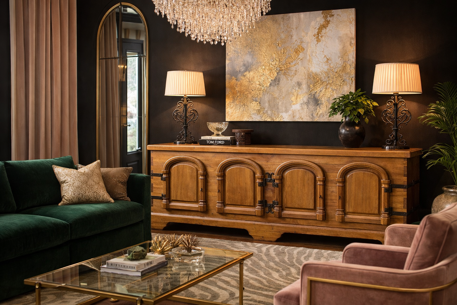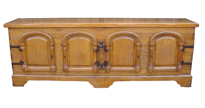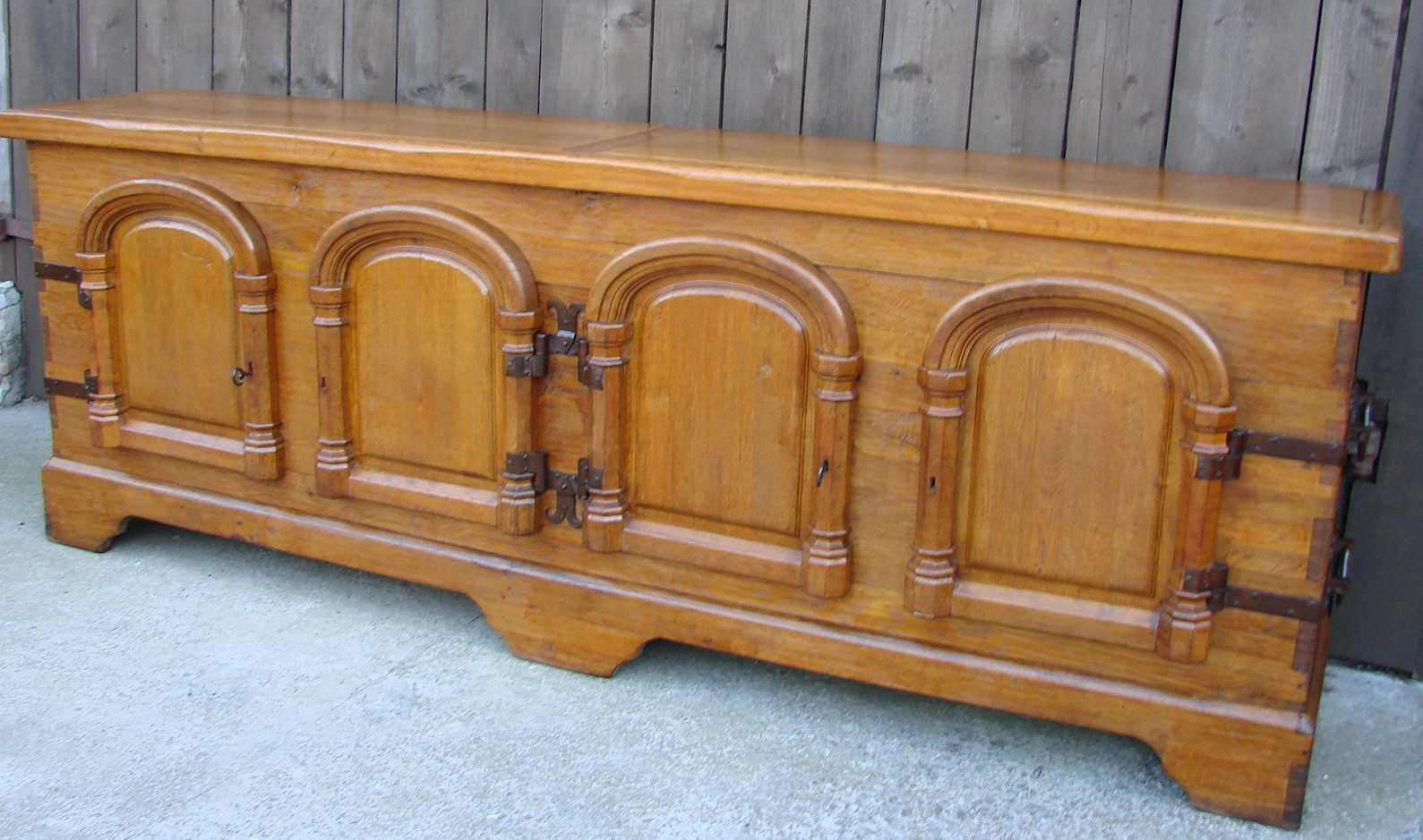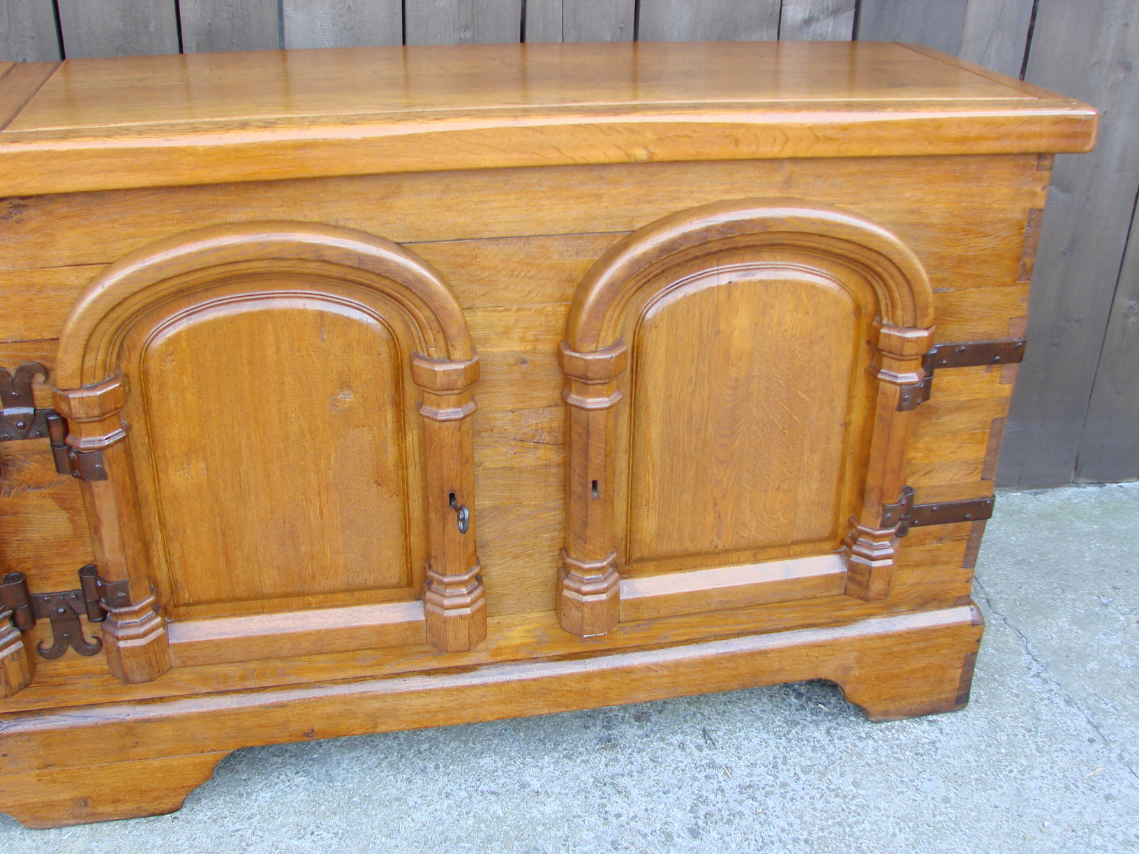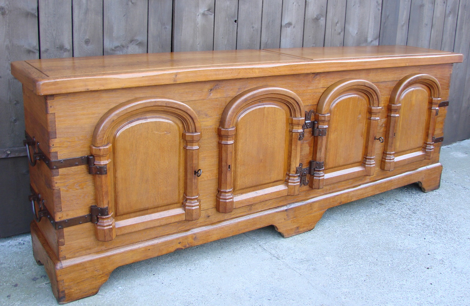 Imponująca komoda z lat 50. XX wieku, wykonana w całości z litego drewna dębowego. Mebel wykończony ręcznie kutymi zawiasami i okuciami, z tradycyjnymi łączeniami na drewniane kołki, co świadczy o wysokiej jakości rzemiosła.