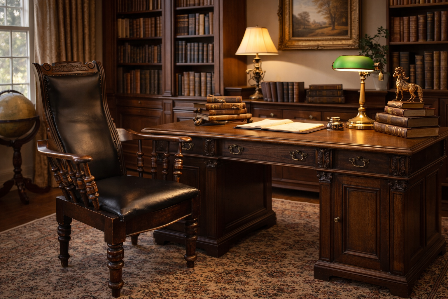 Siedzisko i oparcie tapicerowane są naturalną czarną skórą, która nadaje meblowi szlachetnego, ponadczasowego charakteru oraz zapewnia wysoki komfort użytkowania. Stabilna konstrukcja oraz ergonomiczna forma sprawiają, że fotel jest wygodny i reprezentacyjny.