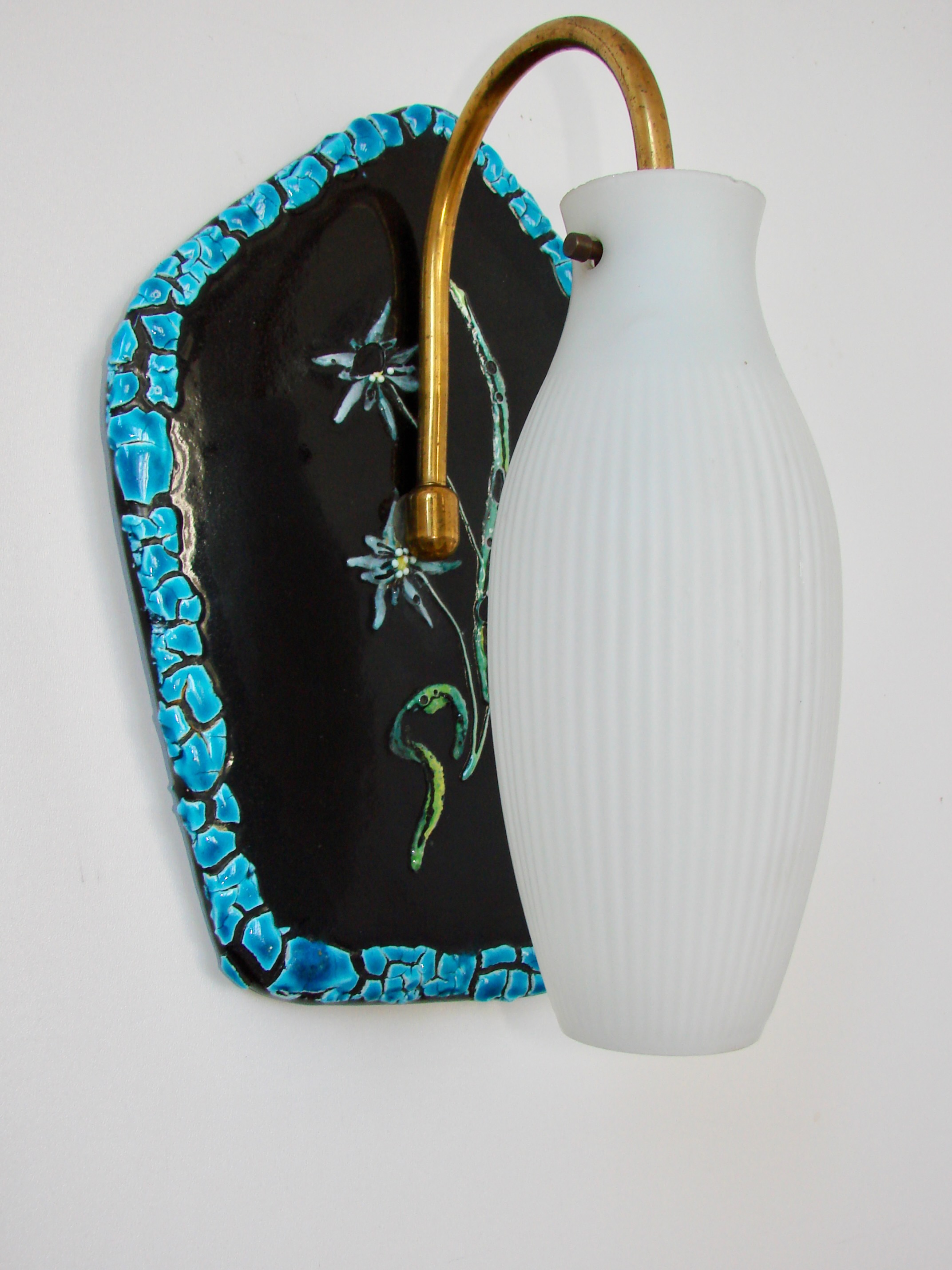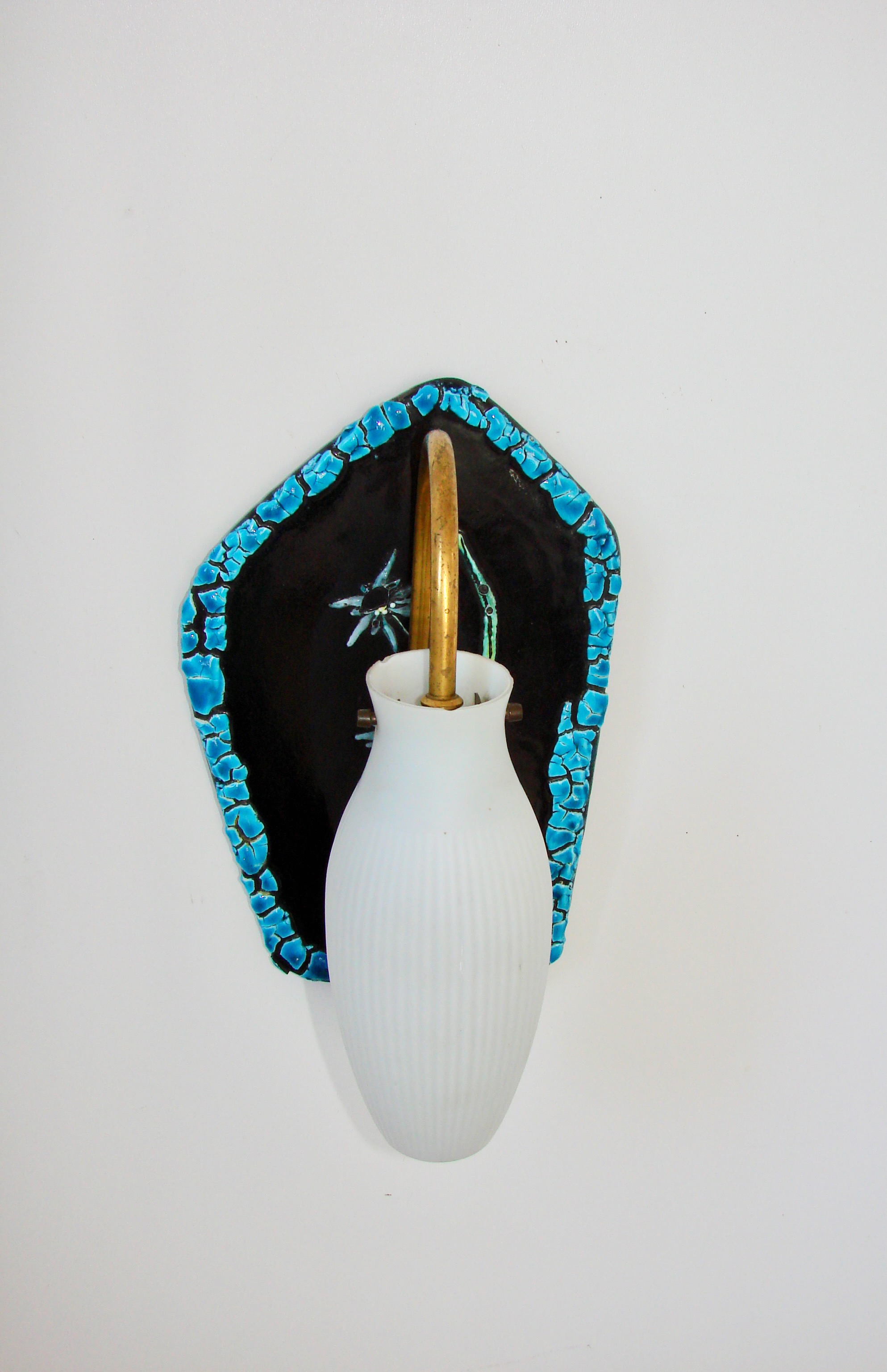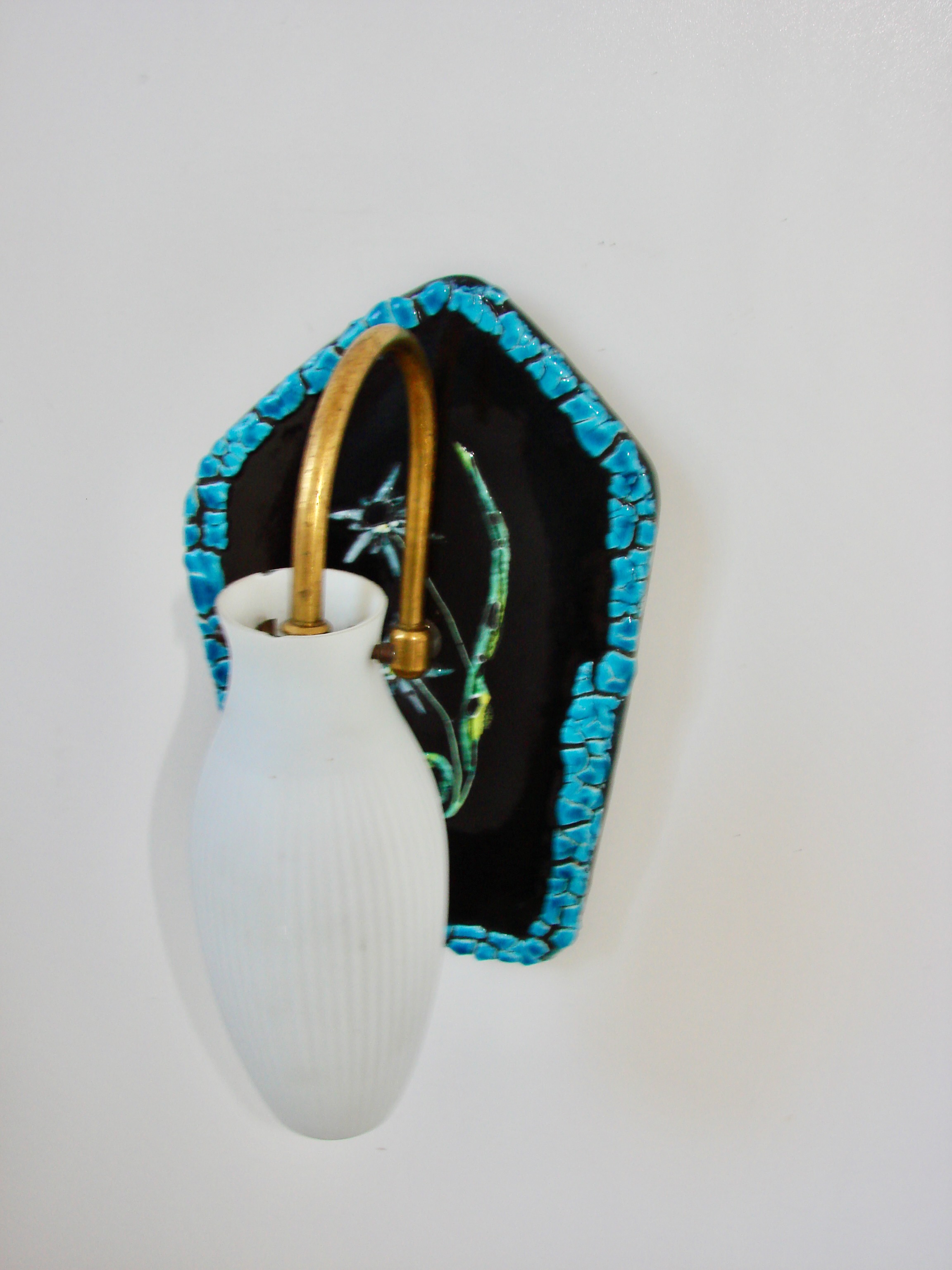 Ceramiczny kinkiet ścienny z lat 60., o prostej, modernistycznej formie charakterystycznej dla designu powojennego.