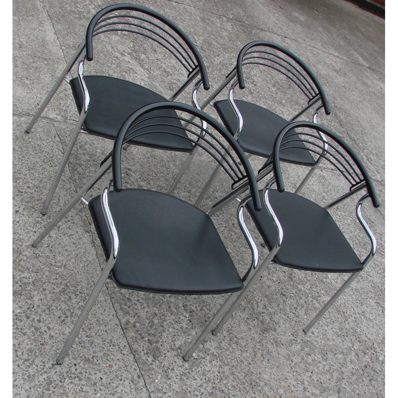 Komplet włoskich krzeseł z lat 80 to propozycja dla osób ceniących eleganckie wzornictwo i wysoką jakość wykonania. Konstrukcja została wykonana ze stali chromowanej, która nadaje meblom lekkości, trwałości i nowoczesnego charakteru. Siedziska wykonano z naturalnej skóry, co zapewnia komfort użytkowania oraz luksusowy wygląd.