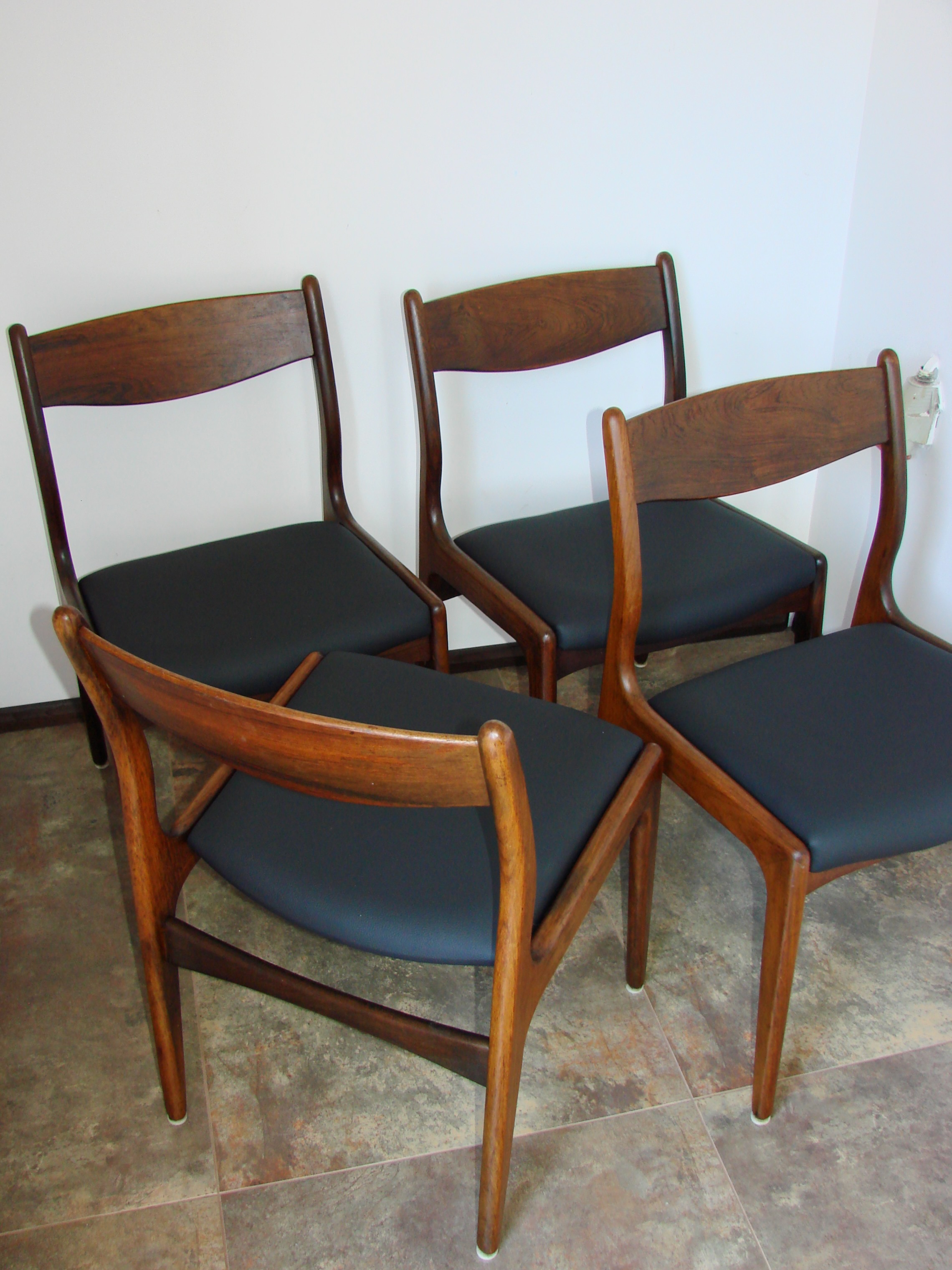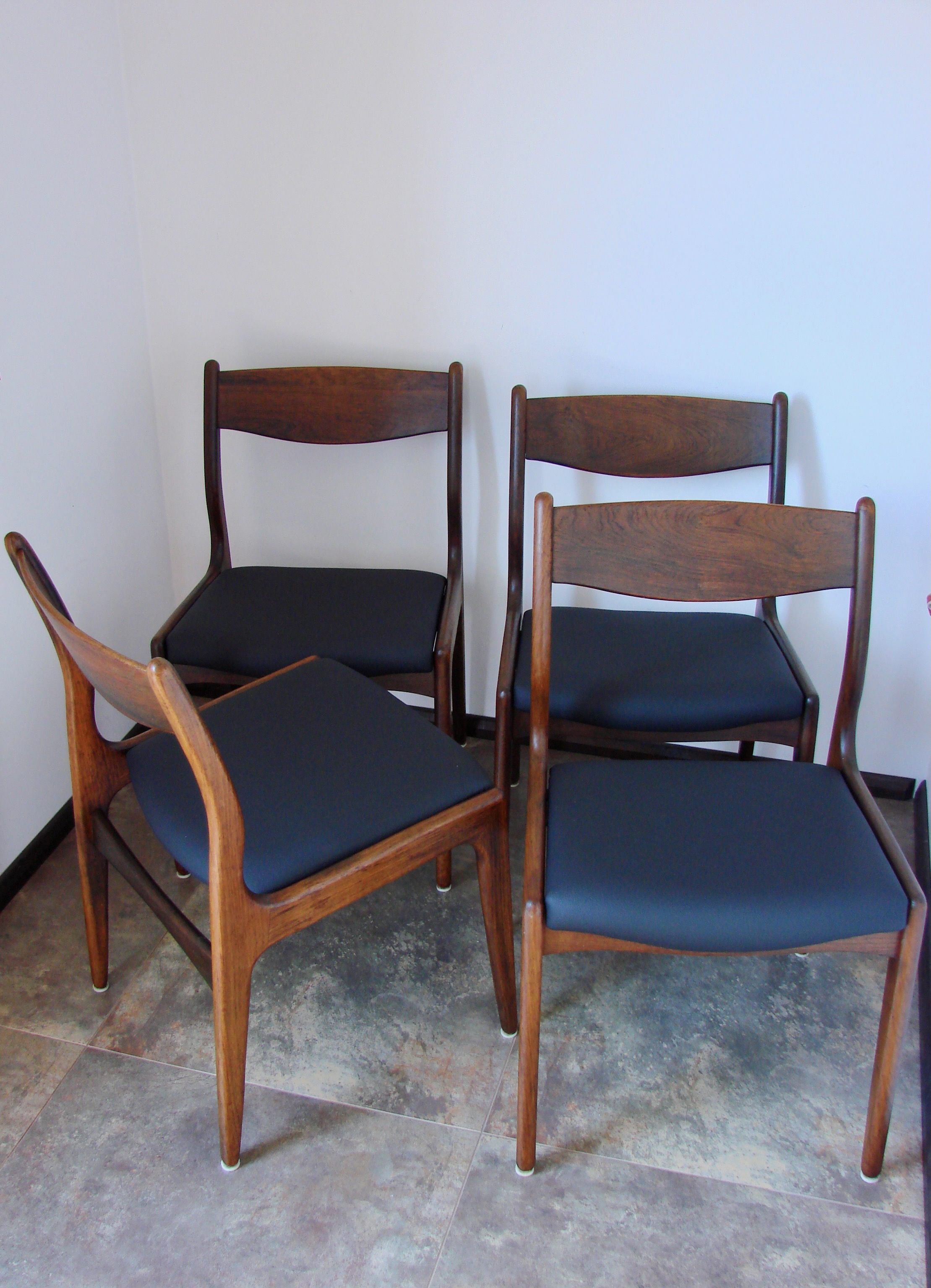 Konstrukcja wykonana z wysokiej jakości palisandru nadaje całości szlachetny i ciepły wygląd. Krzesła przeszły odświeżenie – tapicerka została wymieniona na nową eko skórę, w kolorze czarnym dzięki czemu są gotowe do codziennego użytkowania bez dodatkowych nakładów.