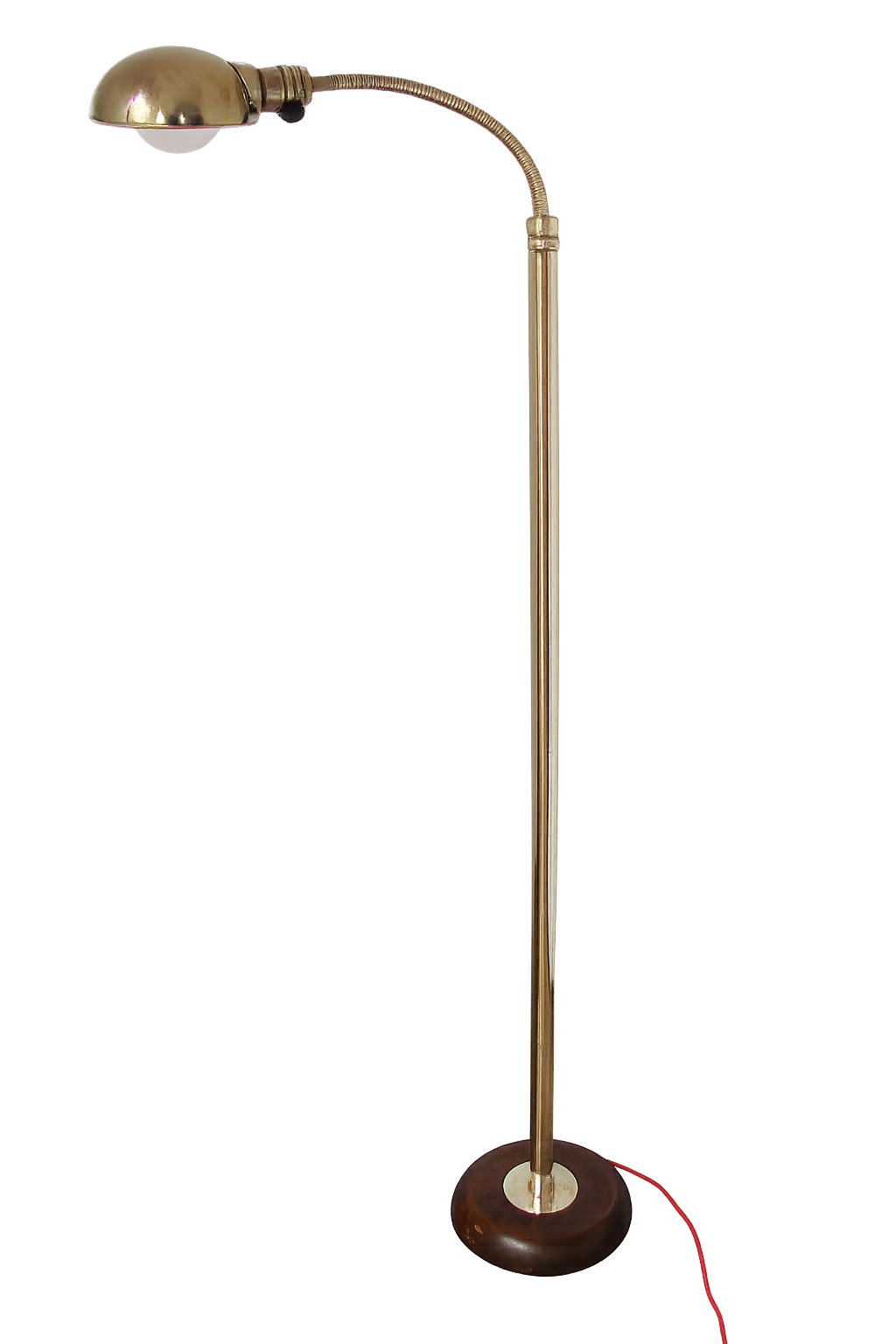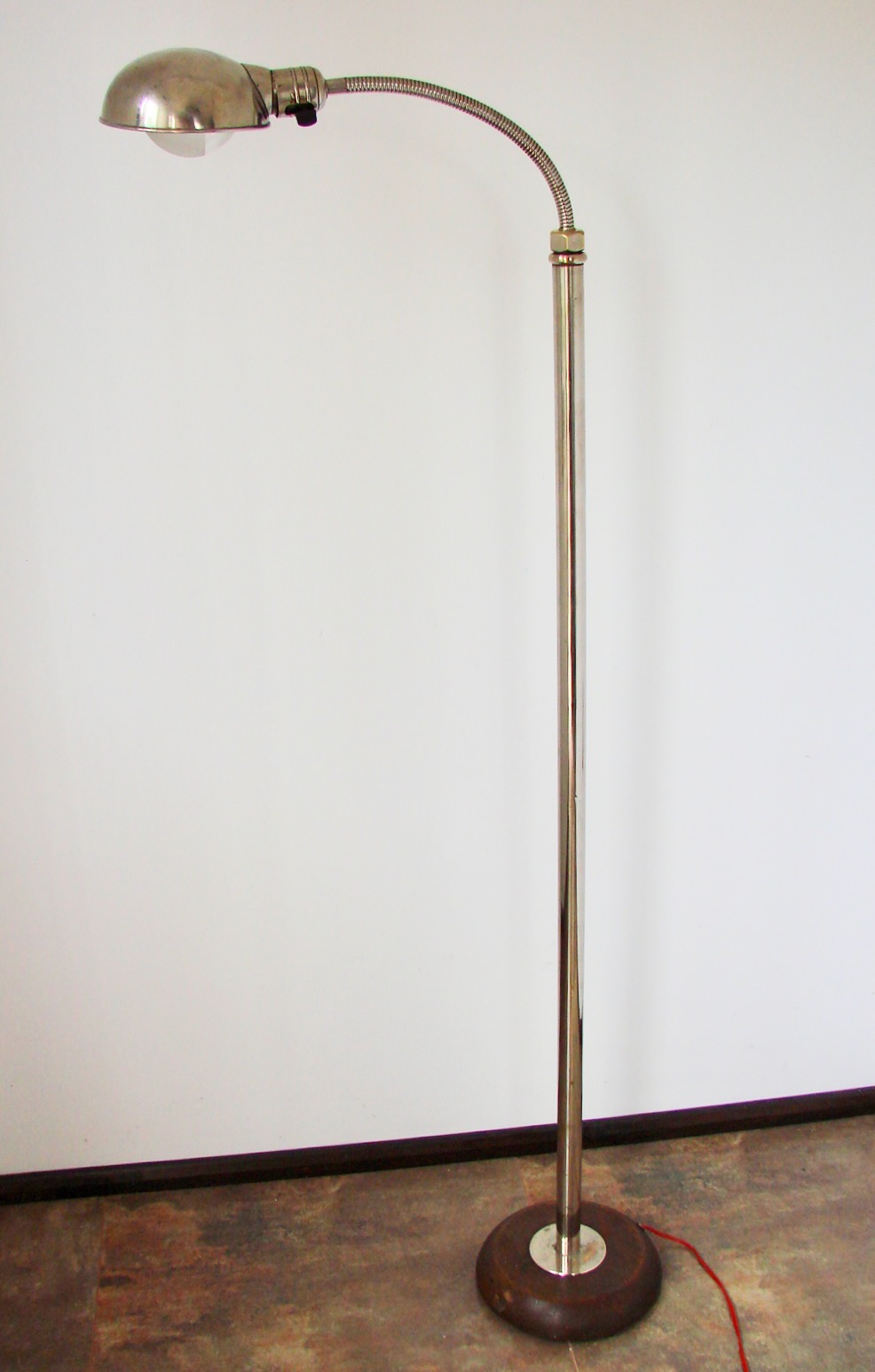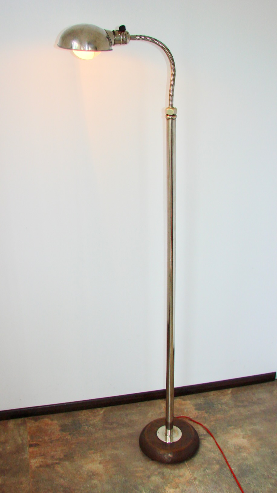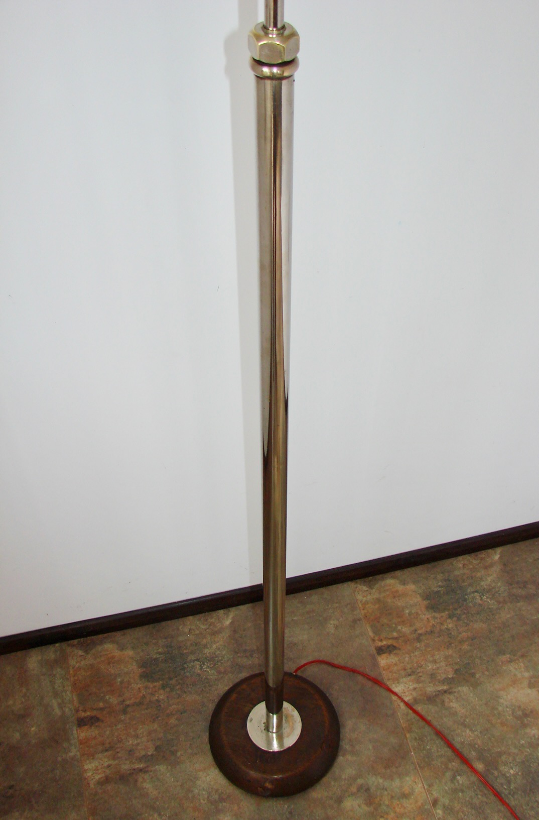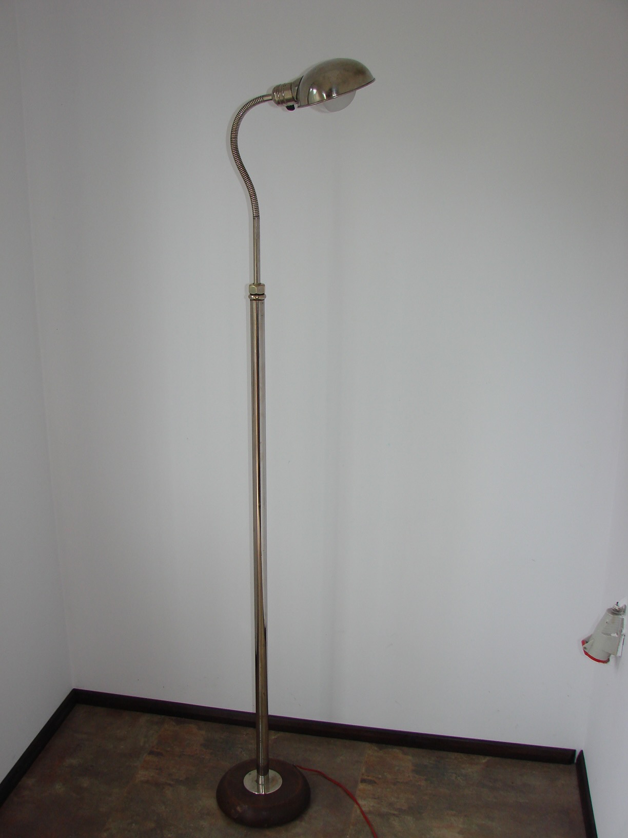 Stylowa lampa podłogowa z okresu Art Deco, wykonana w latach 30. XX wieku w duchu niemieckiego modernizmu Bauhaus. Wykonana z mosiądzu niklowanego, zachowała się w bardzo dobrym, oryginalnym stanie.