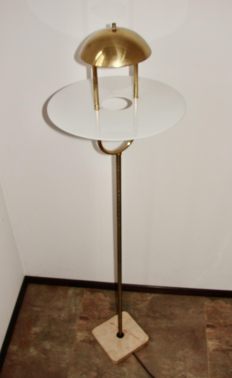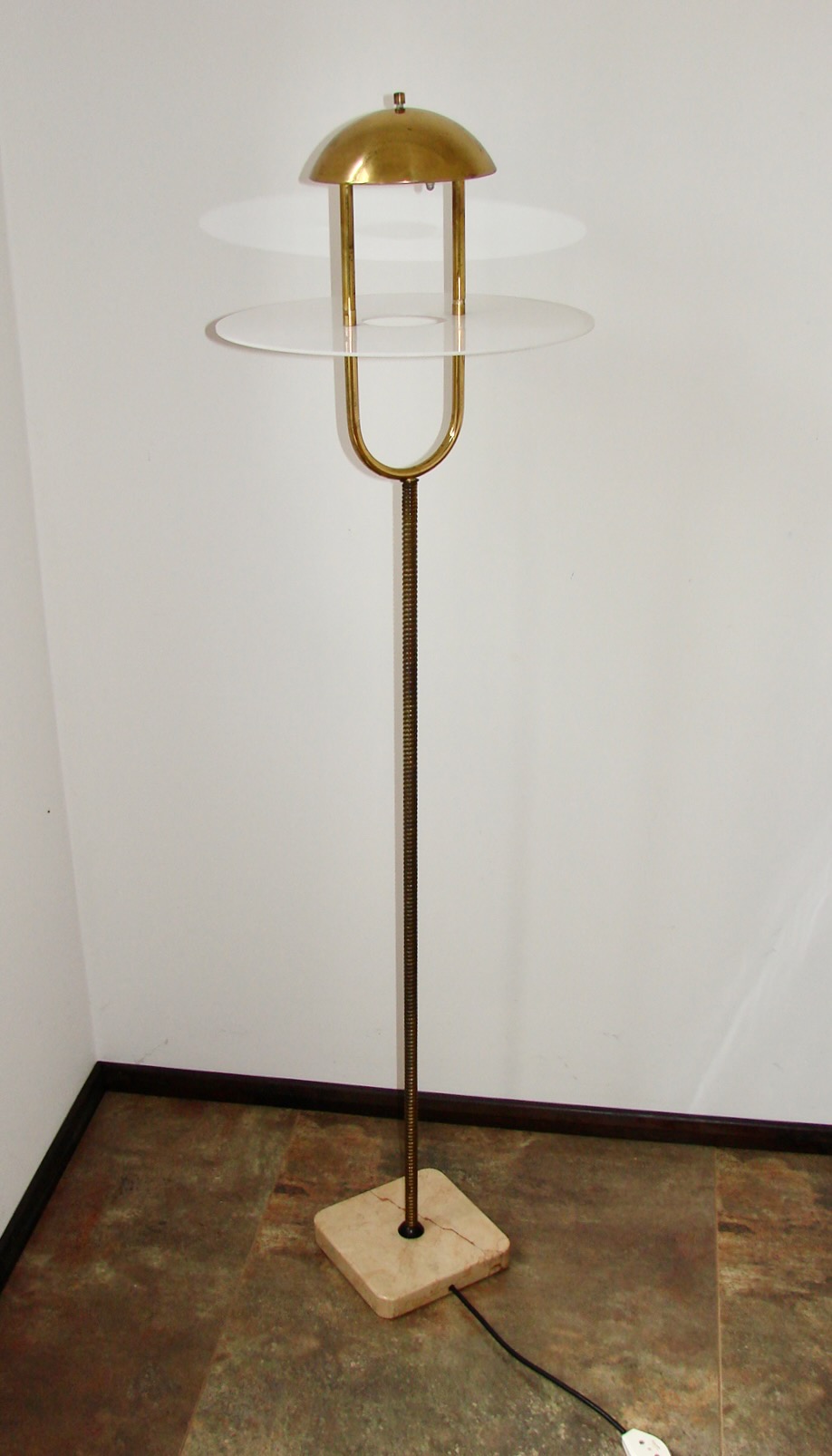 Oryginalna lampa podłogowa z lat 70. to przykład ponadczasowego designu vintage. Konstrukcja łączy w sobie mosiądz, tworzywo sztuczne oraz solidną podstawę z naturalnego kamienia. Klosz o futurystycznej formie doskonale wpisuje się w estetykę retro i styl mid-century modern.