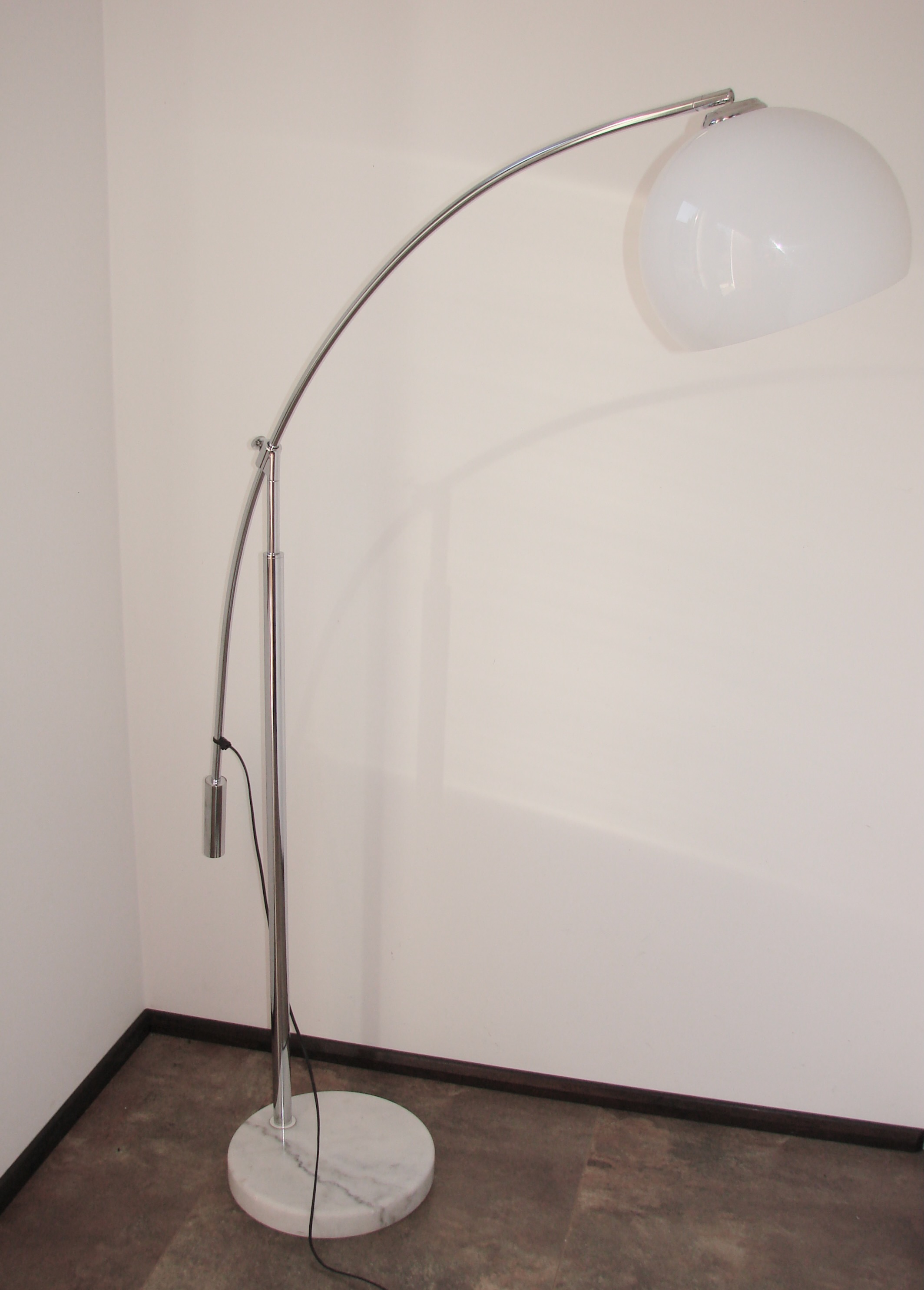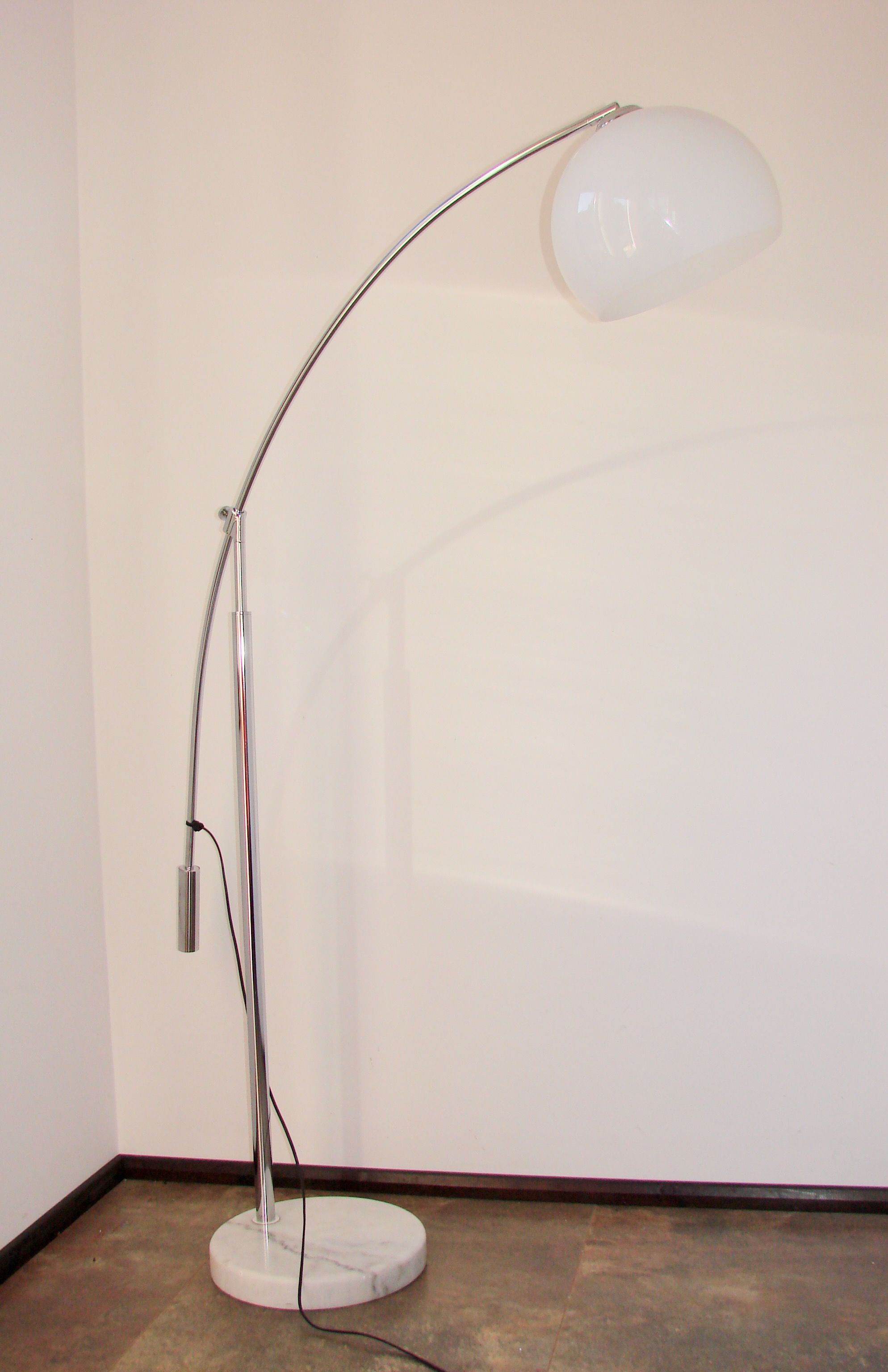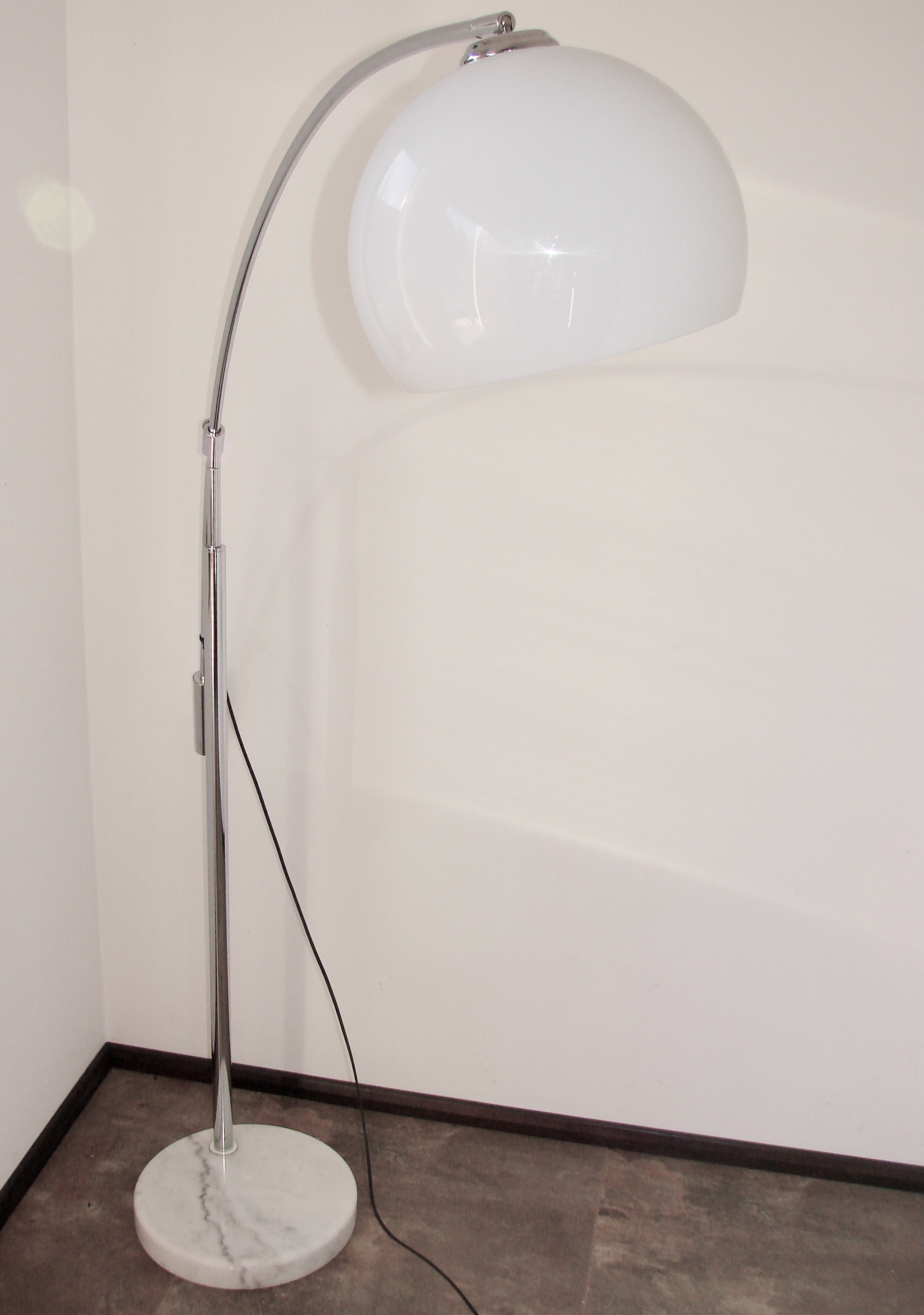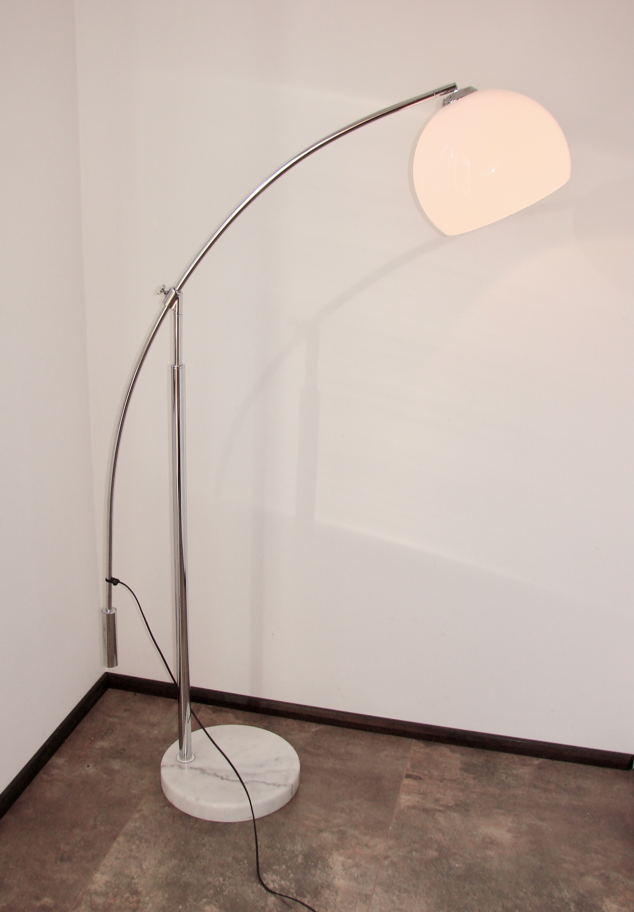 Oryginalna lampa podłogowa z lat 90., wykonana z chromowanego metalu. Model osadzony jest na ciężkiej, stabilnej podstawie z marmuru, która zapewnia solidność i elegancki wygląd. Klosz wykonano z tworzywa, co pozwala na równomierne rozproszenie światła.
