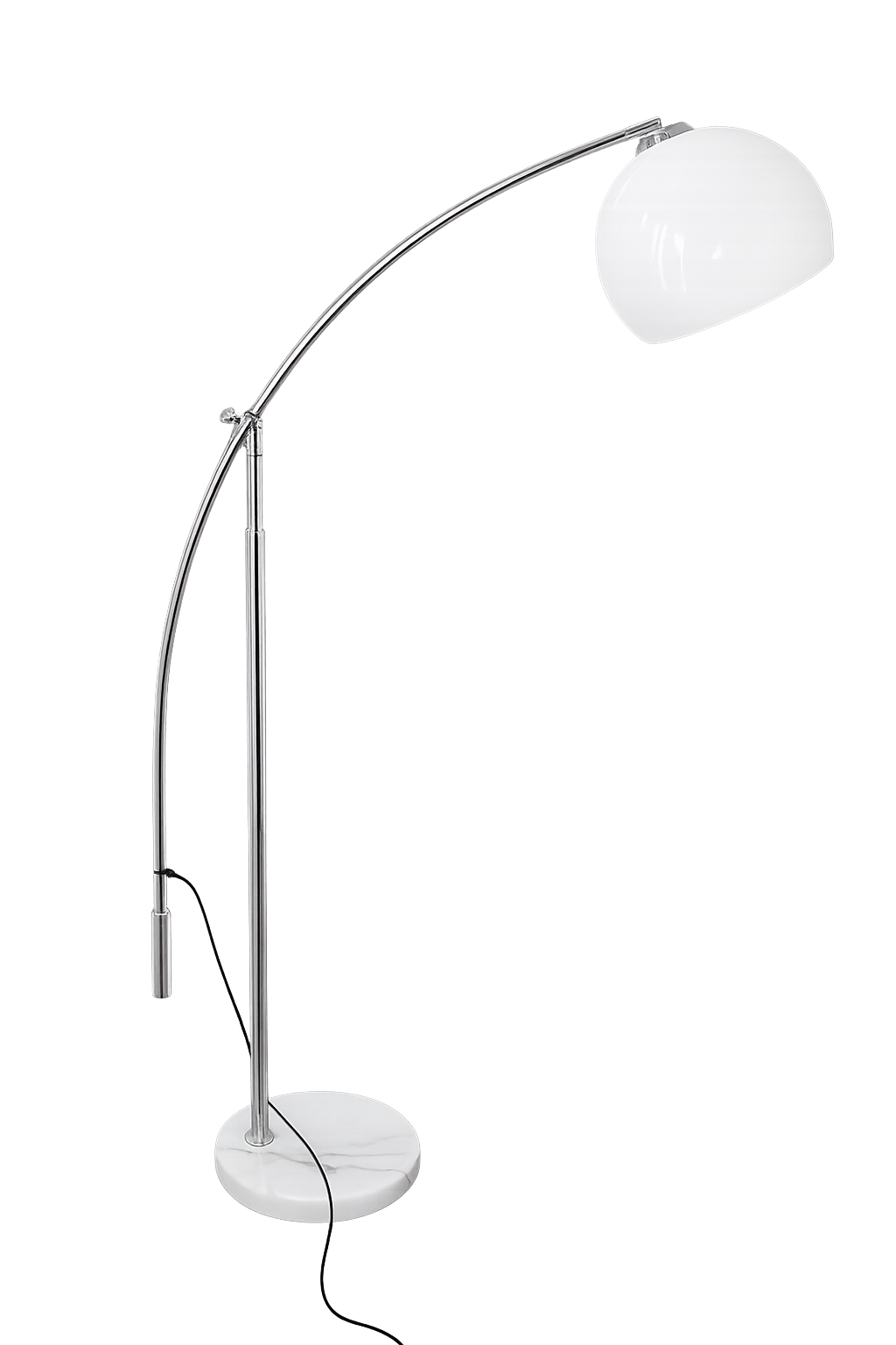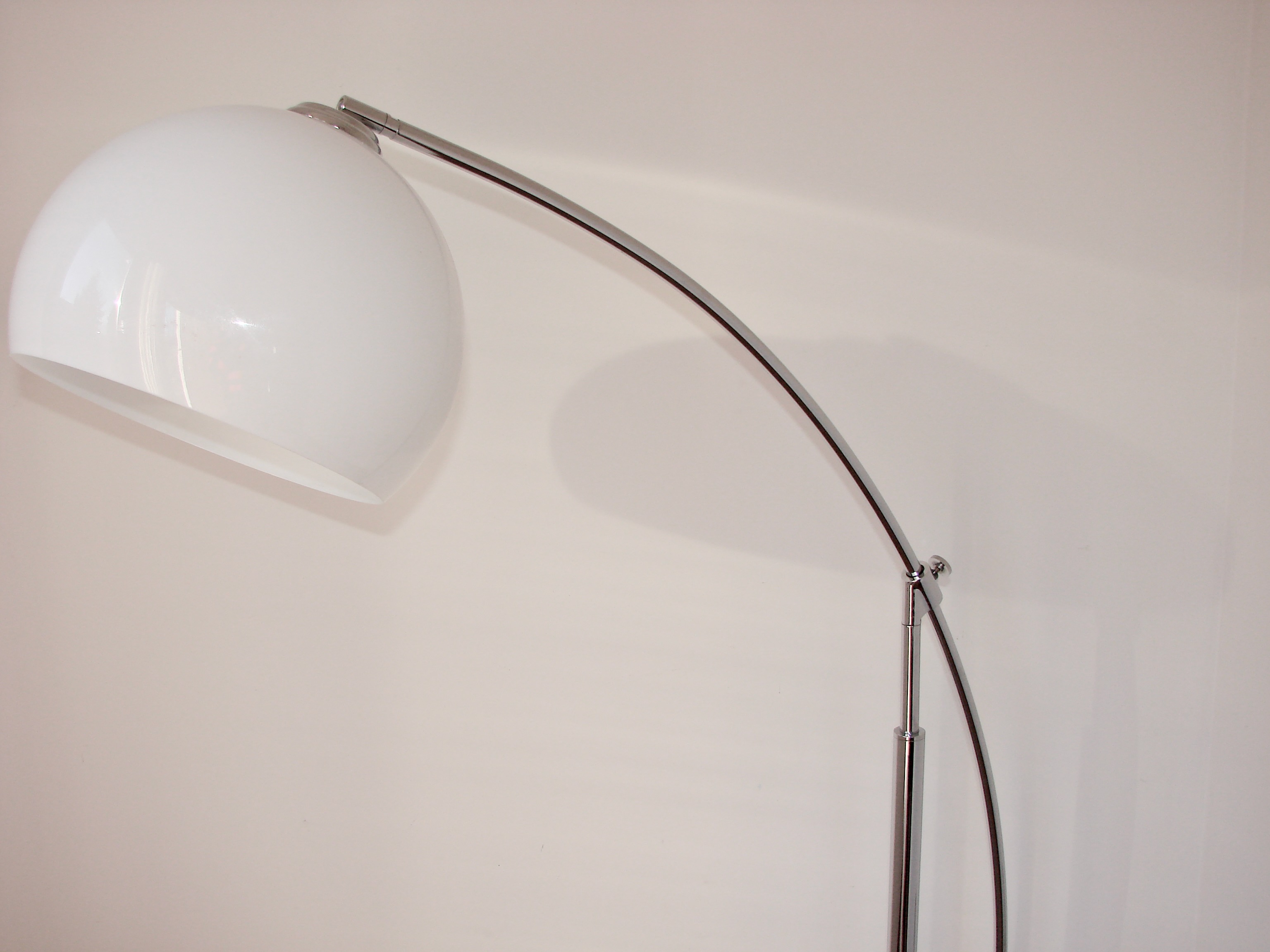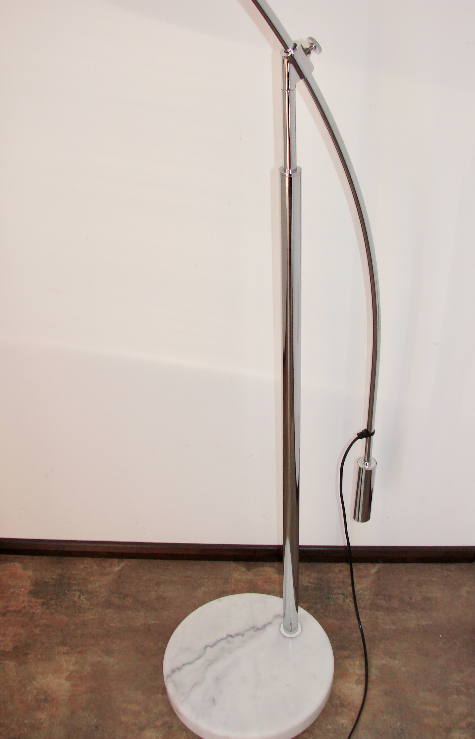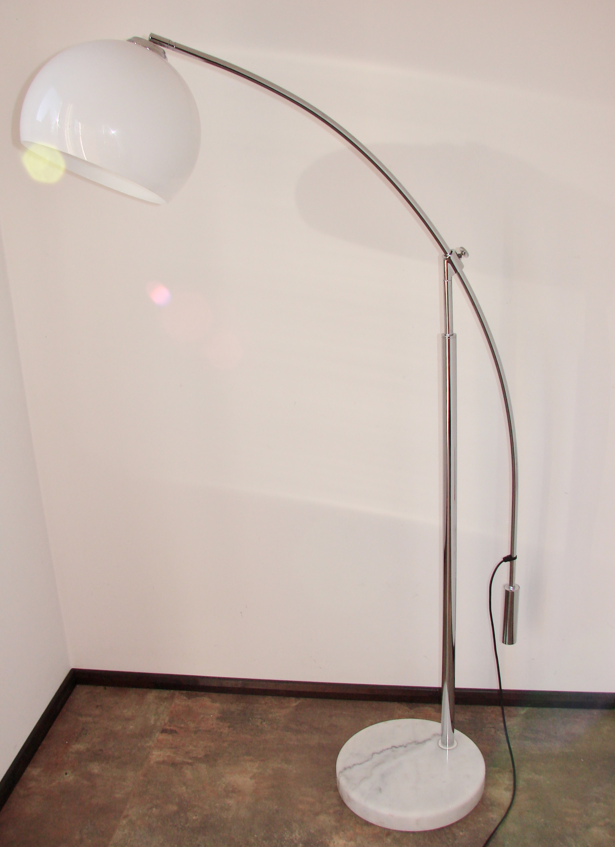 Oryginalna lampa podłogowa z lat 90., wykonana z chromowanego metalu. Model osadzony jest na ciężkiej, stabilnej podstawie z marmuru, która zapewnia solidność i elegancki wygląd. Klosz wykonano z tworzywa, co pozwala na równomierne rozproszenie światła.