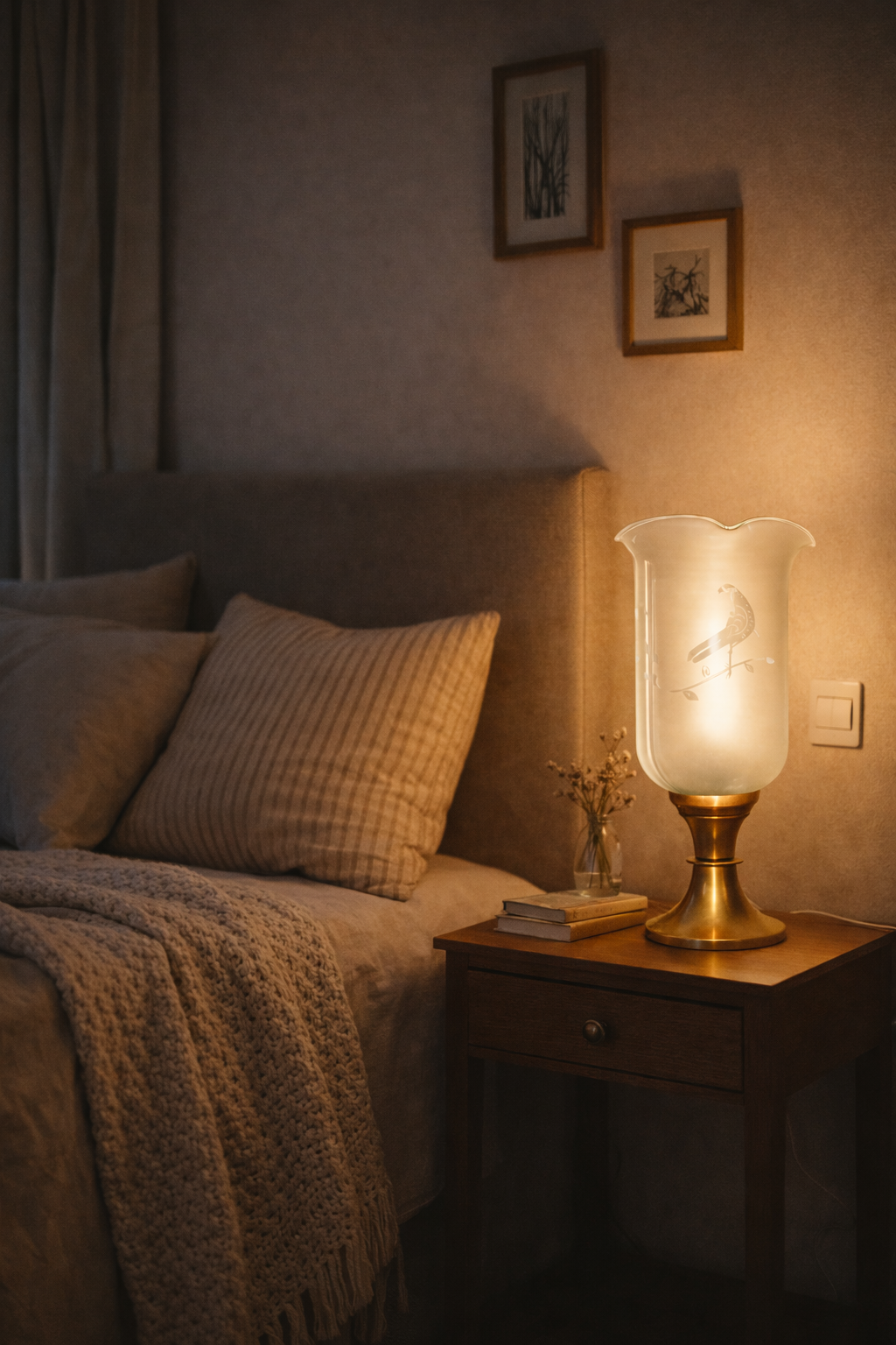 Lampa doskonale sprawdzi się jako oświetlenie boczne w salonie, sypialni, gabinecie lub na konsoli. Jej miękkie, mleczne szkło nadaje wnętrzu przytulny, ciepły klimat — idealny do aranżacji vintage, art déco, klasycznych oraz eklektycznych.