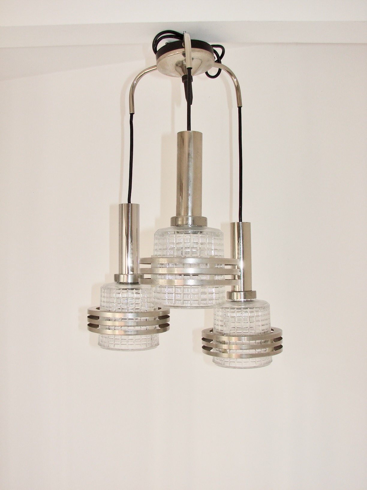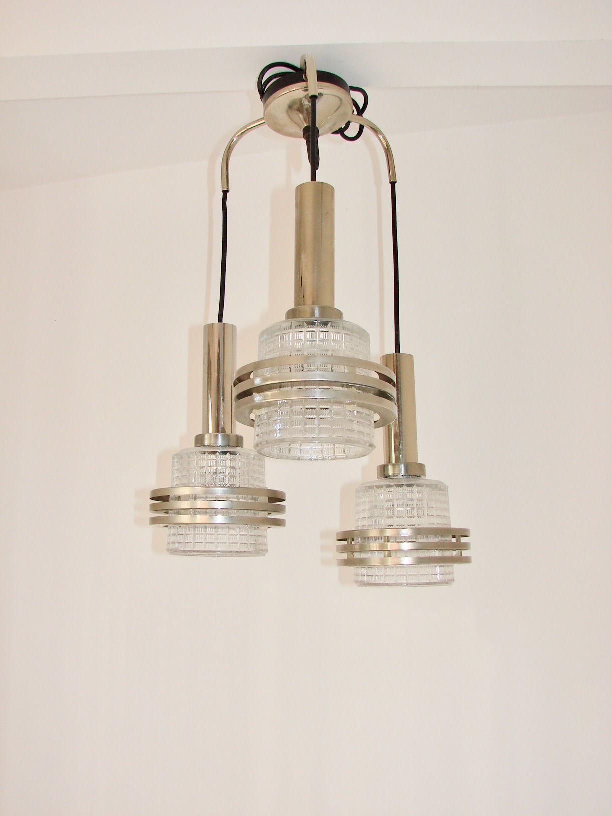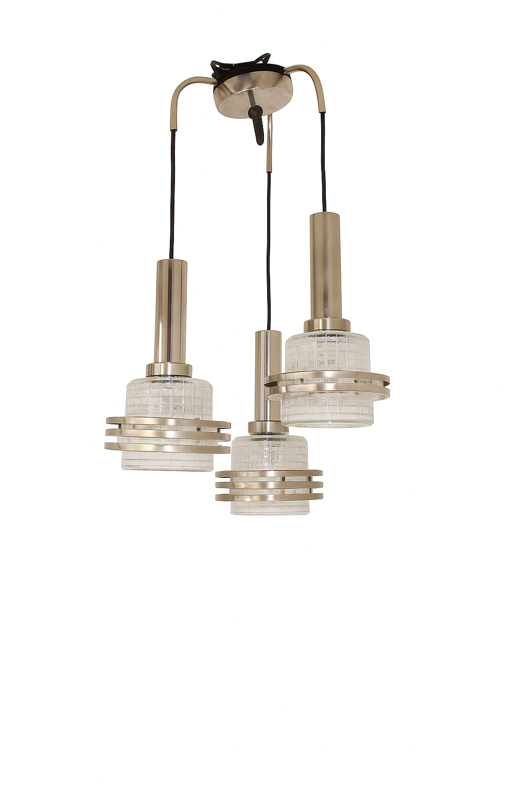 Lampa wisząca Modern z lat 70. to stylowy przykład ponadczasowego wzornictwa. Została wykonana z wysokiej jakości metalu oraz szkła, dzięki czemu łączy w sobie trwałość z elegancją. Trzy szklane klosze rozmieszczone na różnych poziomach nadają jej lekkiego, dynamicznego charakteru, a możliwość regulacji wysokości pozwala dopasować ją do indywidualnych potrzeb wnętrza.