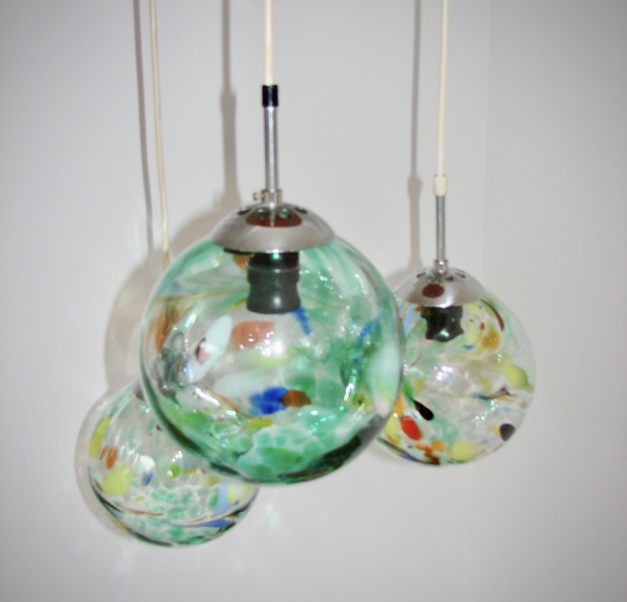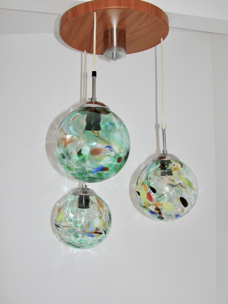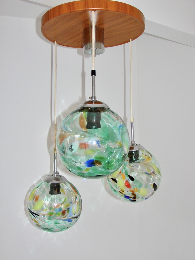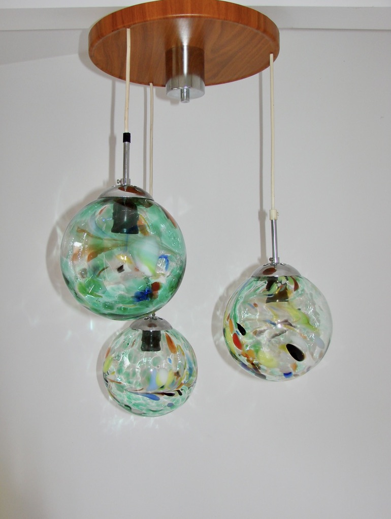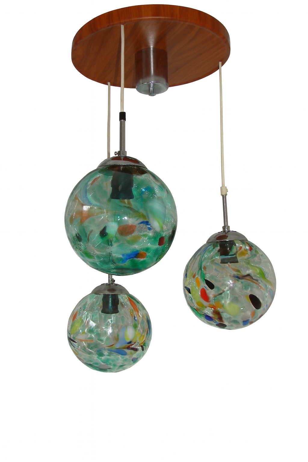 Lampa jest przystosowana do trzech żarówek z gwintem E27, co zapewnia bardzo dobre doświetlenie pomieszczenia. Kolorowe, szklane klosze nadają jej niepowtarzalny charakter i przykuwają uwagę.
