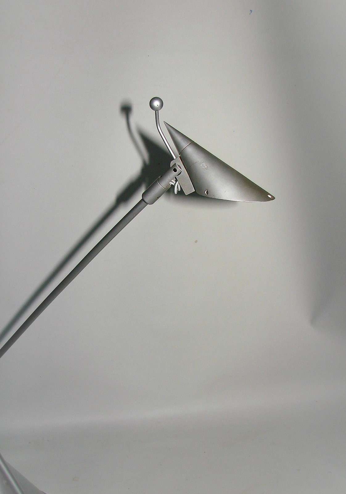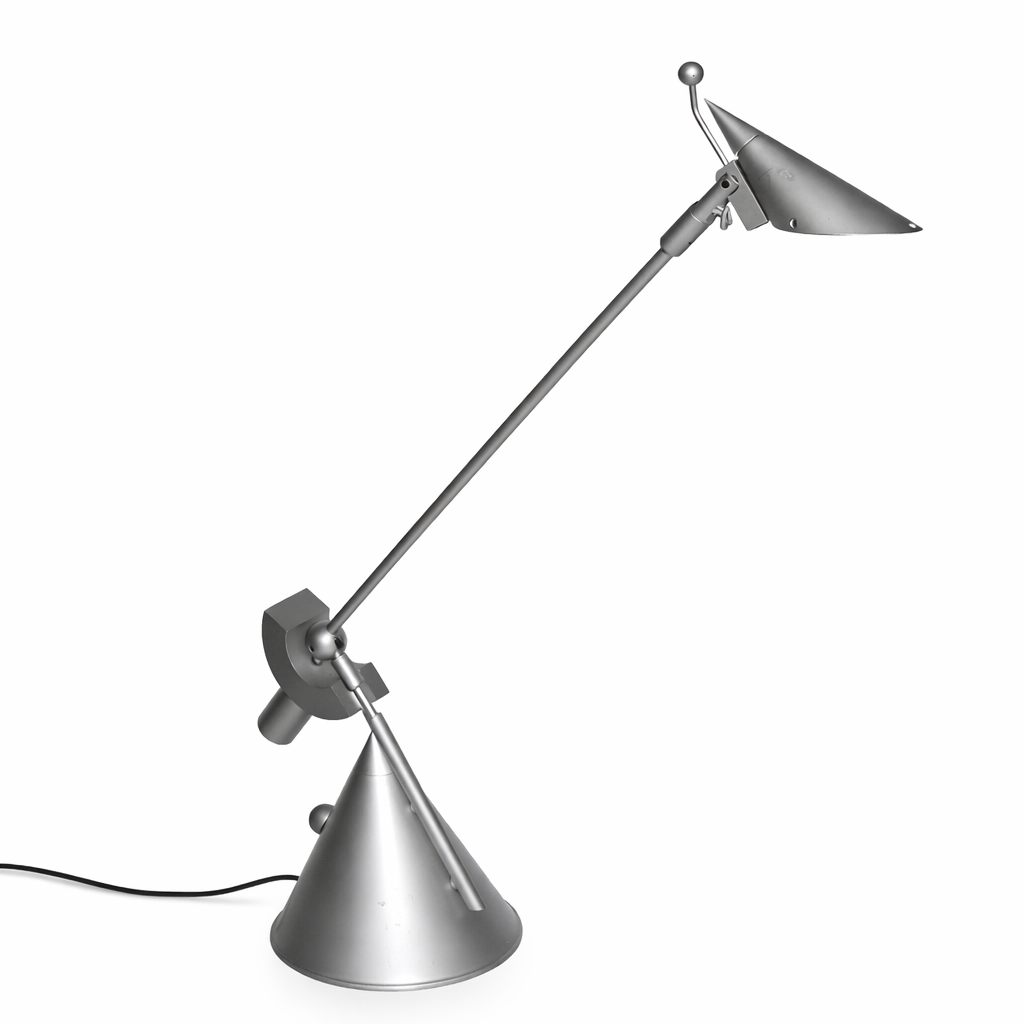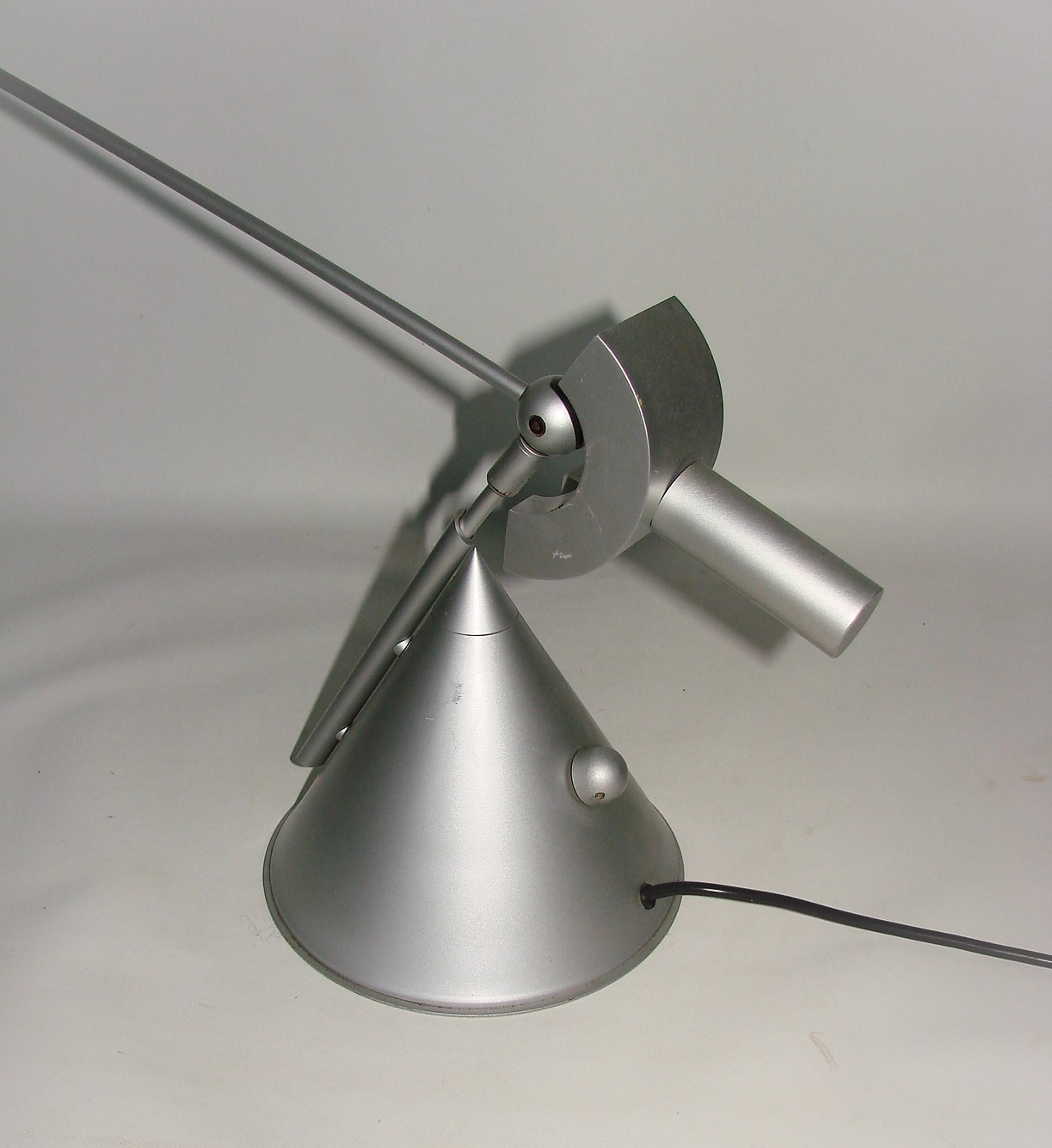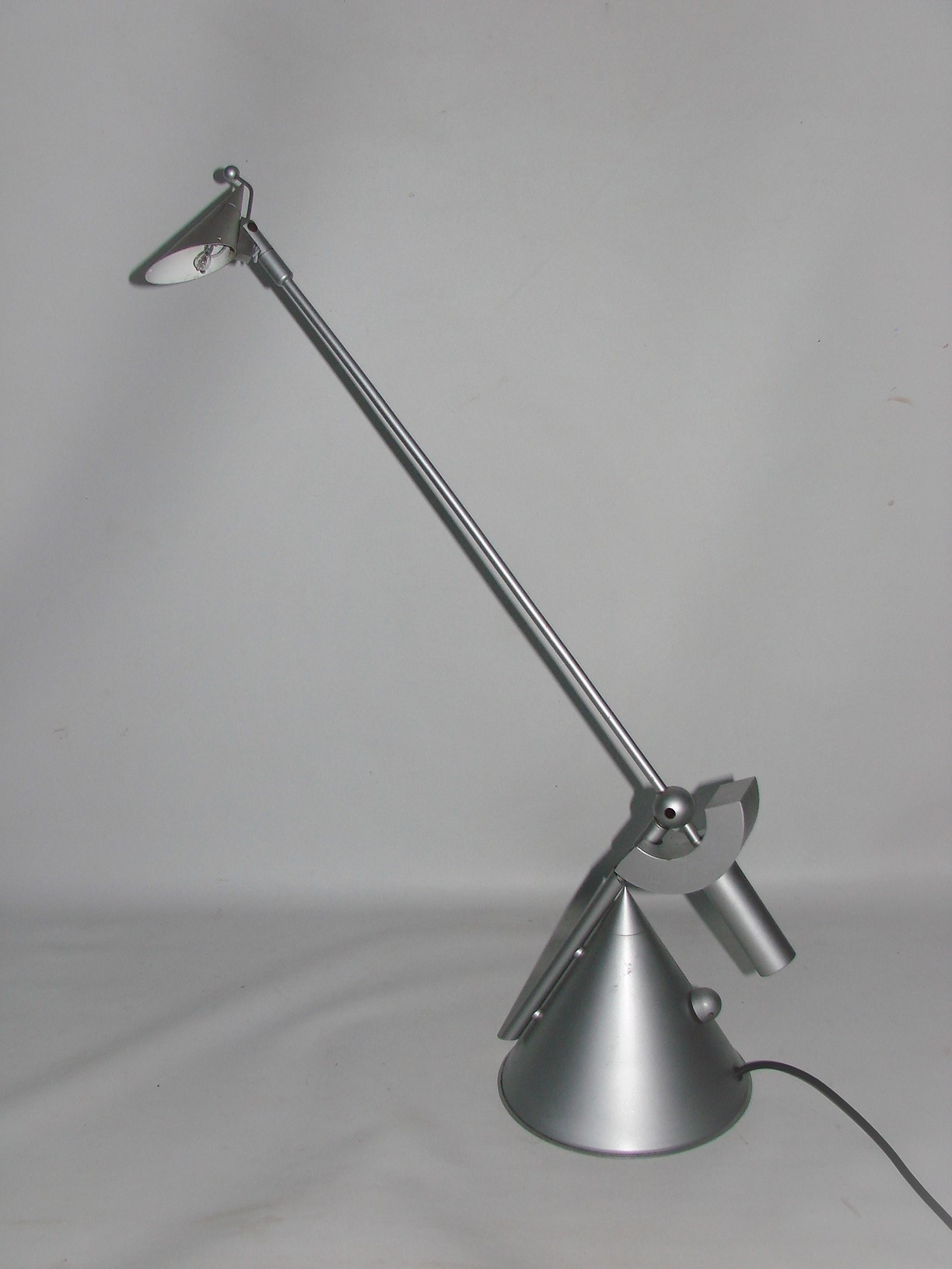 Designerska lampka biurkowa typu wahadło z lat 80., stanowiąca doskonały przykład funkcjonalnego i ponadczasowego wzornictwa tamtego okresu. Połączenie metalu i aluminium zapewnia solidność, trwałość oraz nowoczesny, techniczny charakter.