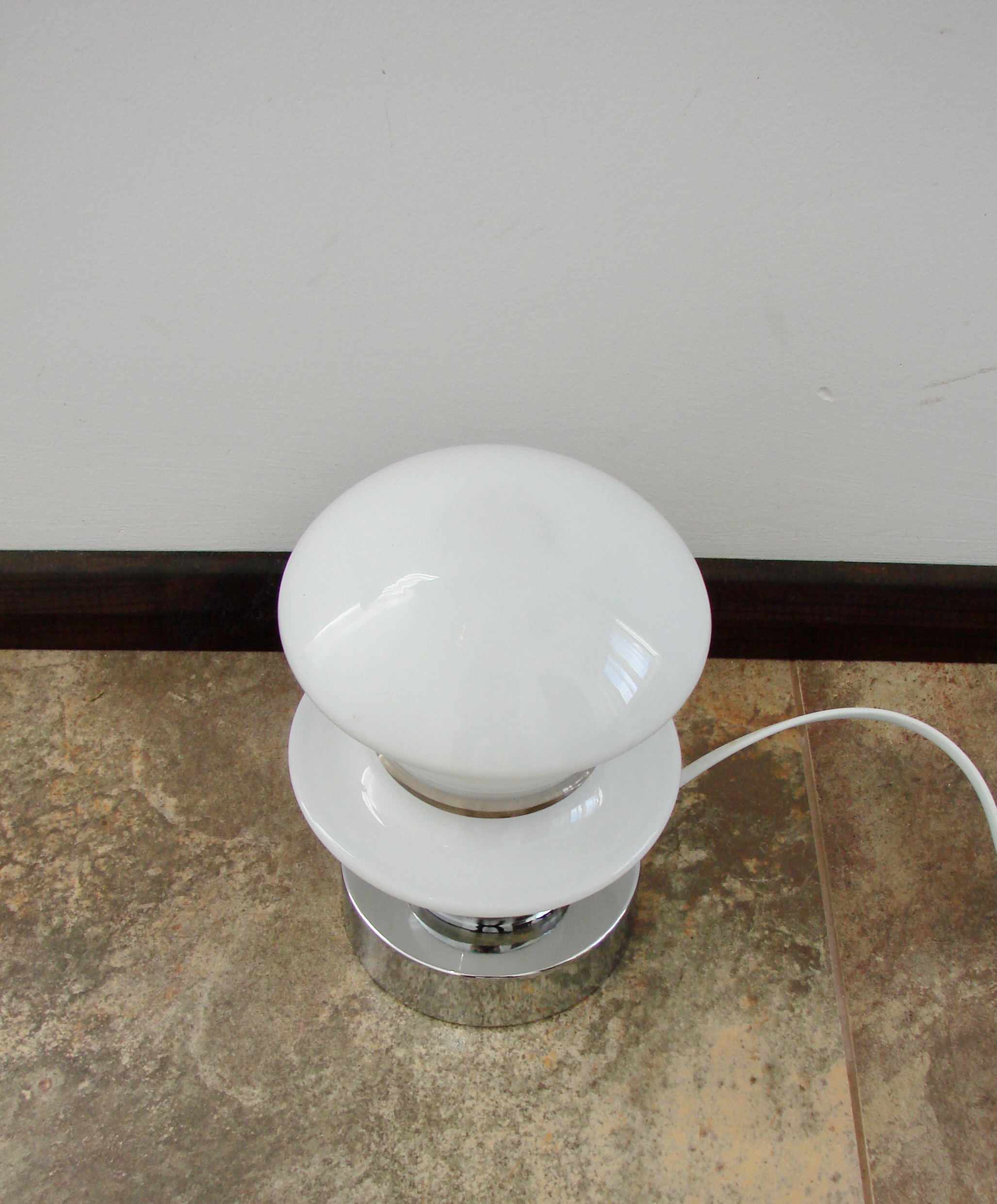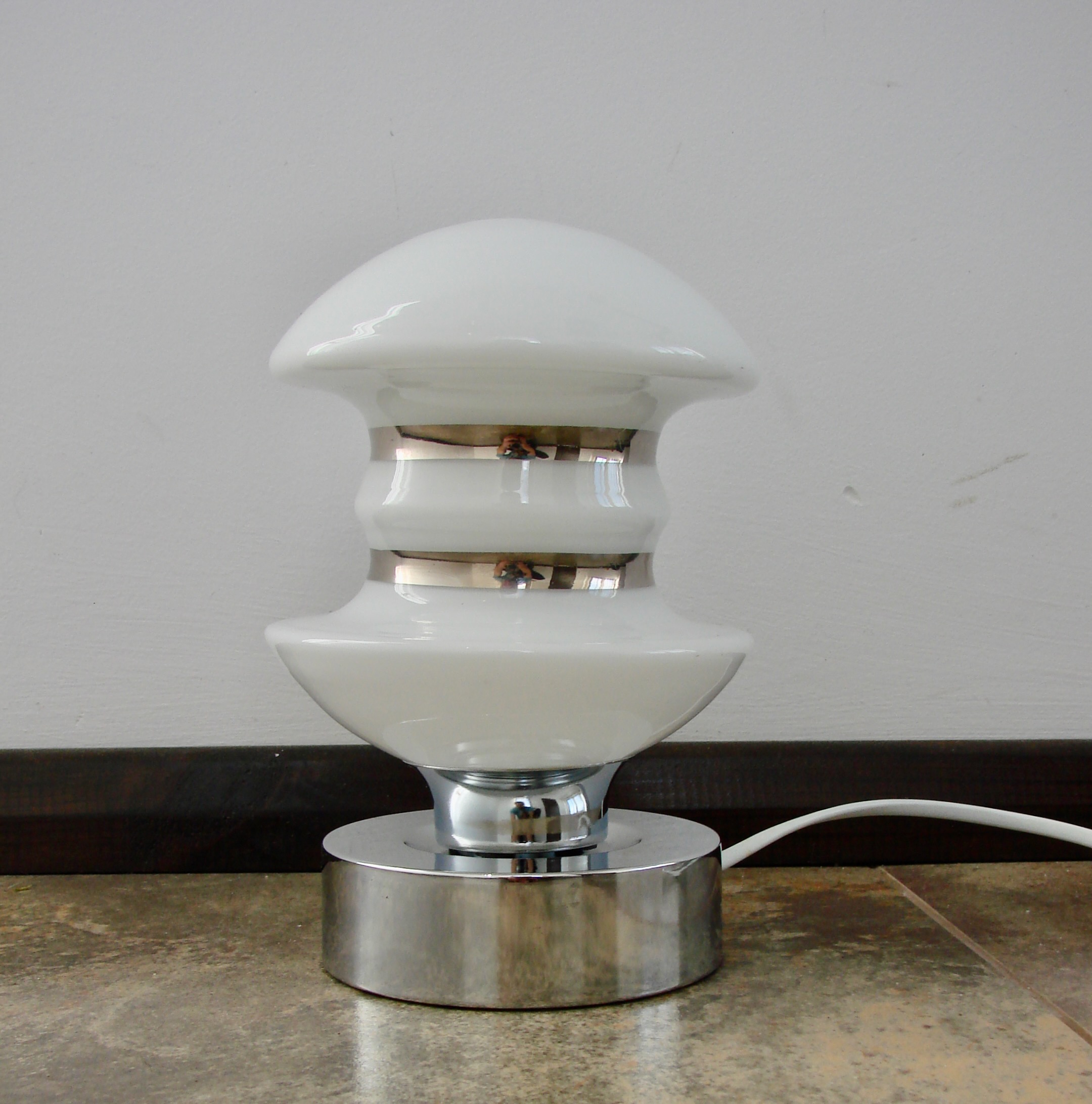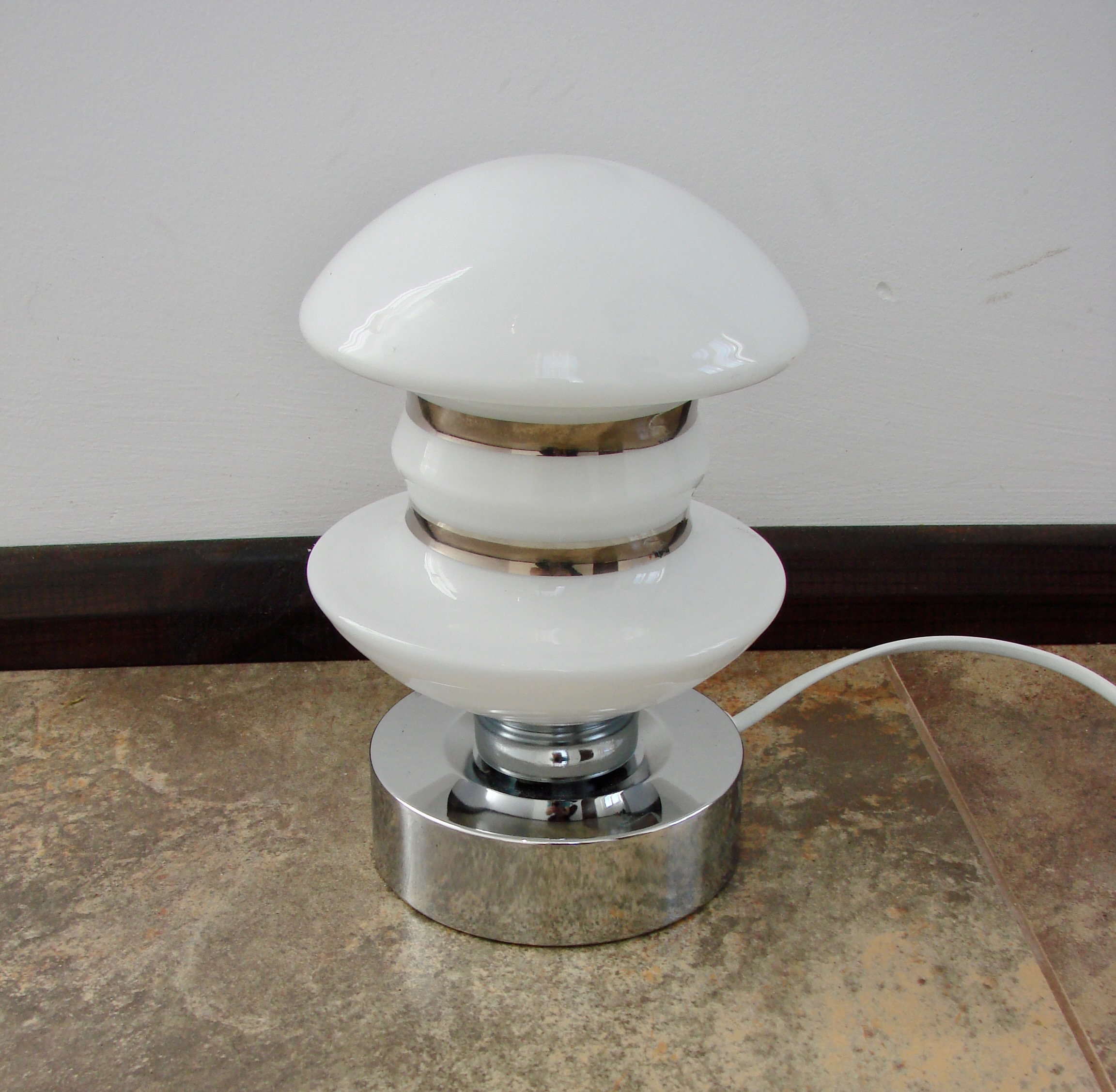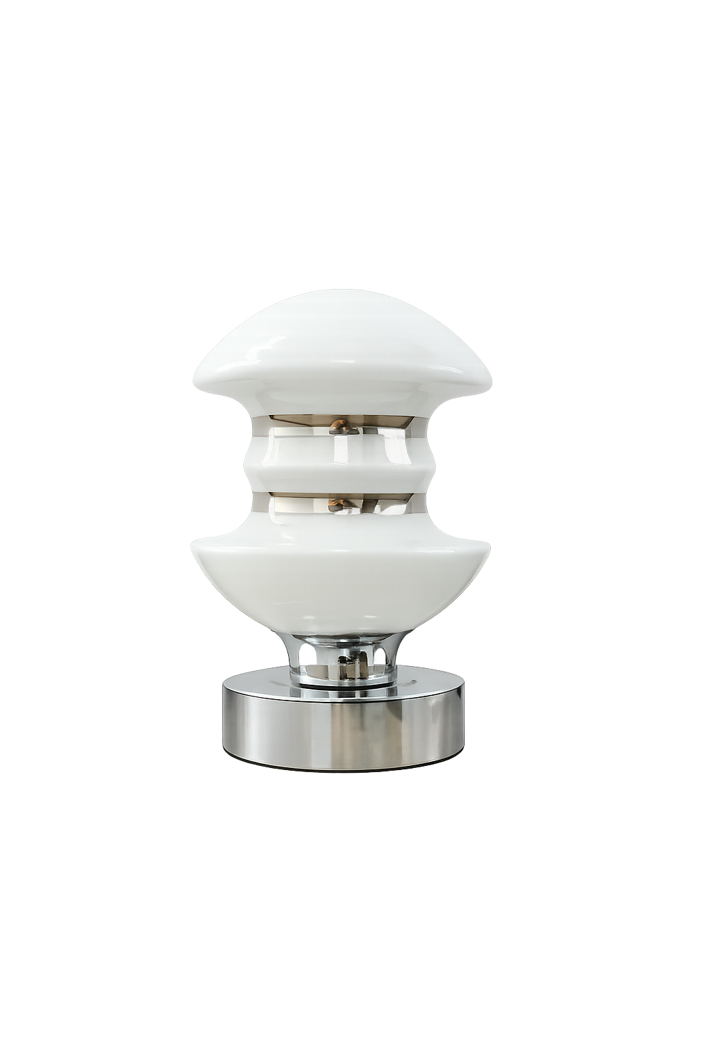 Oryginalna lampka stołowa w stylu Space Age, pochodząca z lat 80. XX wieku. Model o futurystycznej, opływowej formie charakterystycznej dla estetyki kosmicznego modernizmu.
