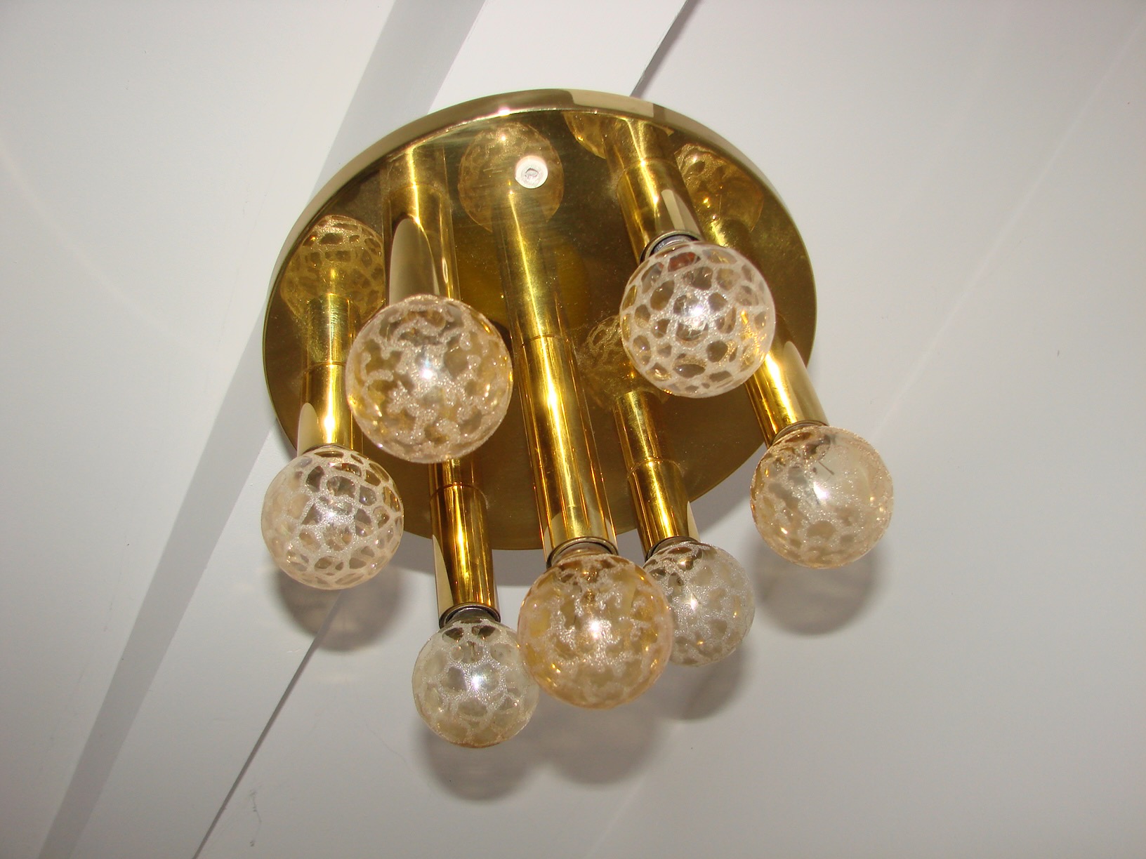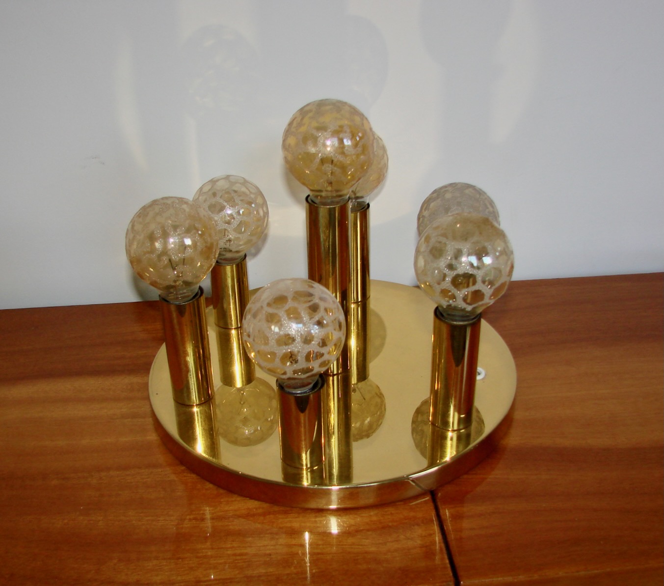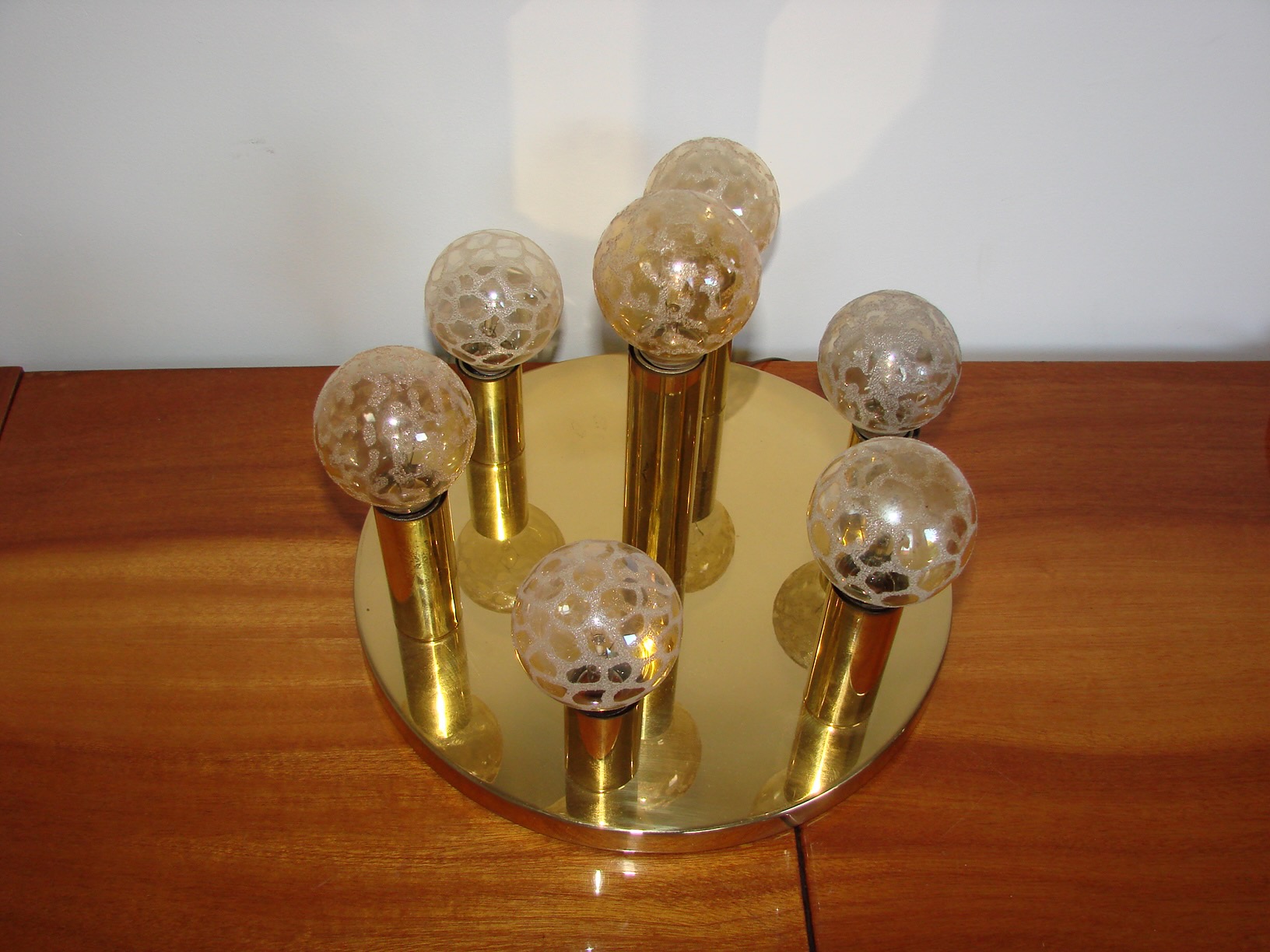 Wyjątkowa lampa sufitowa Solken z lat 70. to klasyka europejskiego designu vintage. Wykonana z wysokiej jakości mosiądzu i szkła o dekoracyjnej strukturze, przyciąga uwagę swoim eleganckim wykończeniem i ponadczasową formą.