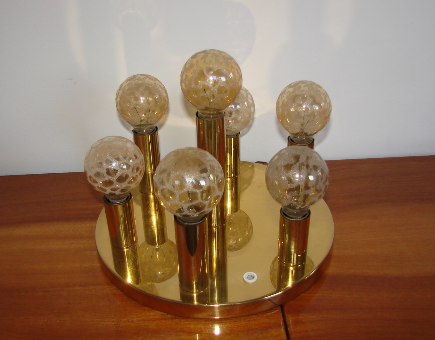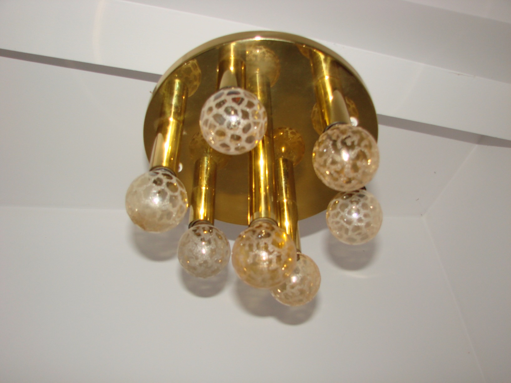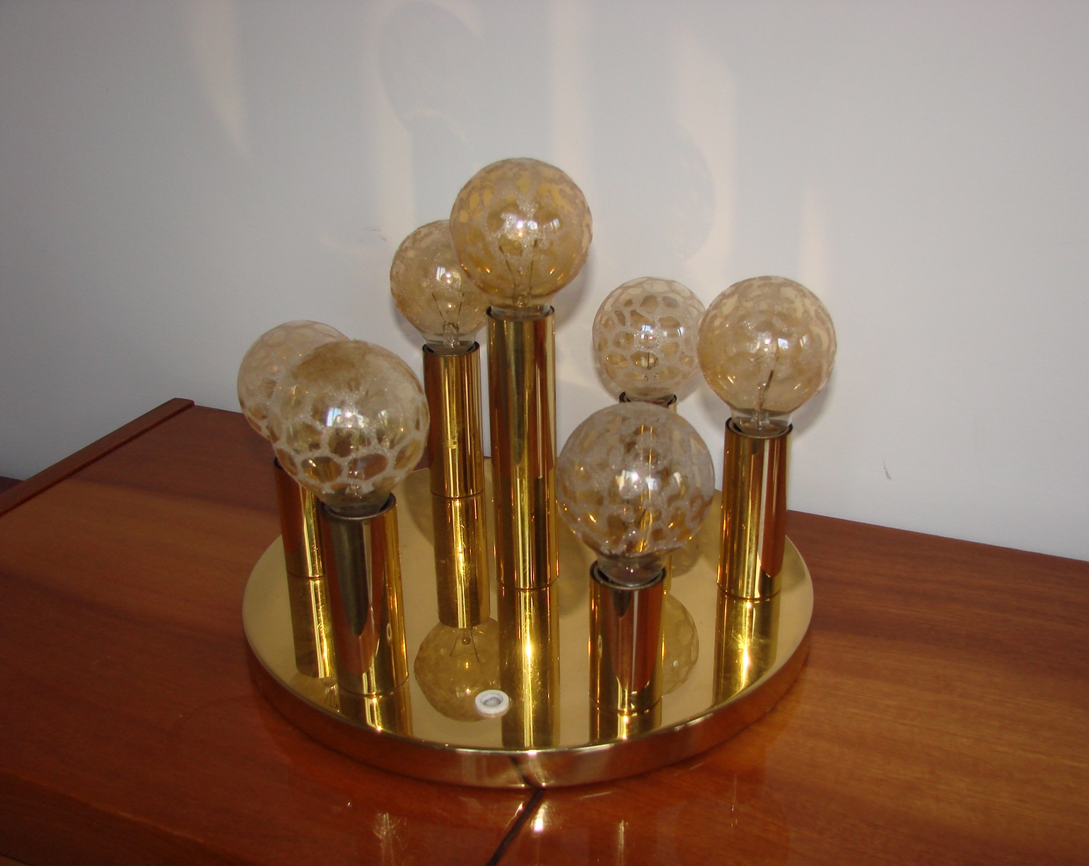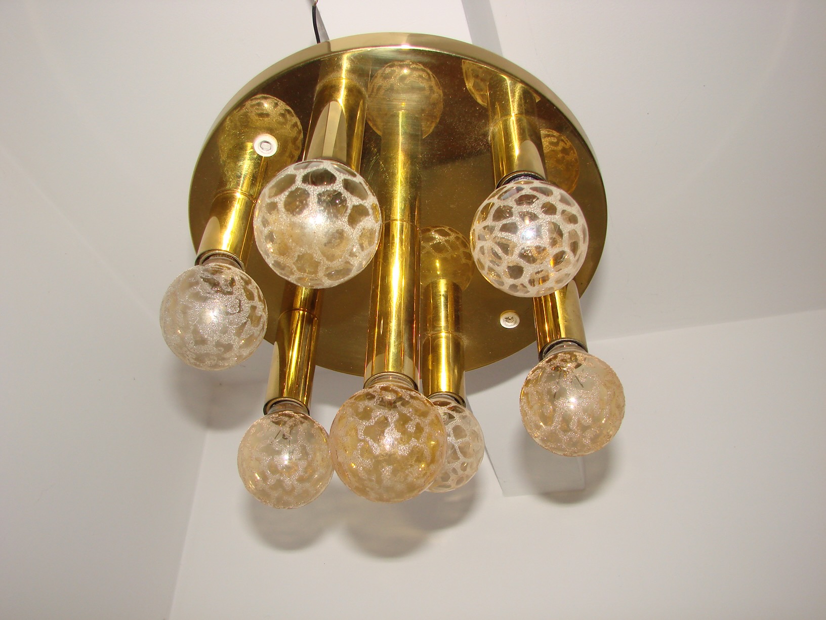 Wyjątkowa lampa sufitowa Solken z lat 70. to klasyka europejskiego designu vintage. Wykonana z wysokiej jakości mosiądzu i szkła o dekoracyjnej strukturze, przyciąga uwagę swoim eleganckim wykończeniem i ponadczasową formą.