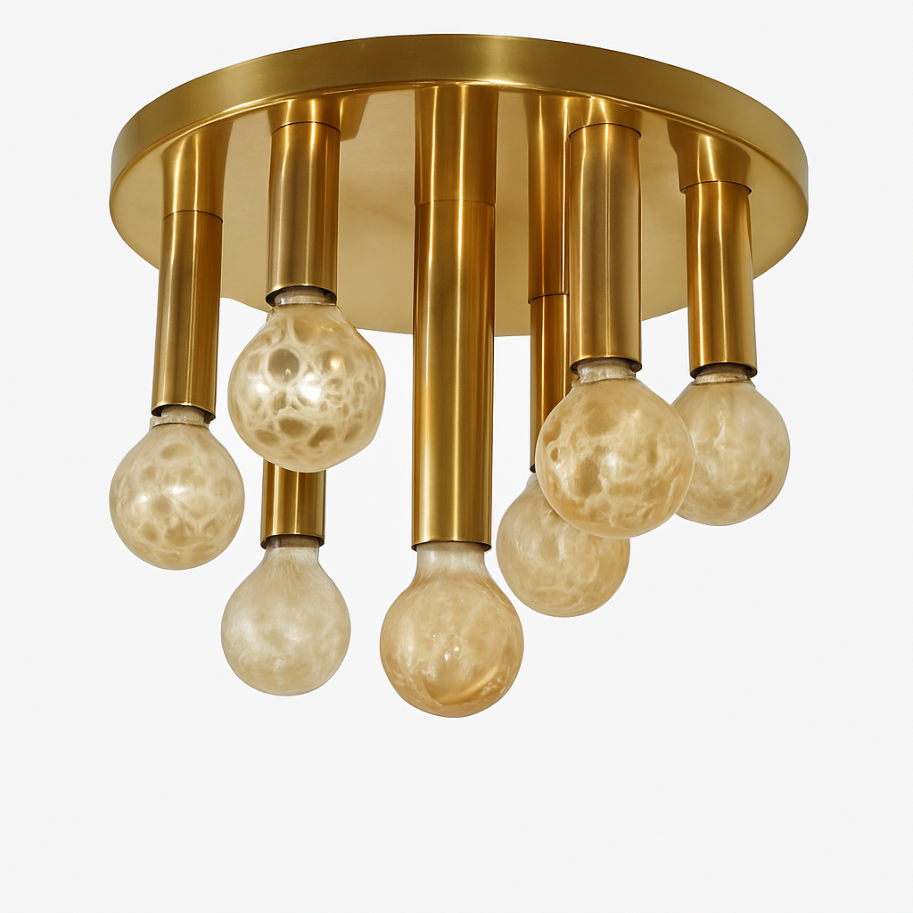 Konstrukcja oparta na siedmiu źródłach światła E14 gwarantuje mocne i równomierne oświetlenie, a jednocześnie tworzy nastrojowy klimat we wnętrzu. Lampa świetnie sprawdzi się w salonie, jadalni czy przestrzeni komercyjnej – od wnętrz retro i mid-century, po nowoczesne aranżacje z akcentem vintage.