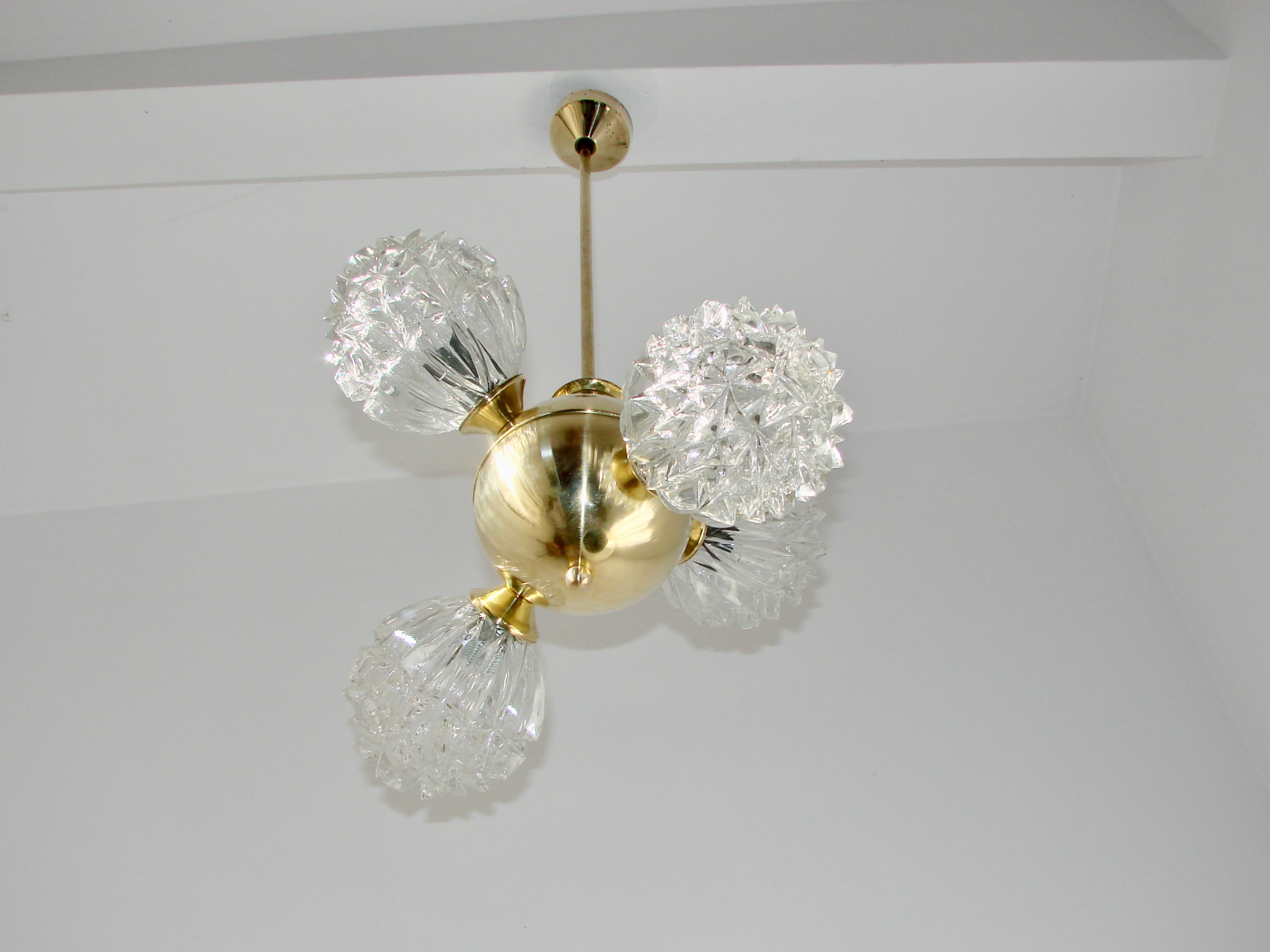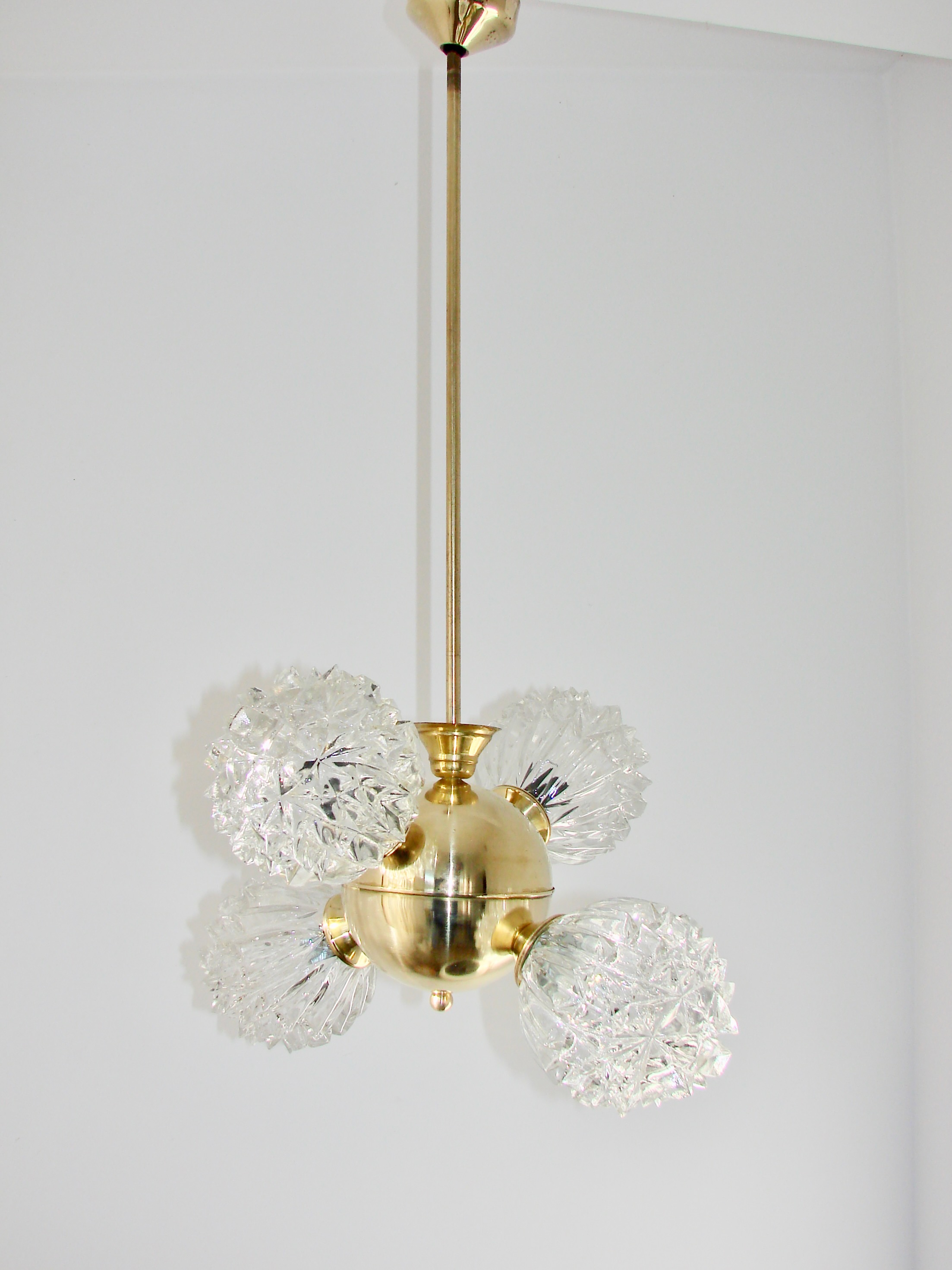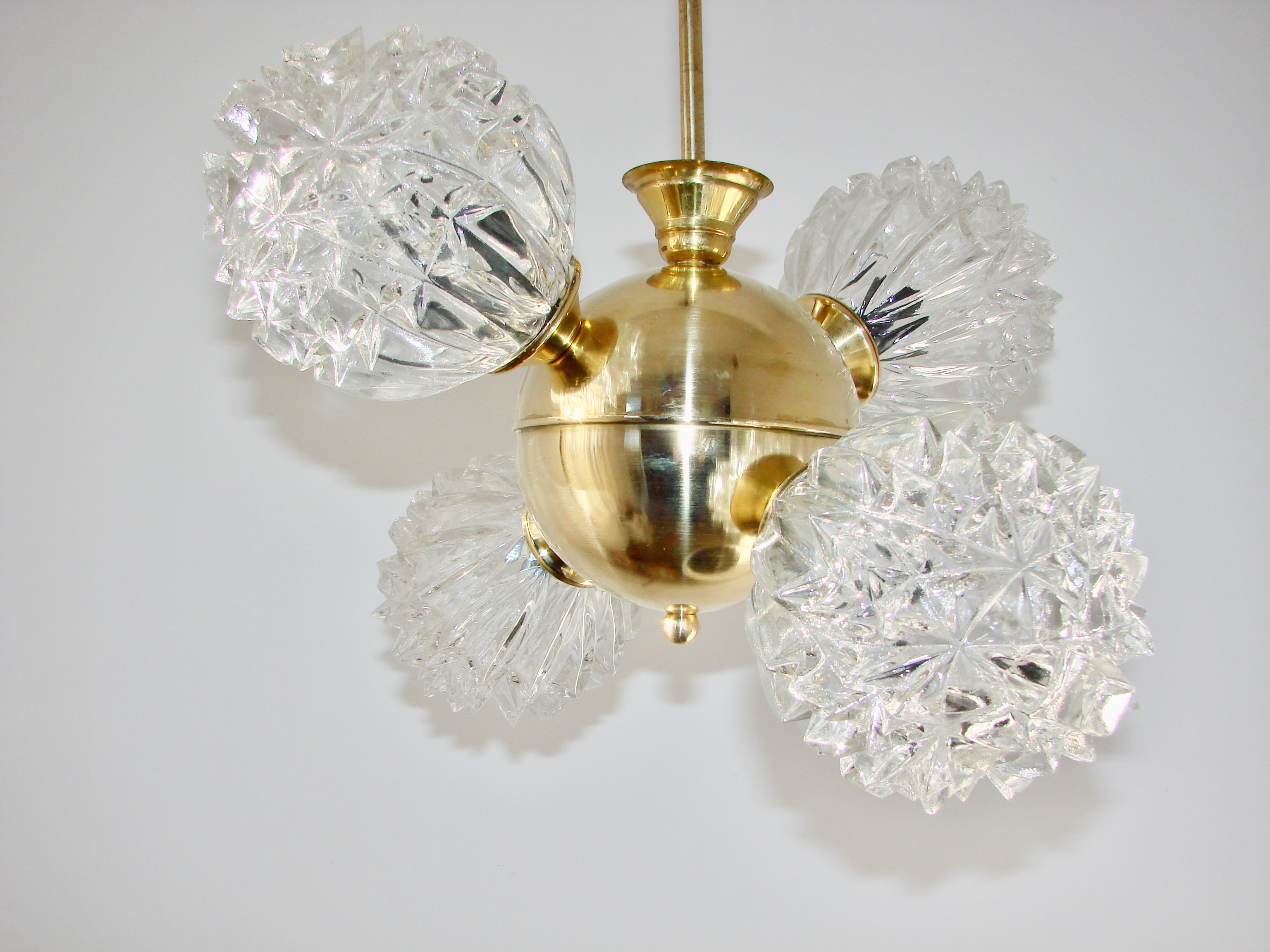 Piękny przykład wzornictwa vintage w stylu mid-century. Lampa została wykonana z polerowanego mosiądzu oraz szkła fornirowanego, które tworzy efektowne, dekoracyjne klosze o strukturze kryształów. Konstrukcja jest solidna i wyjątkowo dekoracyjna — idealna do salonu, jadalni lub wnętrz w stylu retro, glamour czy modern vintage.