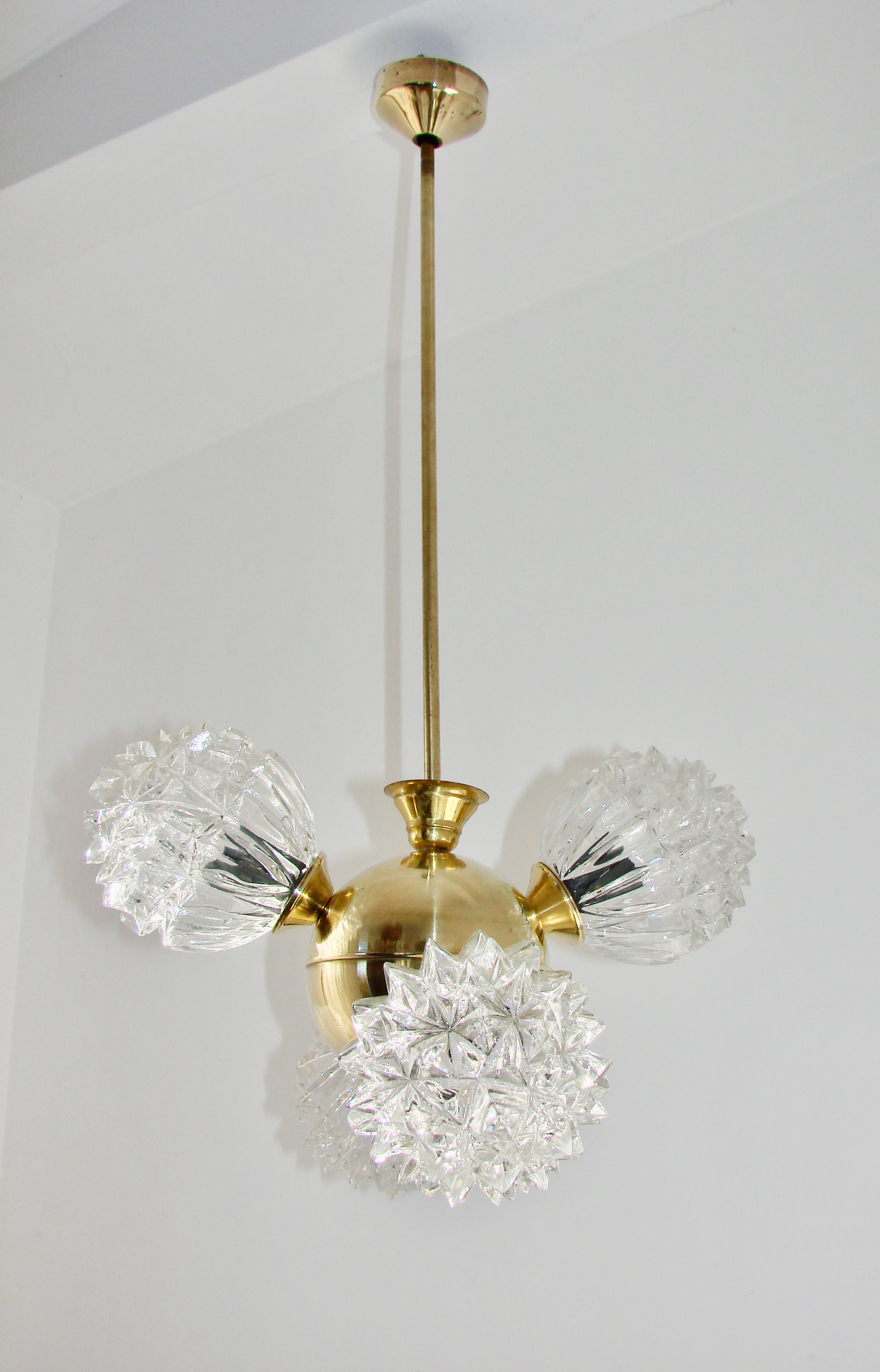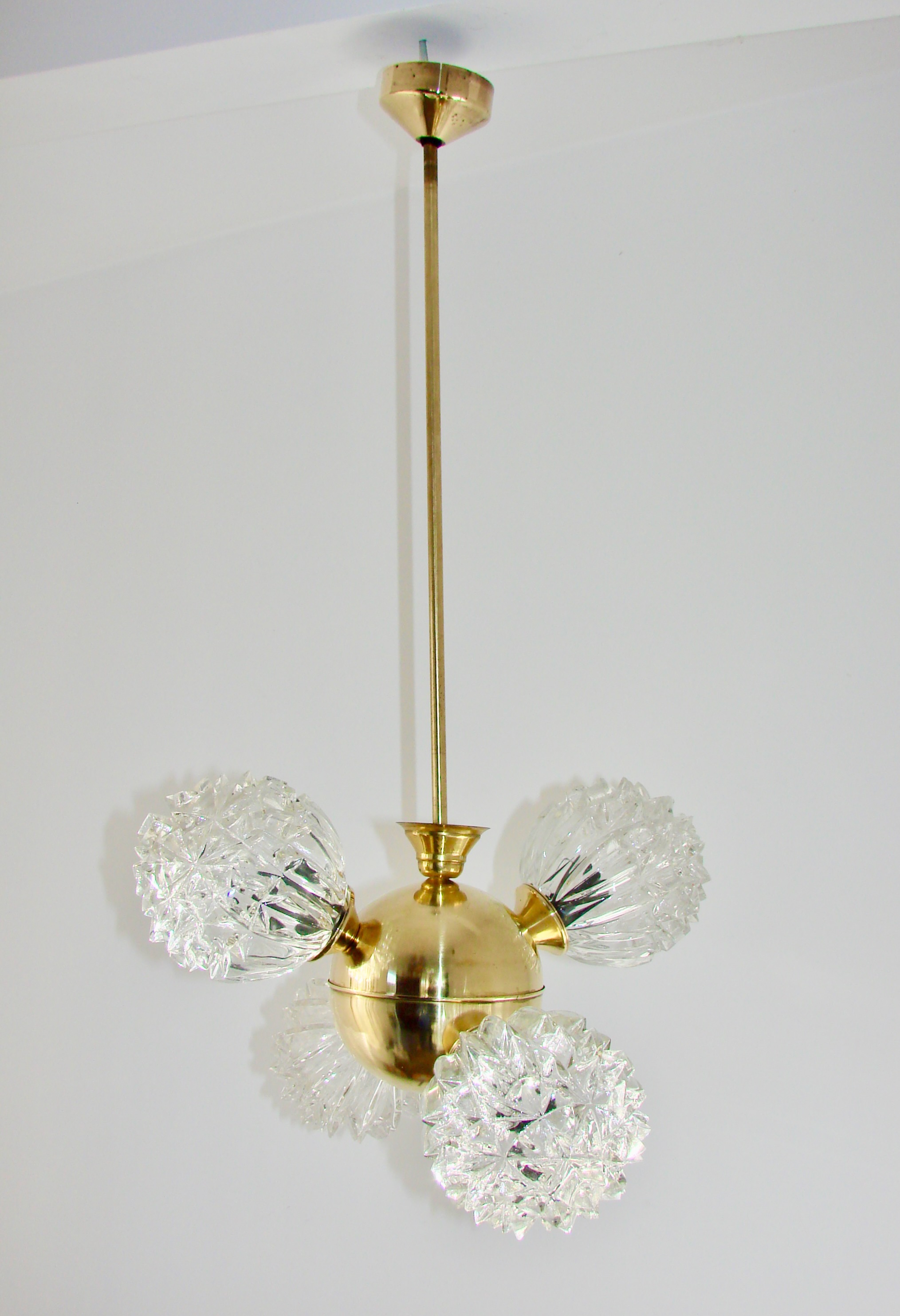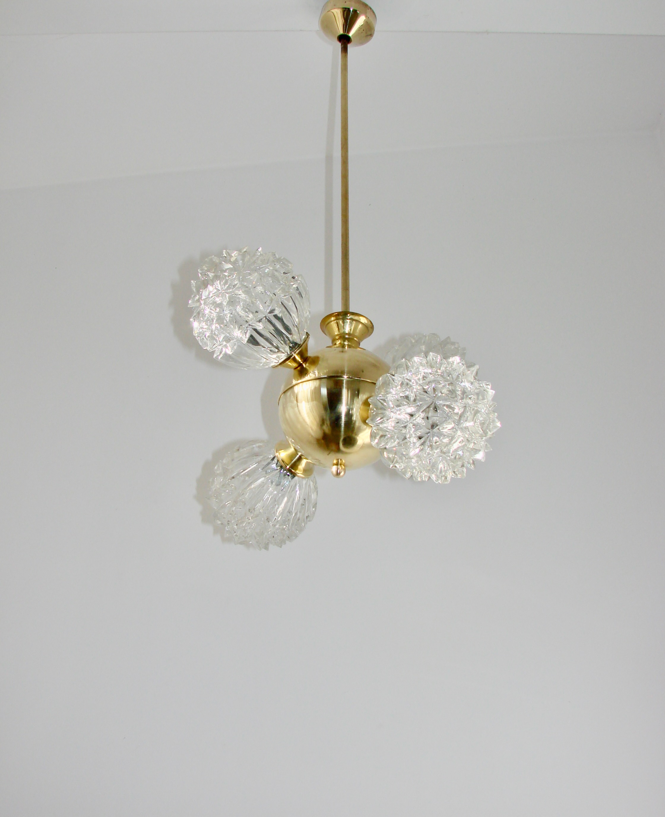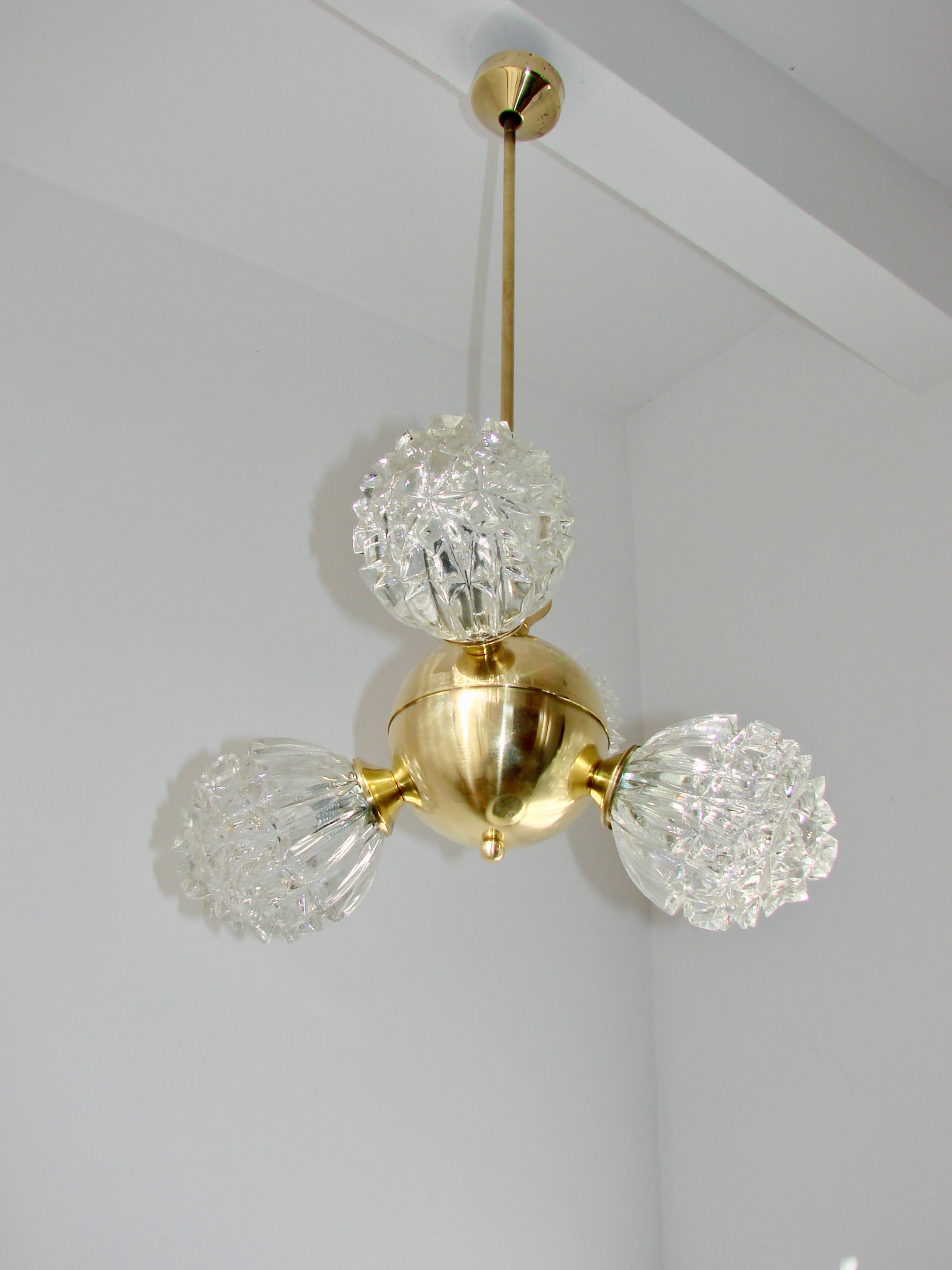 Piękny przykład wzornictwa vintage w stylu mid-century. Lampa została wykonana z polerowanego mosiądzu oraz szkła fornirowanego, które tworzy efektowne, dekoracyjne klosze o strukturze kryształów. Konstrukcja jest solidna i wyjątkowo dekoracyjna — idealna do salonu, jadalni lub wnętrz w stylu retro, glamour czy modern vintage.