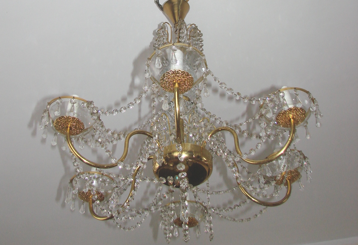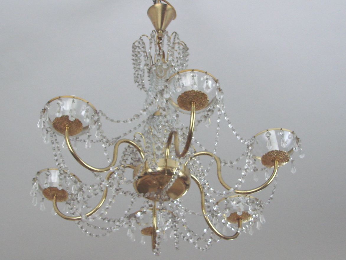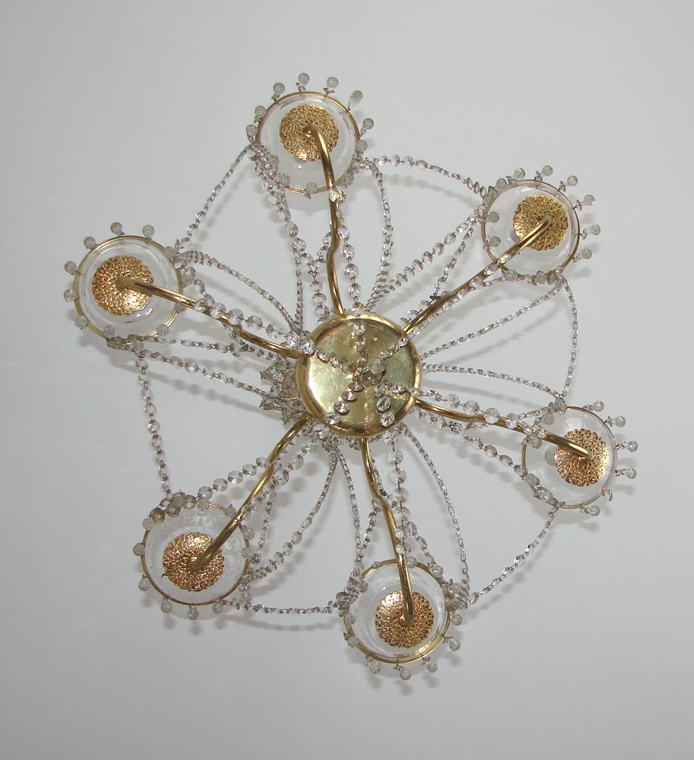 Żyrandol wyposażony jest w sześć punktów świetlnych E14, co zapewnia mocne i równomierne oświetlenie przestrzeni. Zachowany jest w bardzo dobrym stanie, z naturalną, delikatną patyną dodającą lampie autentyczności. Jego proporcje i forma czynią go idealnym do salonu, jadalni, większych sypialni oraz wnętrz utrzymanych w stylu klasycznym, retro lub mid-century.