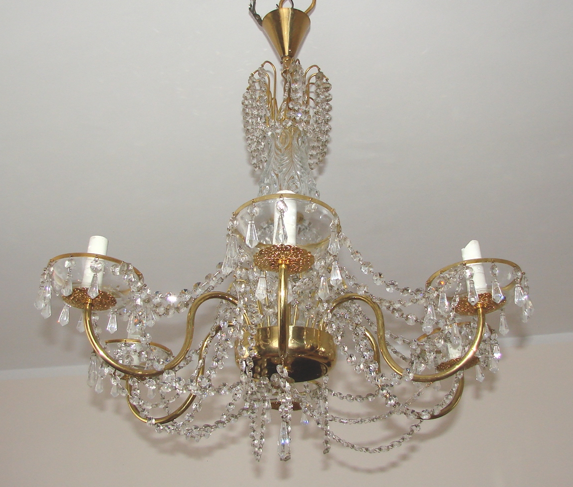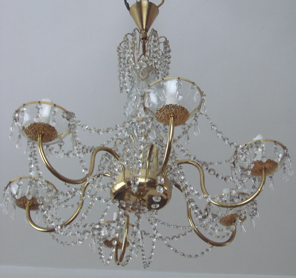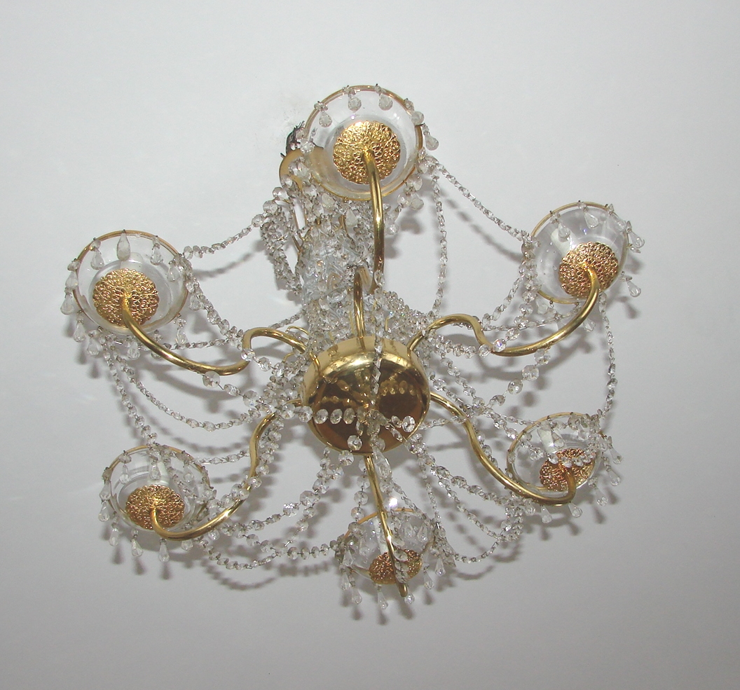 Żyrandol wyposażony jest w sześć punktów świetlnych E14, co zapewnia mocne i równomierne oświetlenie przestrzeni. Zachowany jest w bardzo dobrym stanie, z naturalną, delikatną patyną dodającą lampie autentyczności. Jego proporcje i forma czynią go idealnym do salonu, jadalni, większych sypialni oraz wnętrz utrzymanych w stylu klasycznym, retro lub mid-century.