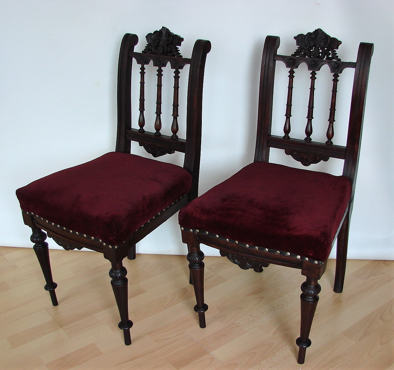 Autentyczna para krzeseł z XIX wieku – wyjątkowy przykład meblarstwa z epoki, łączący solidne rzemiosło z ponadczasową estetyką. Konstrukcja wykonana z drewna, z siedziskiem i oparciem obitym miękką tkaniną welurową, która nadaje całości szlachetnego, dekoracyjnego charakteru.