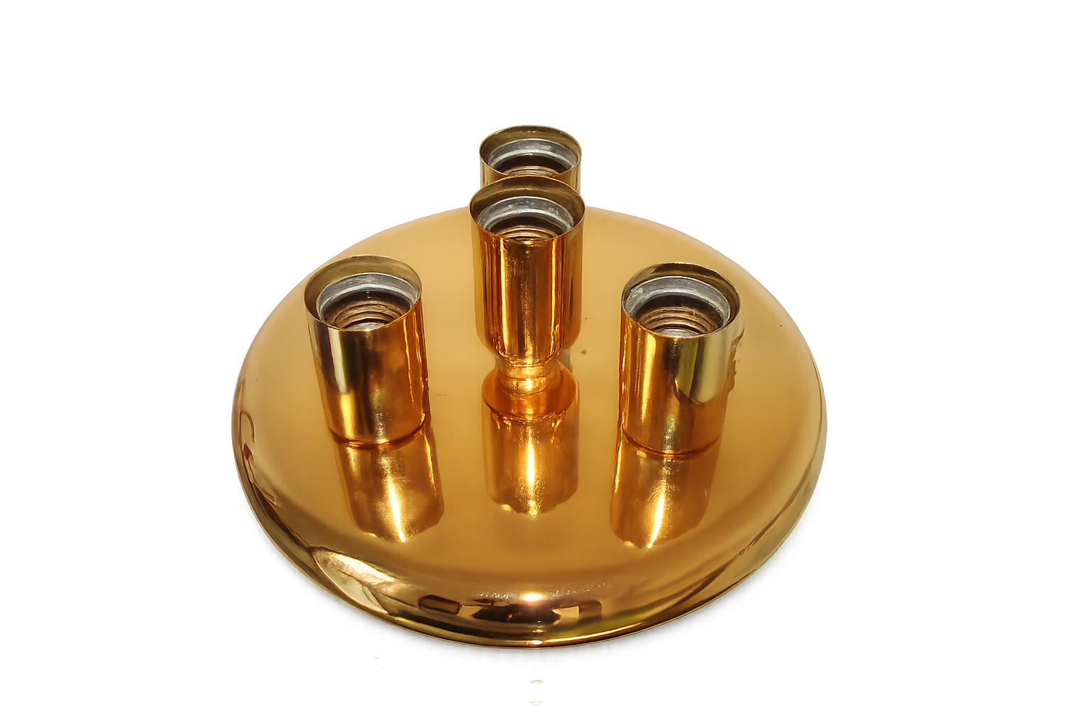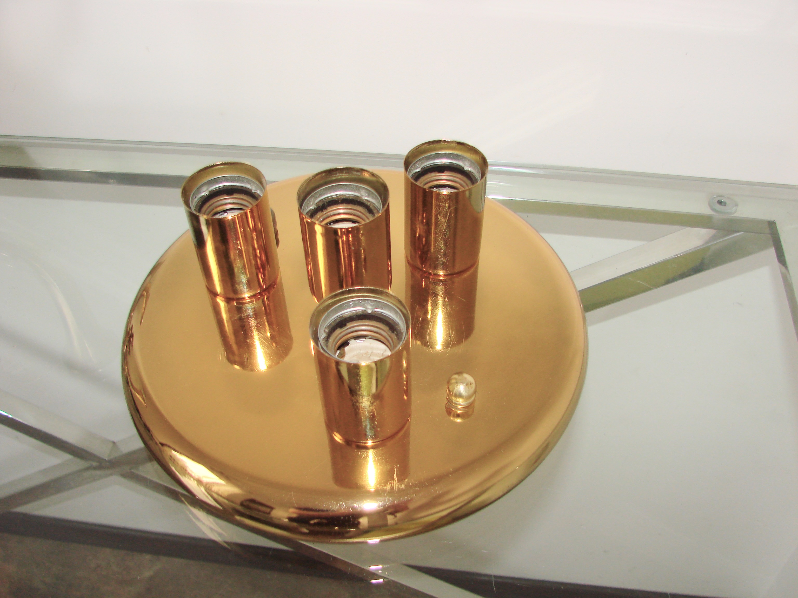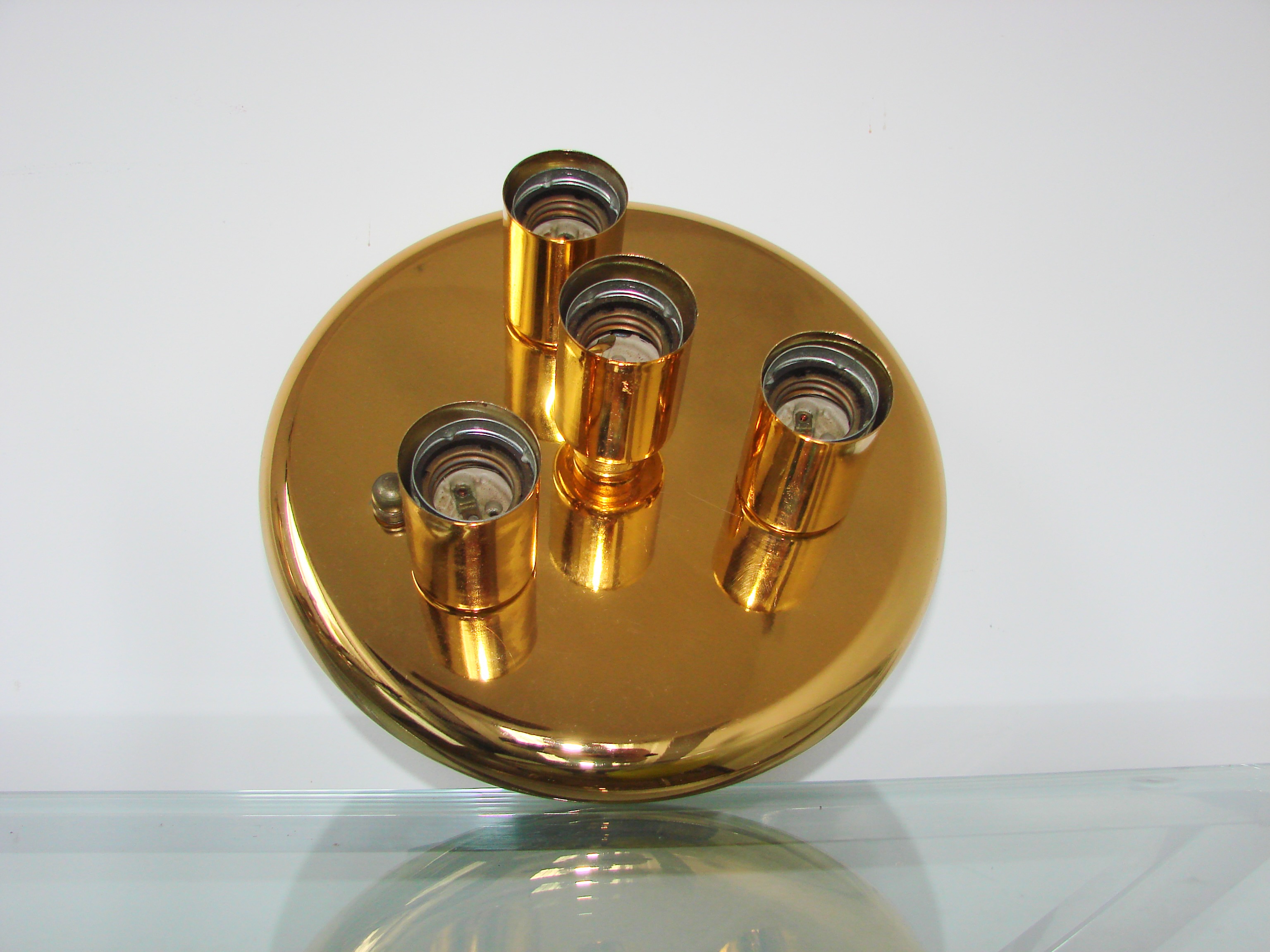 Oryginalny plafon sufitowy z lat 80., wykonany z metalu wykończonego w kolorze mosiądzu. Lampa posiada elegancką, prostą formę charakterystyczną dla oświetlenia z tego okresu, dzięki czemu doskonale sprawdzi się zarówno we wnętrzach vintage, jak i w aranżacjach retro, mid-century czy modern classic.