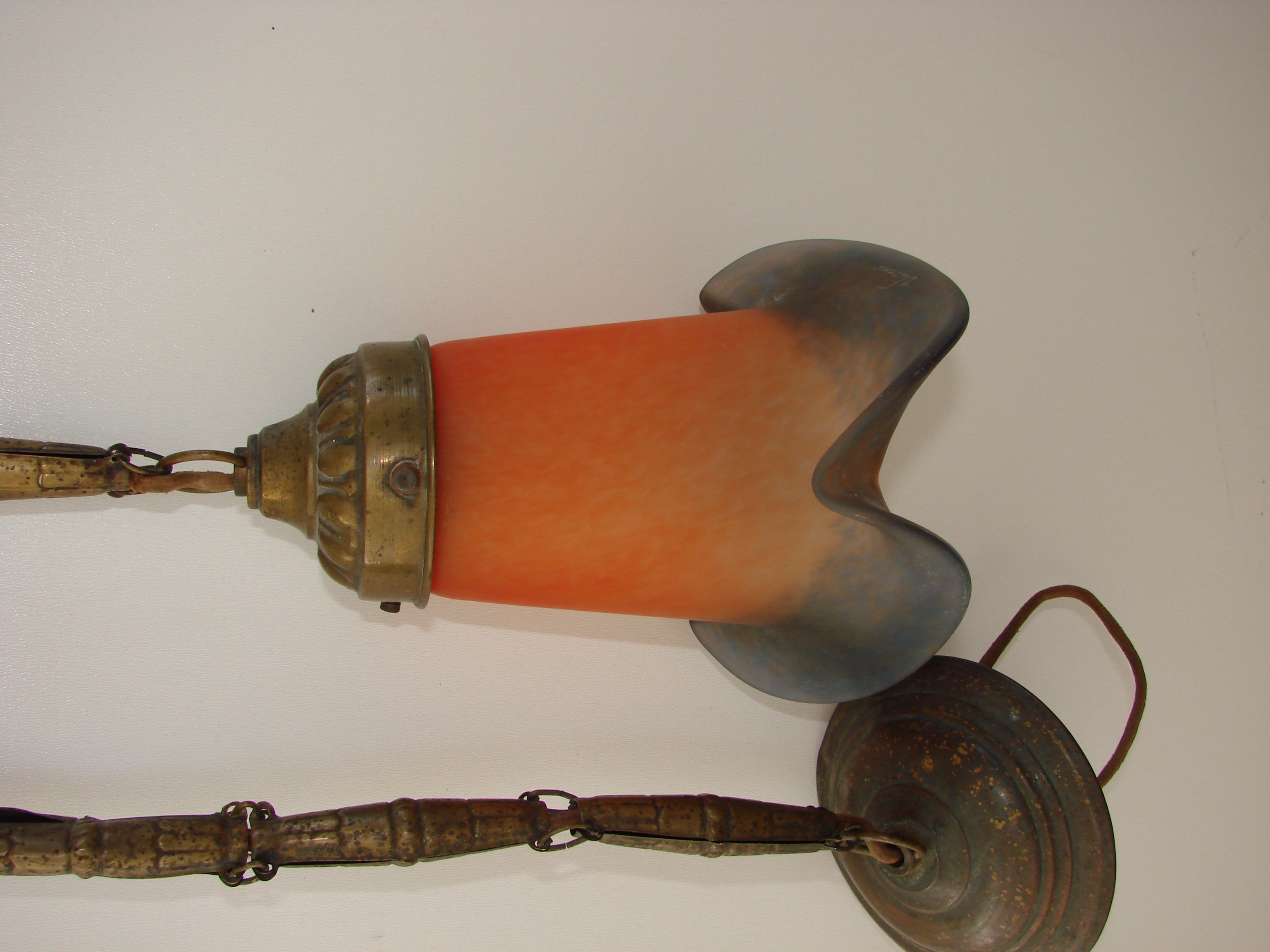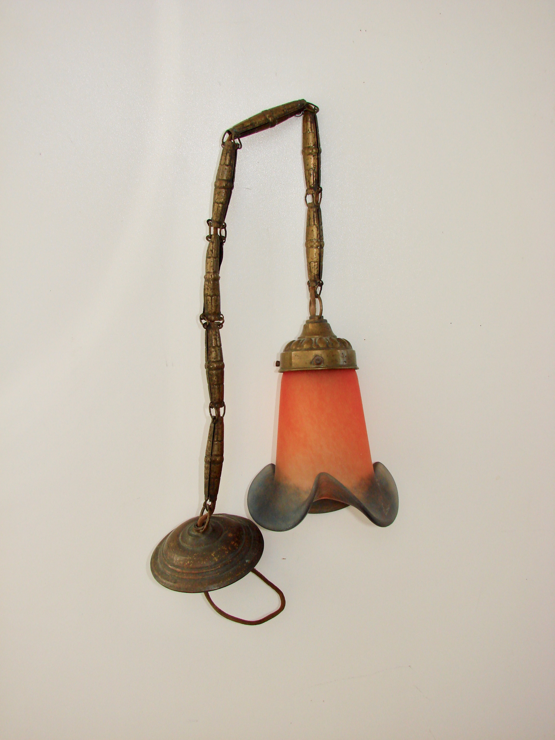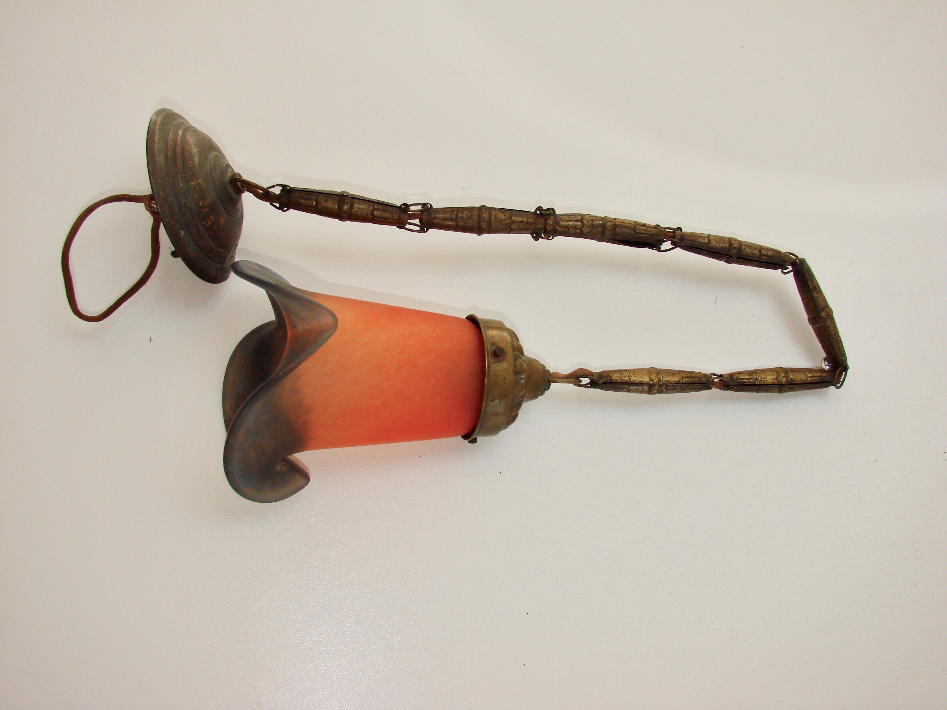 Wyjątkowa lampa wisząca w stylu Art Deco pochodząca z lat 30. XX wieku. Charakterystyczna dla epoki elegancka, geometryczna forma oraz połączenie mosiądzu i szkła nadają jej ponadczasowy, szlachetny charakter.