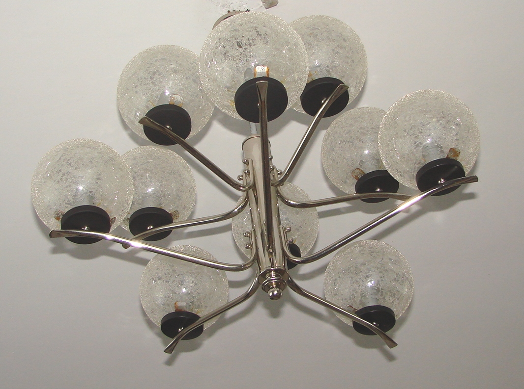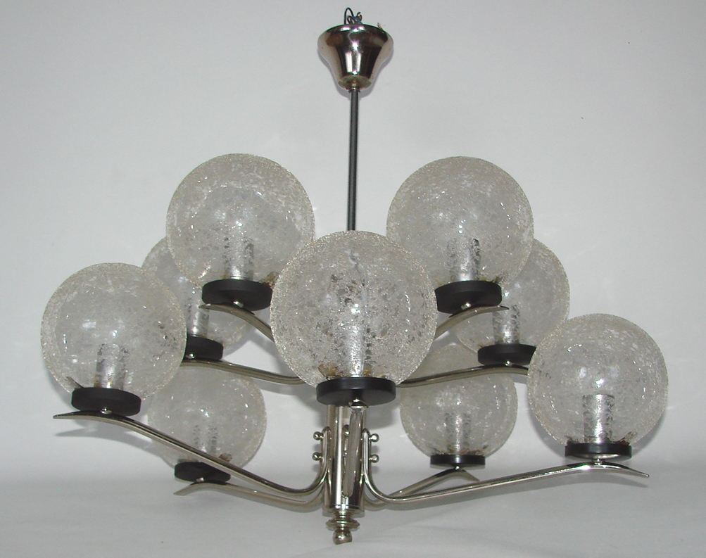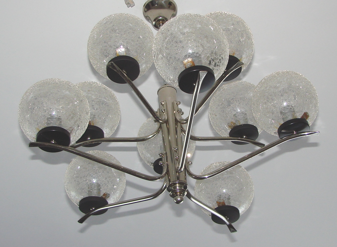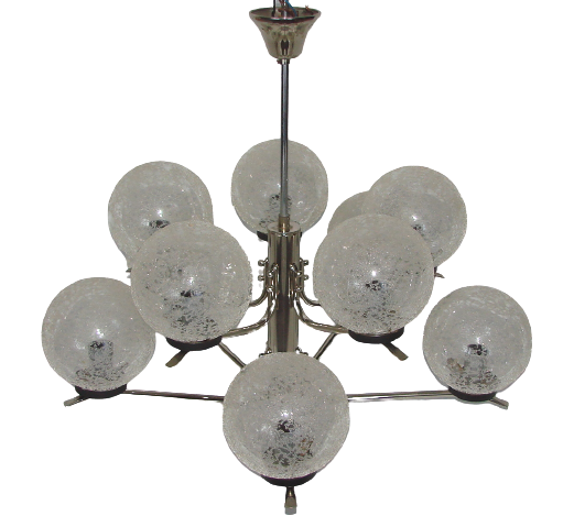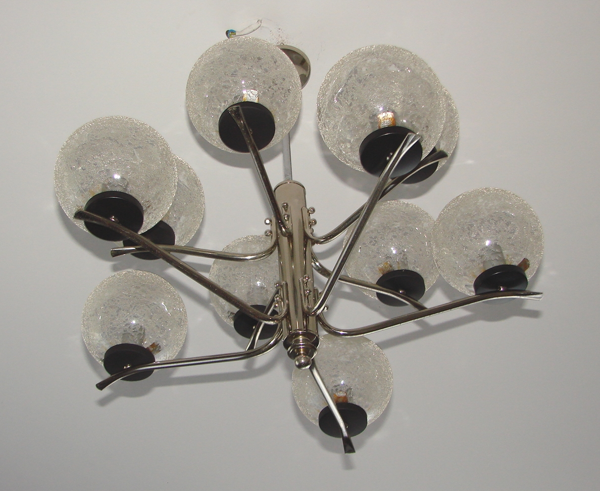 Oryginalny żyrandol w stylu Modern, pochodzący z lat 70. XX wieku. Charakterystyczna, geometryczna forma oraz połączenie chromowanej stali i szkła doskonale oddają estetykę epoki i nadają wnętrzu wyrazisty, designerski charakter.
