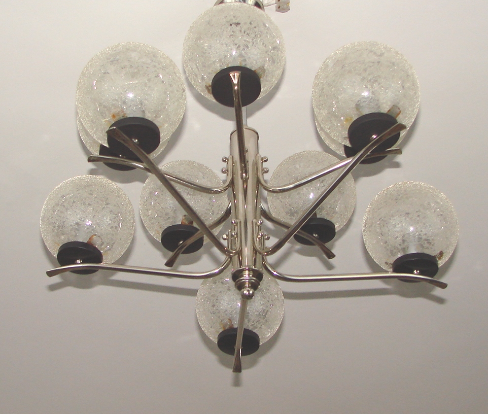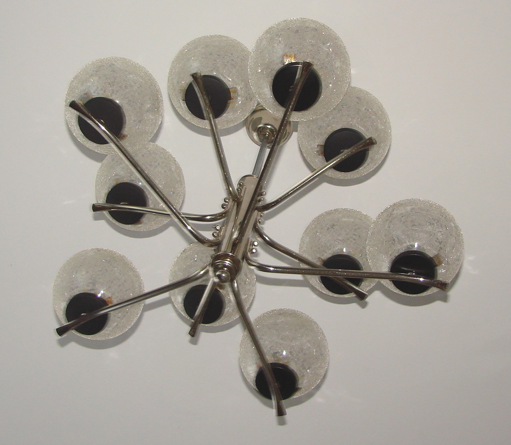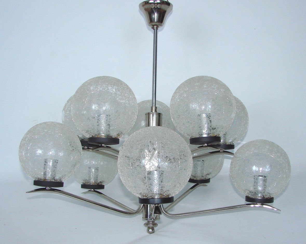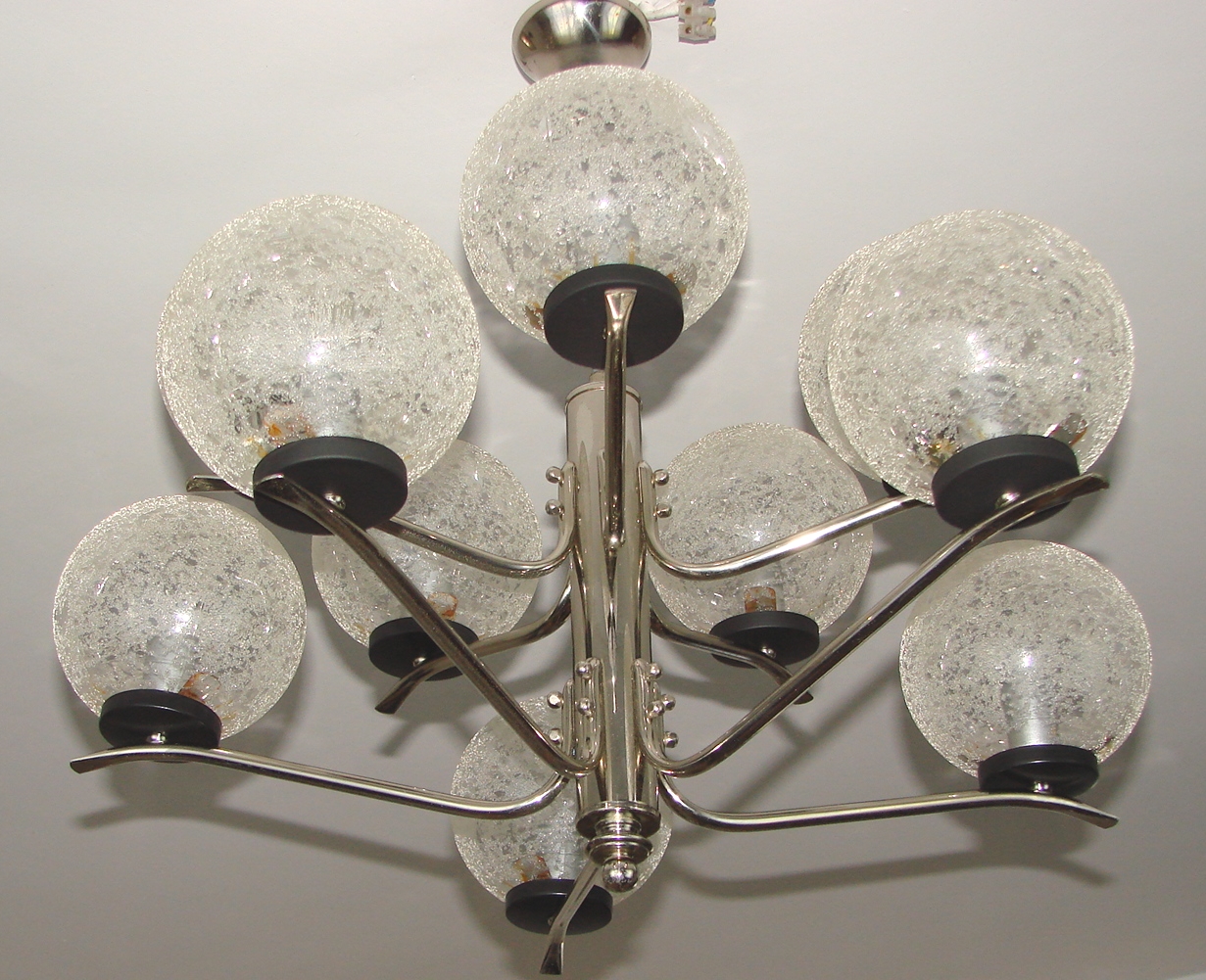 Oryginalny żyrandol w stylu Modern, pochodzący z lat 70. XX wieku. Charakterystyczna, geometryczna forma oraz połączenie chromowanej stali i szkła doskonale oddają estetykę epoki i nadają wnętrzu wyrazisty, designerski charakter.