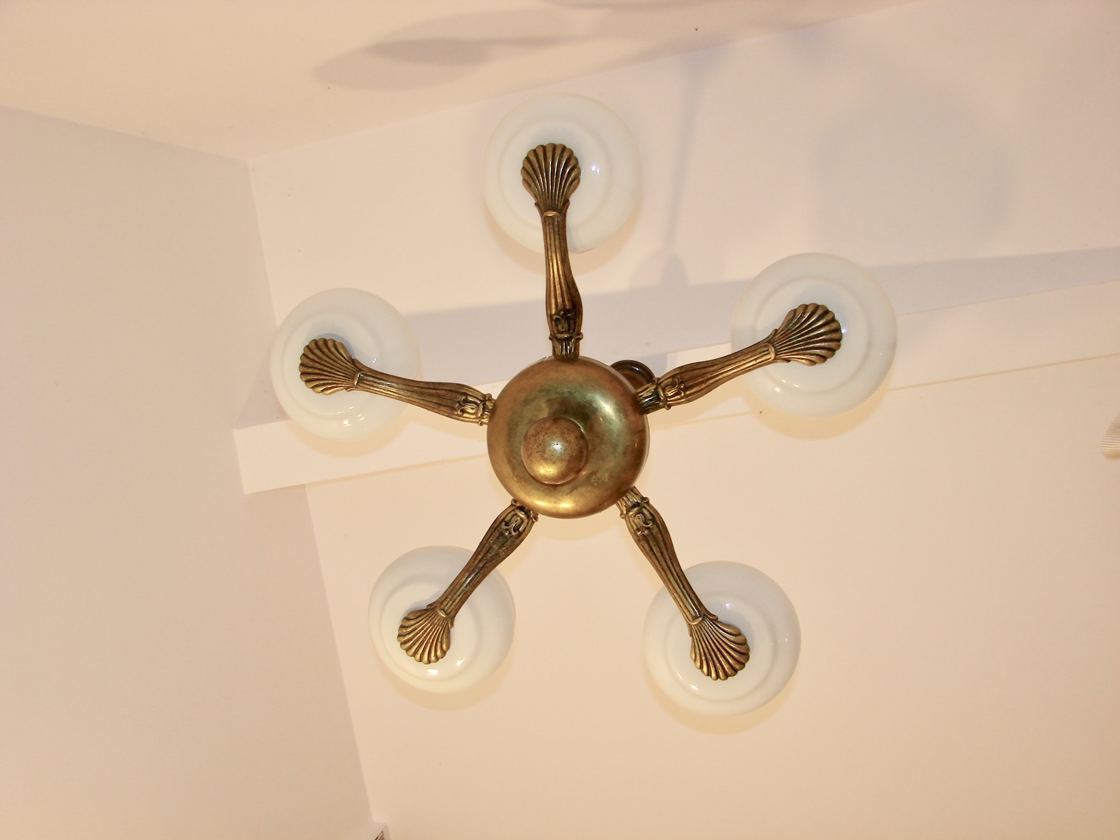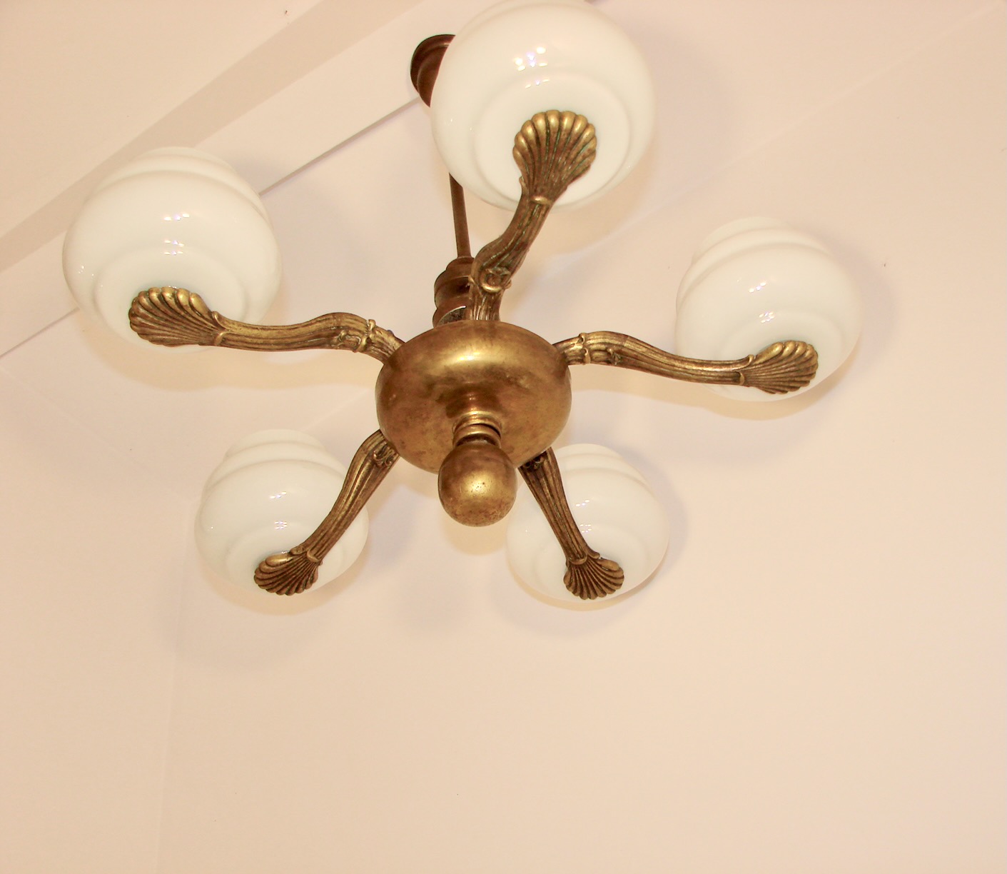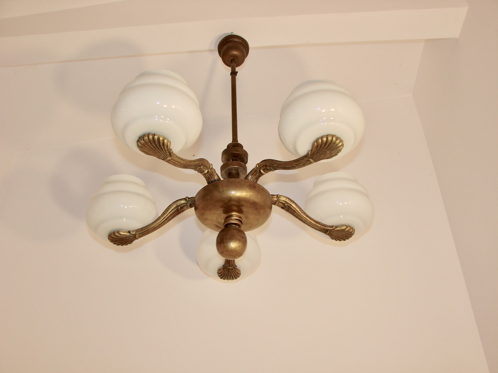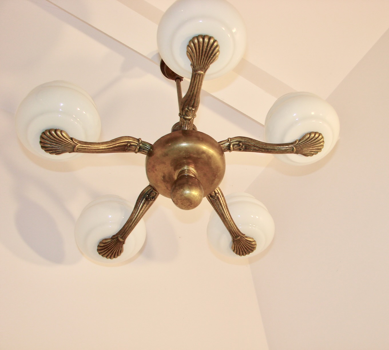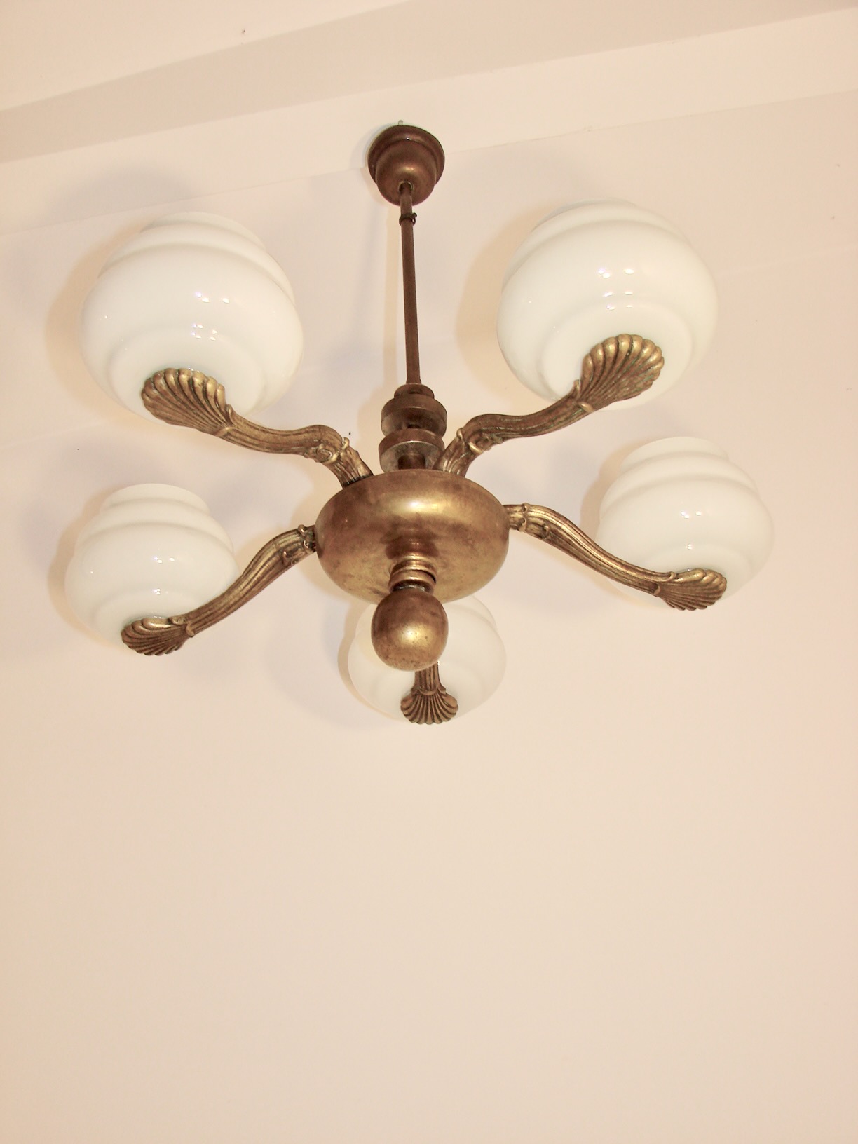 Żyrandol zachowany jest w oryginalnym, dobrym stanie – z naturalną patyną, typową dla wieku przedmiotu.