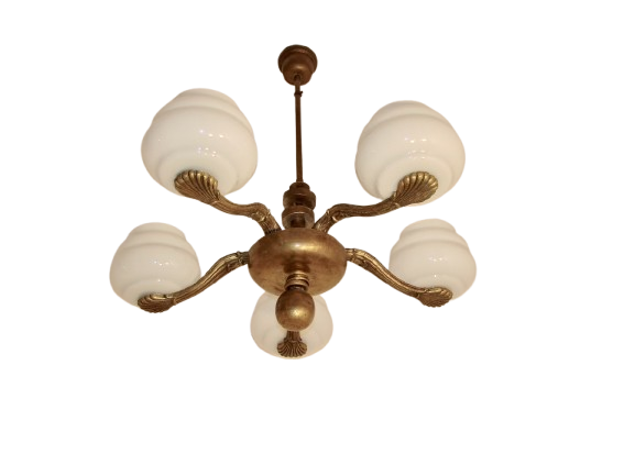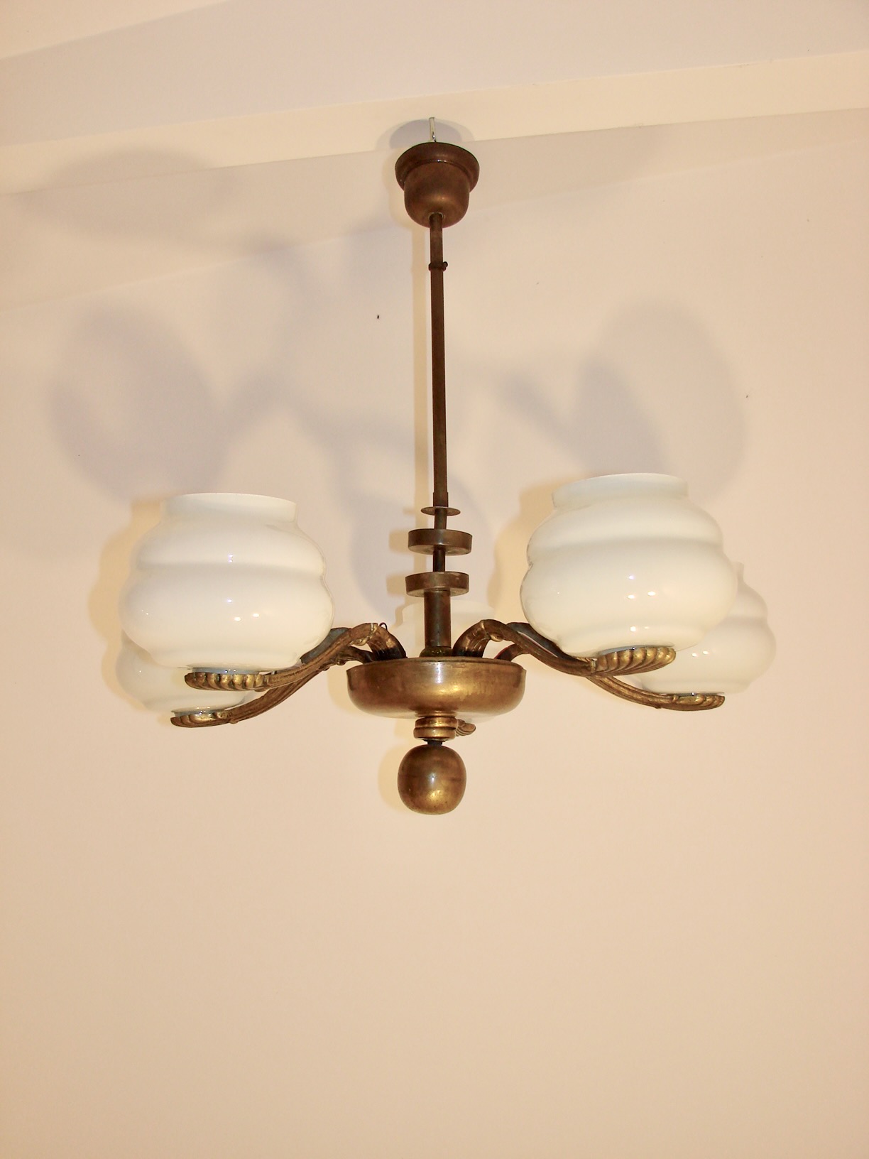 Oferowany żyrandol z lat 30–40 to wyjątkowy przykład rzemiosła tamtego okresu, wykonany z mosiądzu i szkła.