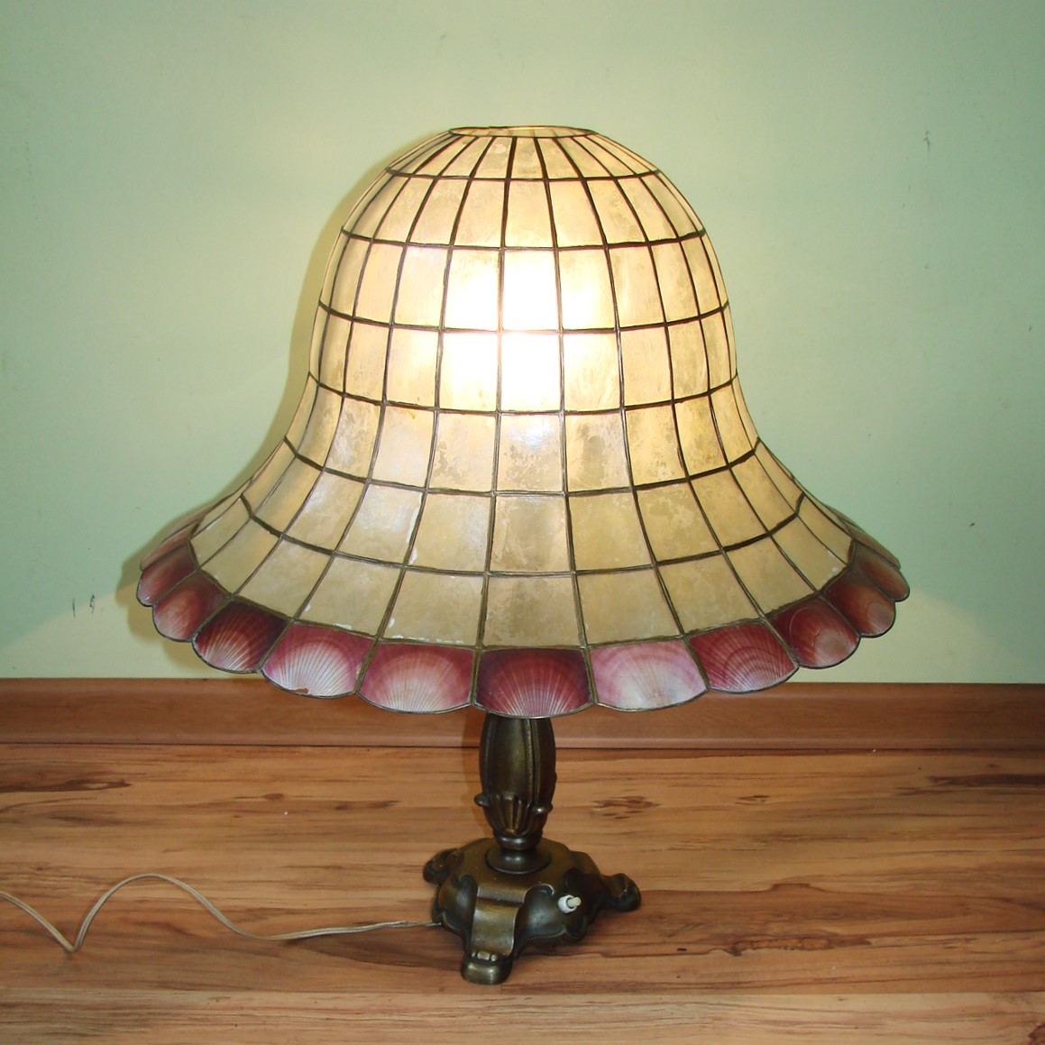 Dekoracyjna lampa stołowa z lat 50., utrzymana w stylu secesyjnym. Wykonana z mosiądzu, z efektownym kloszem z masy perłowej. Wymaga żarówki E27 (brak w zestawie).