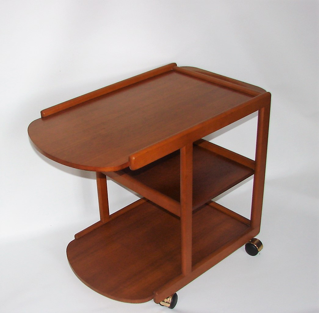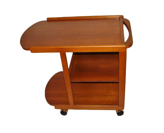 Oryginalny mobilny barek z lat 70., wykonany z drewna bukowego i tekowego. Charakterystyczna dla epoki prosta, funkcjonalna forma oraz ciepły odcień drewna sprawiają, że mebel doskonale wpisuje się w stylistykę mid-century modern.