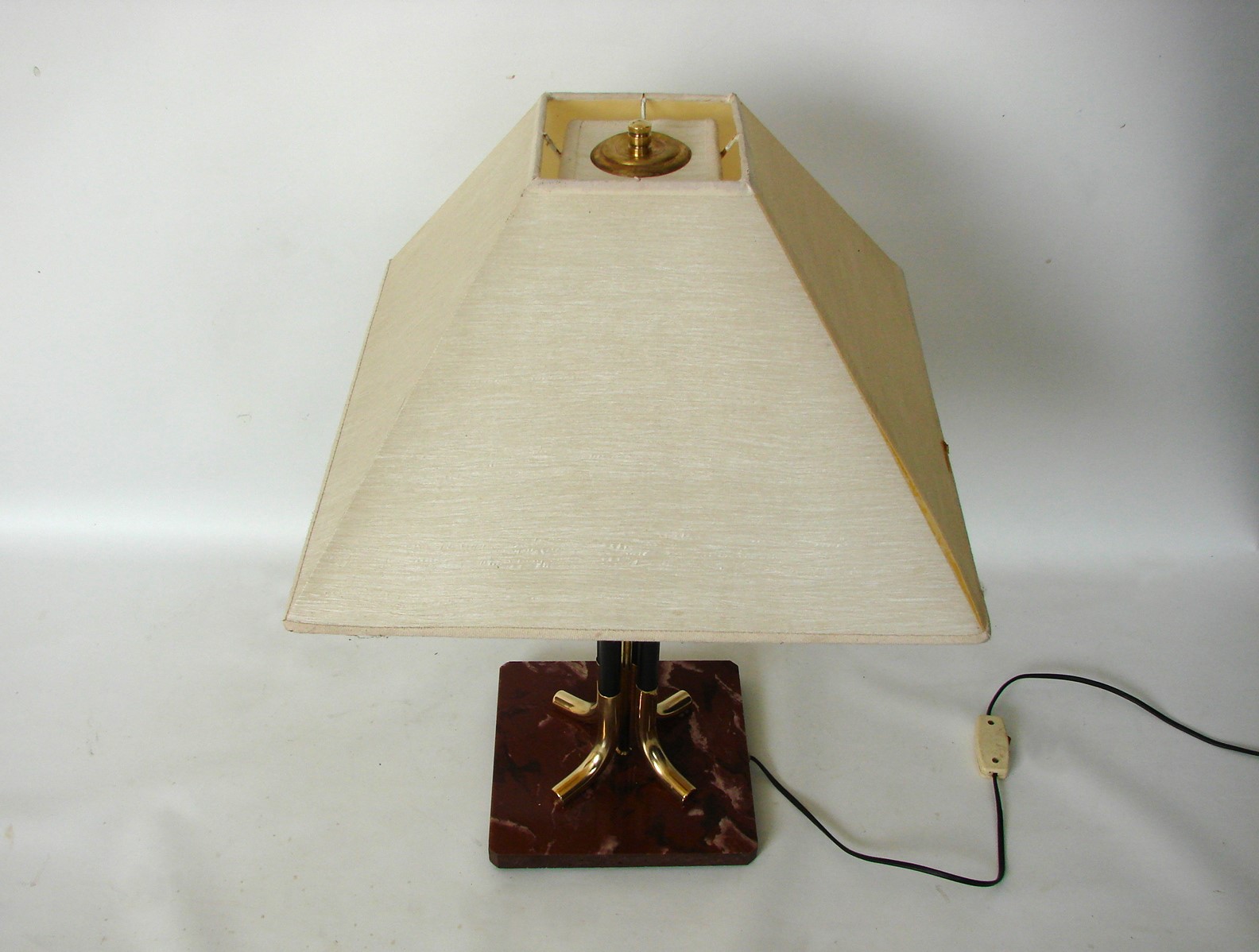 Minimalistyczna lampa stołowa z lat 70. w modernistycznym stylu. Wykonana z marmuru, mosiądzu i tworzywa, łączy szlachetne materiały z elegancką formą. Wyposażona w dwie oprawki E27 (brak żarówek w zestawie).