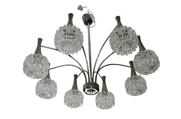 Stylowy, modernistyczny żyrandol pochodzący z lat 70., utrzymany w eleganckiej, geometrycznej formie. Konstrukcja wykonana została ze stali niklowanej, co nadaje jej połysk i odporność, a masywne klosze z grubego szkła zapewniają efektowne rozproszenie światła.